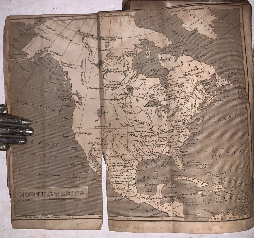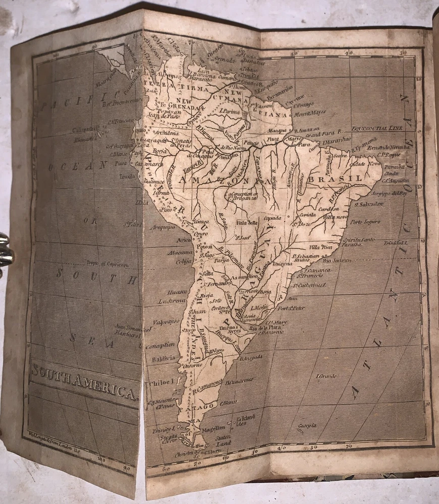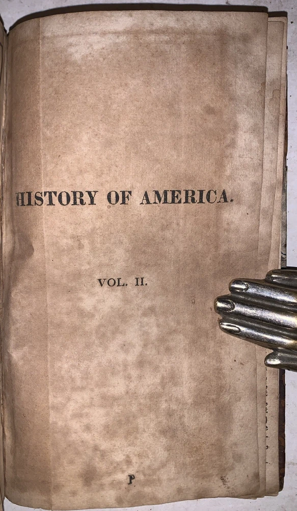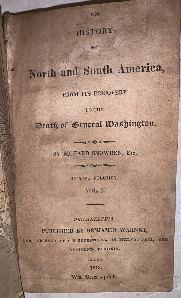 The History of North and South America, From Its Dicovery to the Death of General Washington by Richard Snowden, Esq In Two Volumes (Bound in one) Philadelphia: Benjamin Warner 1818 12mo, 167, 132 pages, period quarter leather over marbled boards. Illustrated with both fold-out maps. Top board detached, rear hinge cracked, damage to spine, a few detached pages, a few tears, some discoloration, soiling and foxing, previous owner's inscription, some rubbing and wear, else in good condition. If you have any questions, feel free to ask, and don't forget to check out my other listings.