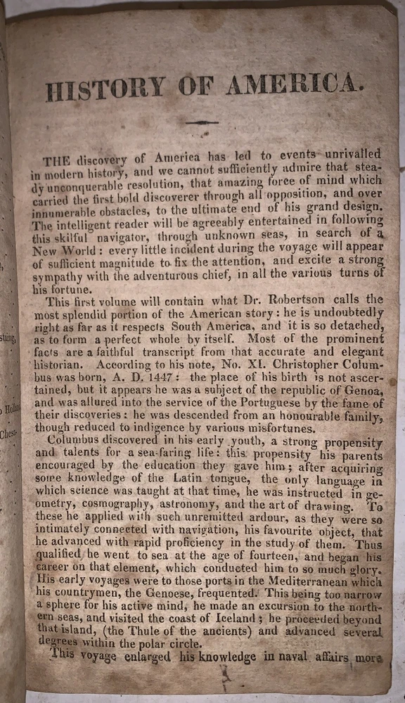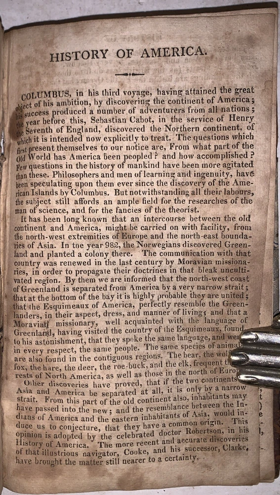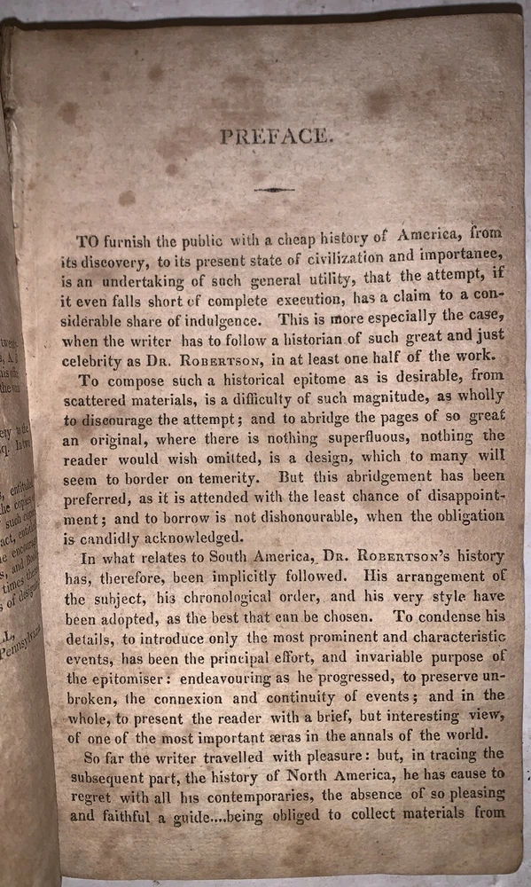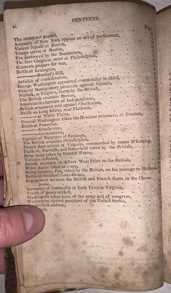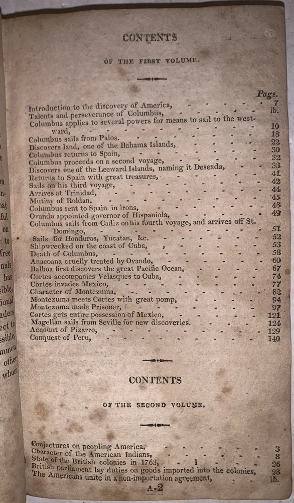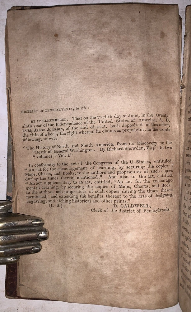 The History of North and South America, From Its Dicovery to the Death of General Washington by Richard Snowden, Esq In Two Volumes (Bound in one) Philadelphia: Benjamin Warner 1818 12mo, 167, 132 pages, period quarter leather over marbled boards. Illustrated with both fold-out maps. Top board detached, rear hinge cracked, damage to spine, a few detached pages, a few tears, some discoloration, soiling and foxing, previous owner's inscription, some rubbing and wear, else in good condition. If you have any questions, feel free to ask, and don't forget to check out my other listings.