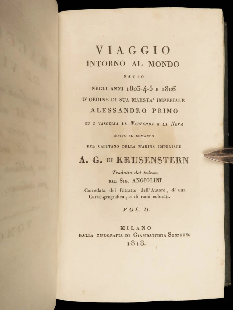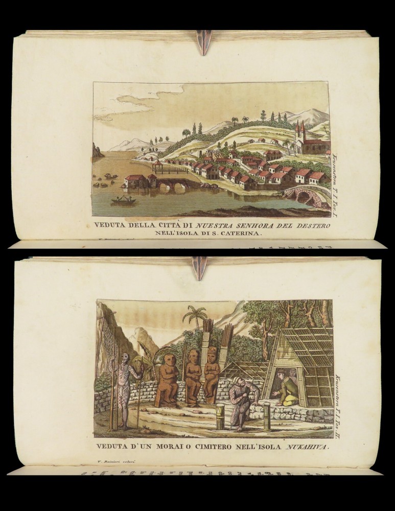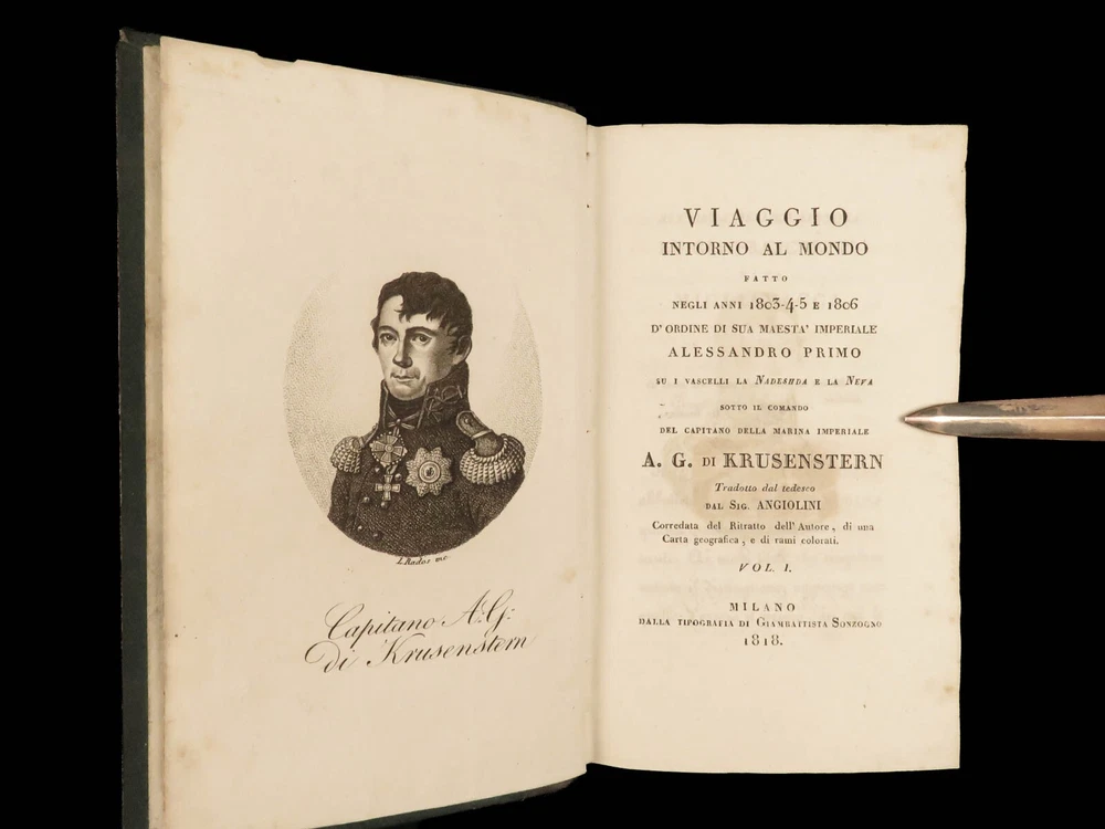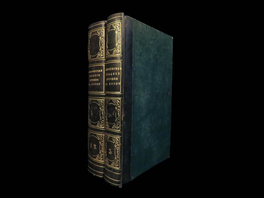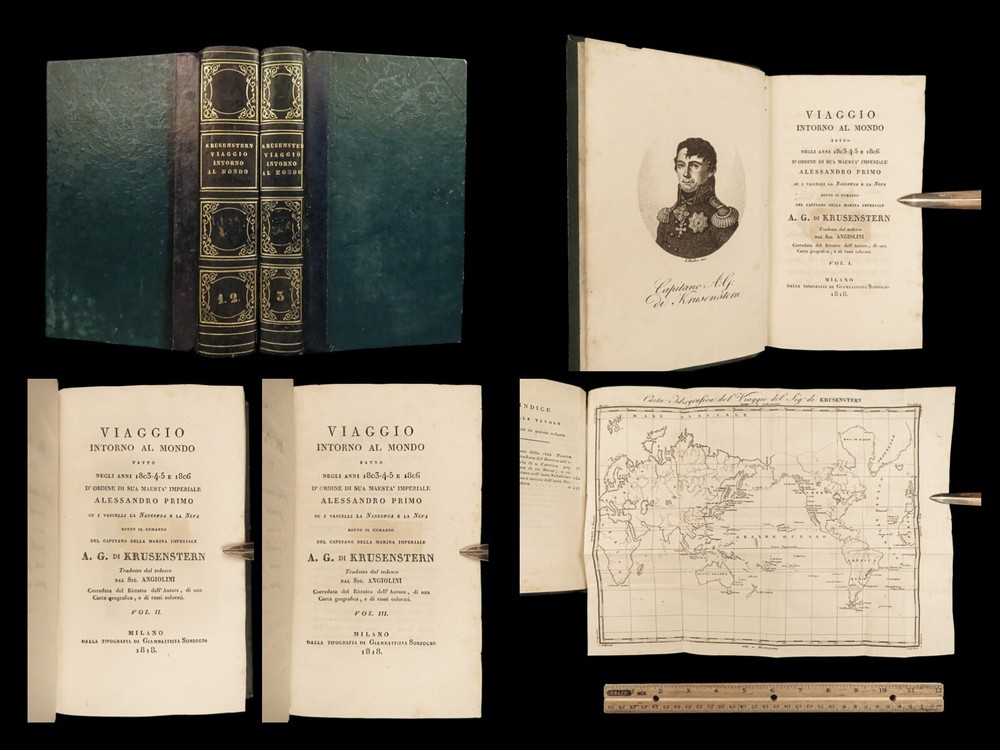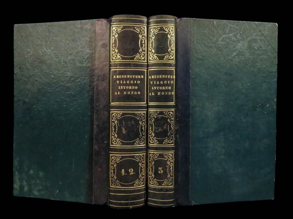 1818 RUSSIA 1 ed Voyages of Ivan Krusenstern Fedorovich Pacific Ocean Science MAP Adam Johann Krusenstern (i.e. Ivan Fedorovich) was a 19 th -century Russian explorer best remembered for being the first Russian to voyage around the world . Beginning in 1803, Krusenstern set sail at the command of Tsar Alexander I to voyage around the world with the purpose of gaining geographical and scientific knowledge. While the voyage itself was important, it was the report that followed that was Krusenstern’s lasting legacy. It proved to be one of the best descriptions of the Pacific and the tribes of the Pacific Islands. This highly desirable first Italian edition of Kruzenstern’s voyage report contains impressive, hand-colored illustrations of Pacific tribal natives as well as a huge folding map of the world! Item number: #22988 Price: $599 KRUZENSTERN, Adam Johann (i.e. Ivan Fedorovich) Viaggio intorno al mondo fatto negli anni 1803-4-5 e 1806 Milano: Dalla Tipografia di Giambaitista Sonzogno, 1818. First edition. Details : · Collation: Complete with all pages; 3 volumes in 2 tomes o Tome 1 § Vol. I – xlvi, 255, [1] § Vol. II – 297, [1] o Tome 2 § Vol. III – 377, [1] o 12 engraved plates (11 in color), plus 1 folding map · Language: Italian · Binding: Leather; tight and secure · Size : ~7in X 4.25in (17.5cm x 10.5cm) Our Guarantee: Very Fast. Very Safe. Free Shipping Worldwide. Customer satisfaction is our priority! Notify us with 7 days of receiving, and we will offer a full refund without reservation! 22988