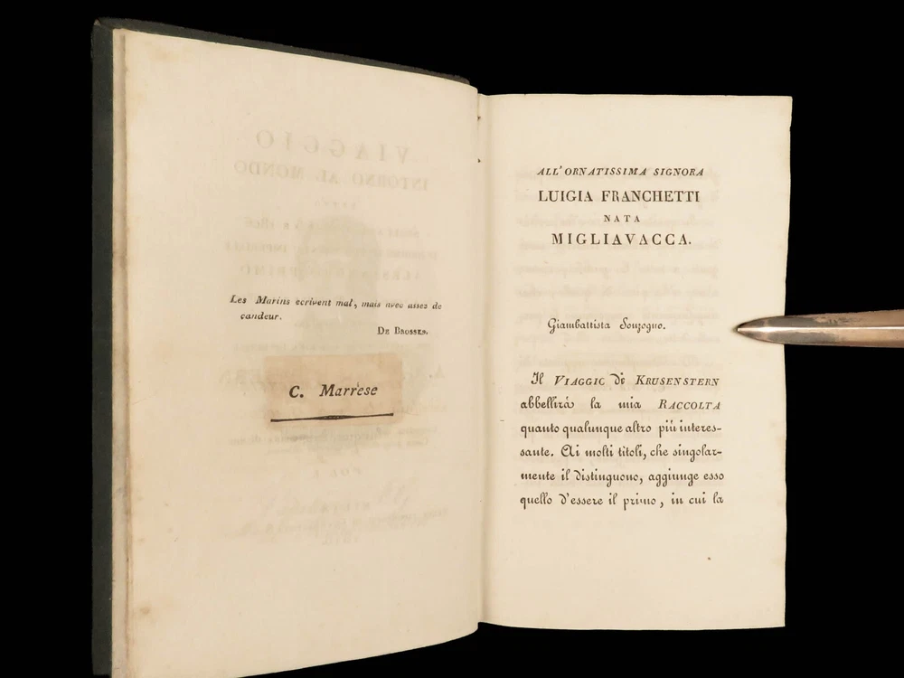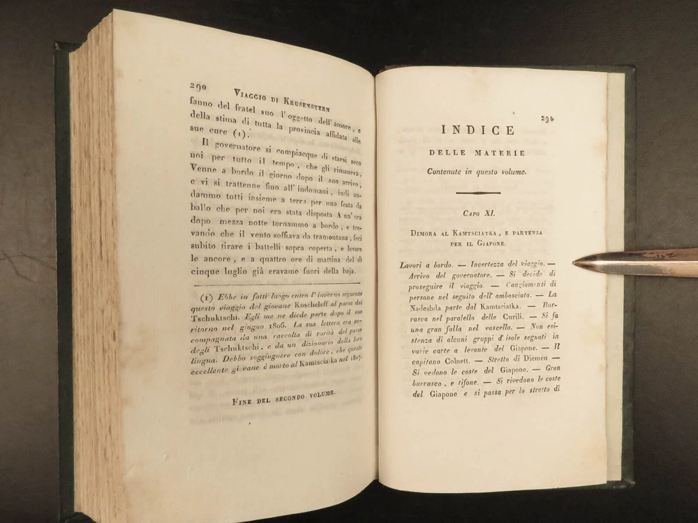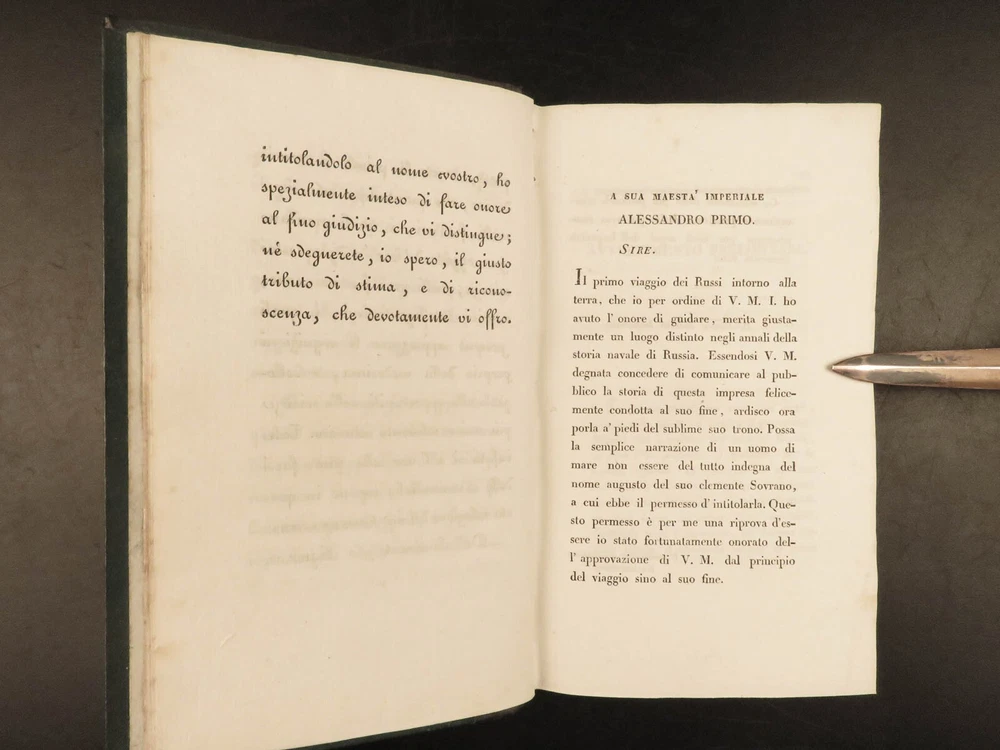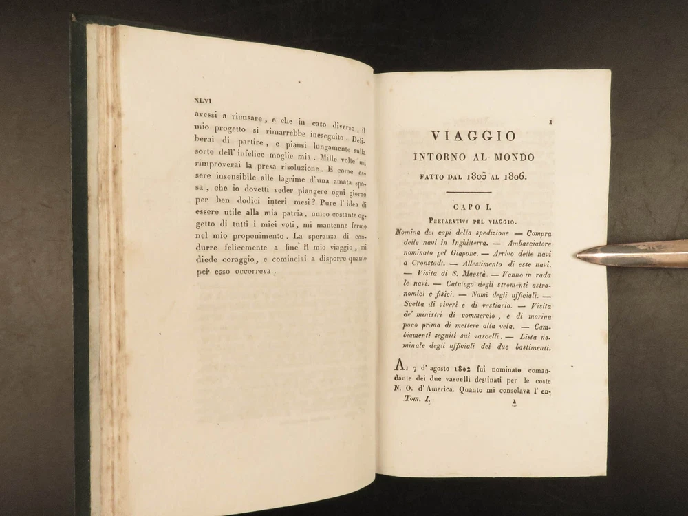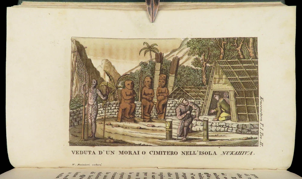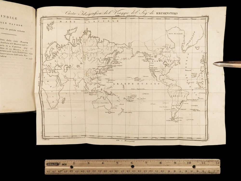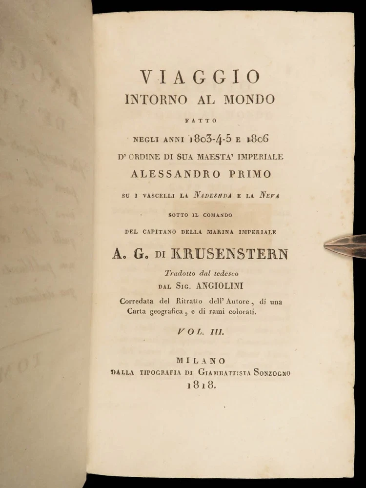 1818 RUSSIA 1 ed Voyages of Ivan Krusenstern Fedorovich Pacific Ocean Science MAP Adam Johann Krusenstern (i.e. Ivan Fedorovich) was a 19 th -century Russian explorer best remembered for being the first Russian to voyage around the world . Beginning in 1803, Krusenstern set sail at the command of Tsar Alexander I to voyage around the world with the purpose of gaining geographical and scientific knowledge. While the voyage itself was important, it was the report that followed that was Krusenstern’s lasting legacy. It proved to be one of the best descriptions of the Pacific and the tribes of the Pacific Islands. This highly desirable first Italian edition of Kruzenstern’s voyage report contains impressive, hand-colored illustrations of Pacific tribal natives as well as a huge folding map of the world! Item number: #22988 Price: $599 KRUZENSTERN, Adam Johann (i.e. Ivan Fedorovich) Viaggio intorno al mondo fatto negli anni 1803-4-5 e 1806 Milano: Dalla Tipografia di Giambaitista Sonzogno, 1818. First edition. Details : · Collation: Complete with all pages; 3 volumes in 2 tomes o Tome 1 § Vol. I – xlvi, 255, [1] § Vol. II – 297, [1] o Tome 2 § Vol. III – 377, [1] o 12 engraved plates (11 in color), plus 1 folding map · Language: Italian · Binding: Leather; tight and secure · Size : ~7in X 4.25in (17.5cm x 10.5cm) Our Guarantee: Very Fast. Very Safe. Free Shipping Worldwide. Customer satisfaction is our priority! Notify us with 7 days of receiving, and we will offer a full refund without reservation! 22988