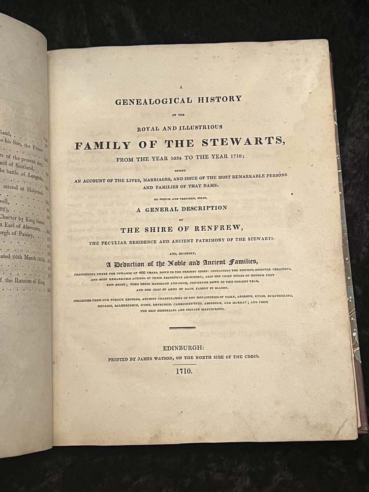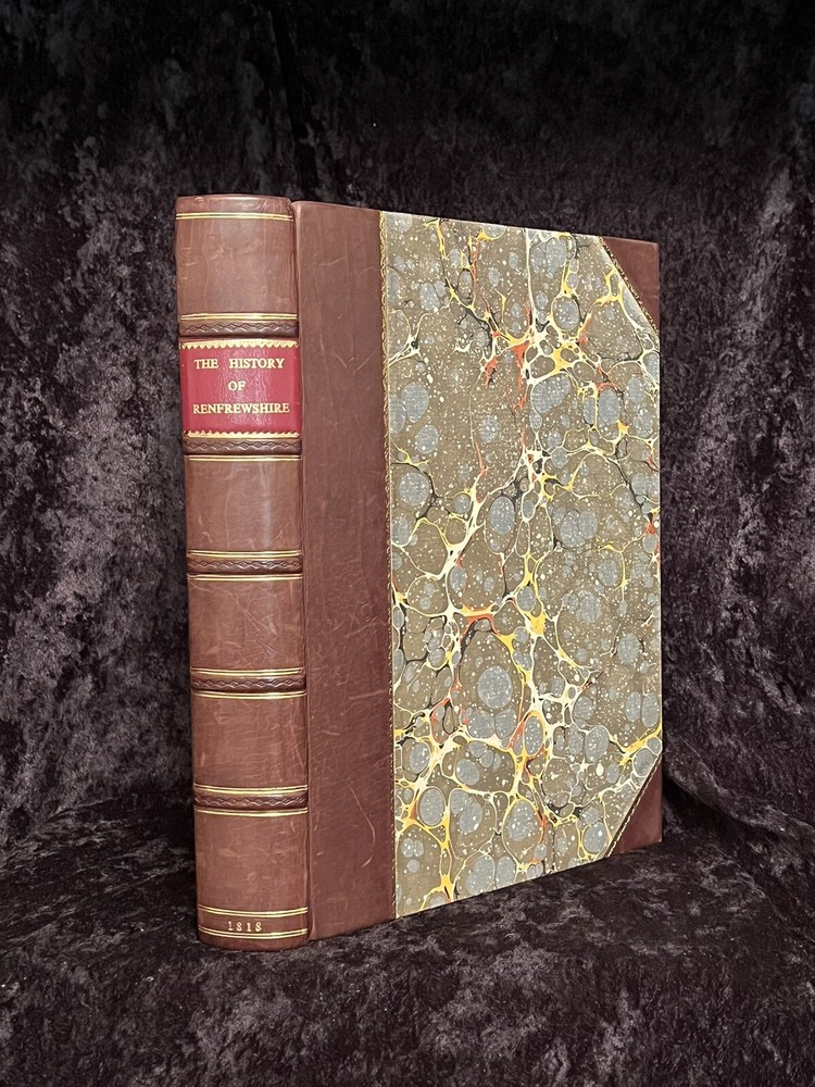 [EARLY PROTESTANT INTEREST; SCOTTISH HISTORY] A GENERAL DESCRIPTION OF THE SHIRE OF RENFREW A Genealogical History of the House of Stewart London, 1818 A GENERAL DESCRIPTION OF THE SHIRE OF RENFREW, INCLUDING AN ACCOUNT OF THE NOBLE AND ANCIENT FAMILIES... . TO WHICH IS ADDED, A GENEALOGICAL HISTORY OF THE ROYAL HOUSE OF STEWART S... BY GEORGE CRAWFURD . PRINTED BY J. NEILSON. SOLD BY I. CRICHTON, BOOKSELLER, PAISLEY, THE PUBLISHEN; JOHN SMITH & SON, GLASGOW; ARCHIBALD CONSTABLE & cO. EDINBURGH; AND REST FENNER, LONDON. 1818. Small Folio [App. 10.5 x 8.5 in.] First edition. Three quarter calf, hand-marbled boards. With five raised bands and red label with gilt to spine. An iconic work detailing the history of Glasgow, Renfrewshire and the House of Stewart. An excellent resource for genealogists (as the roots of multiple Scottish families from the region are herein traced), as well as being the definitive work of Scottish history for this region. An excellent copy. __________ _ _________________________ _ Items listed on eBay are merely representative of our broader inventory. We specialize in early printed works in English, with a particular focus on first editions and significant printings of the Bible in English. Our stock includes a range of Tyndale New Testaments, as well as first editions of the Coverdale Bible (1535), the Matthews Bible (1537), the Great Bible (1539), the Geneva Bible (1560), the Bishops Bible (1568) and the King James Bible (1611). Please do not hesitate to enquire regarding other early printed books and manuscript s.