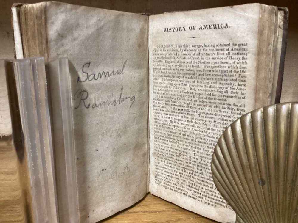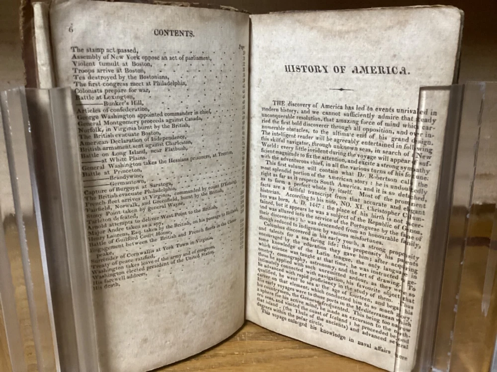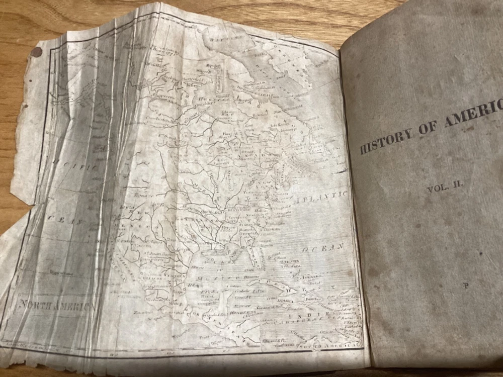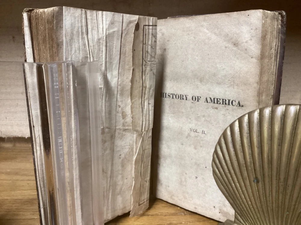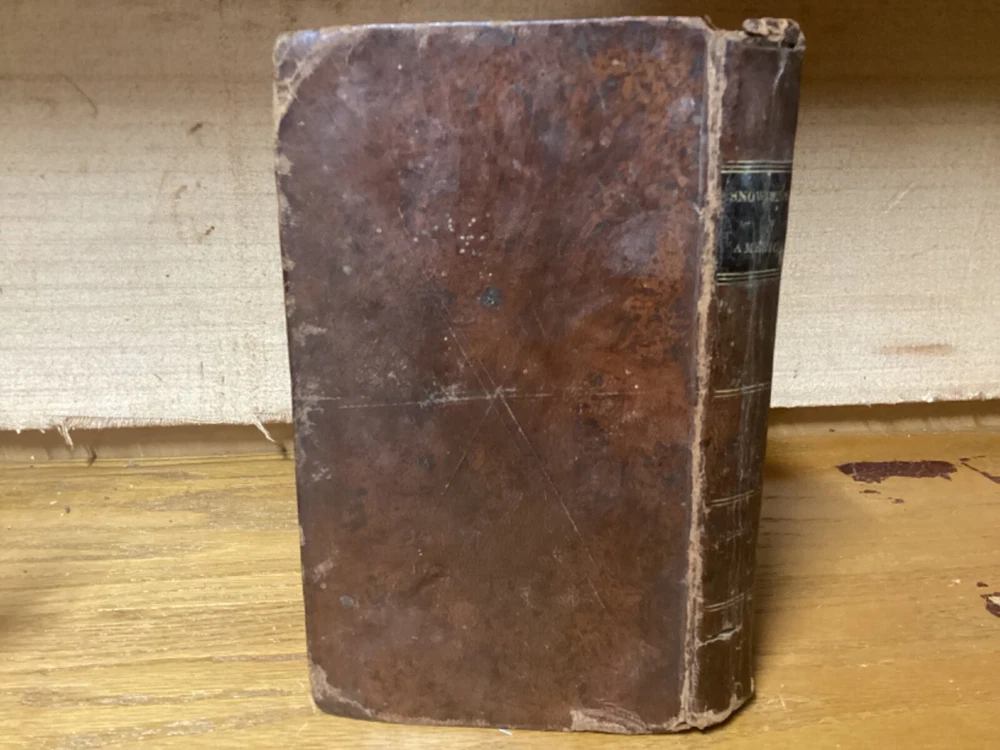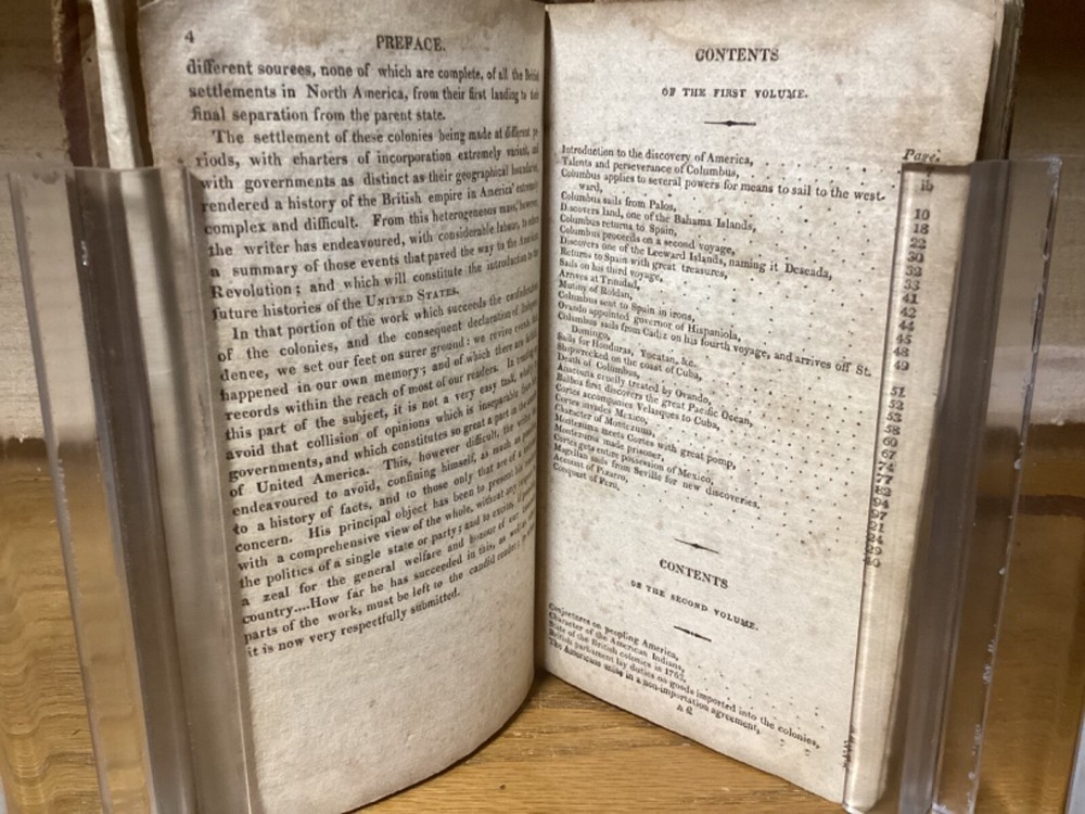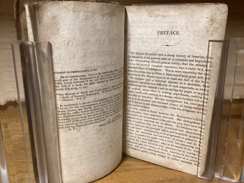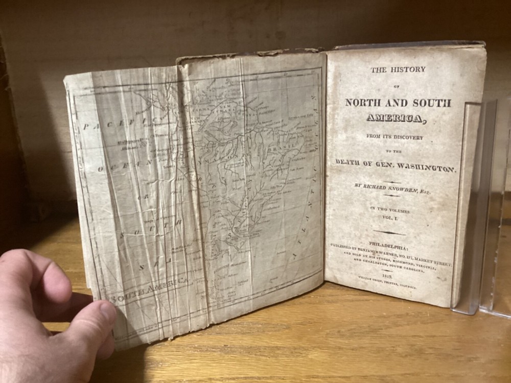 The History of North and South America, from its Discovery to the Death of Gen. Washington. By Richard Snowden and printed in Philadelphia by Benjamin Warner. 1819, 2 volumes in 1, 167 and 132 pp, 8vo, hardcover full leather. In good condition, with superficial rubbing and wear to boards, primarily along edges and corners. Loss and cracking at head and heel of spine. Some cracking to hinges at front and rear. Text block remains bound well. Inscriptions and marginalia at front and back of volume. Includes maps at the start of each volume, with fraying and light tears and losses along edges. Light instances of staining remnants. General age-related toning to pages, along with periodic foxing and wear. Please see photographs and ask any questions prior to purchasing. A scarce volume and early Philadelphia imprint on over 300 years of history of both North and South America. COLT1815BEFW-0524-aj1726