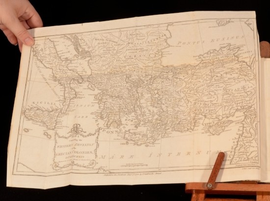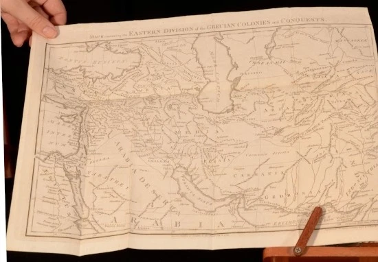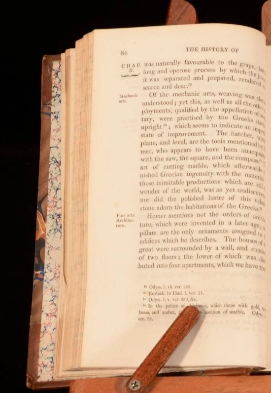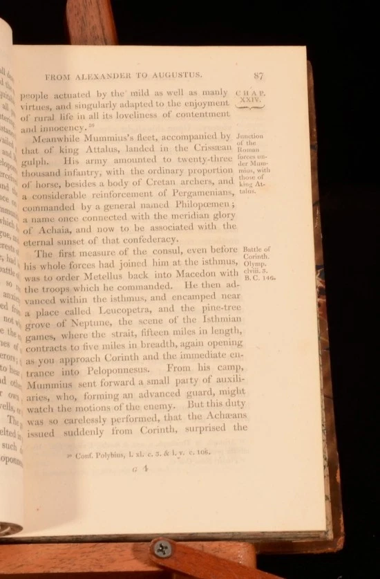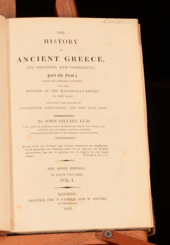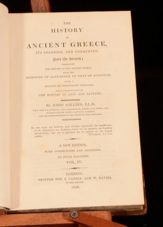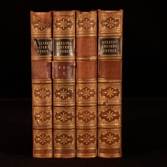 Click here to see our other books! The History of Ancient Greece, Its Colonies, and Conquests Part the First; From the Earliest Accounts Till the Division of the Macedonian Empire in the East Including the Literature, Philosophy and the Fine Arts John Gillies 1820 T. Cadell and W. Davies : London 8" by 5.5" (xii) 515pp.; (viii) 570pp.; (viii) 519pp.; (viii) 631pp SUMMARY A four volume leather set of John Gillies' comprehensive history of Ancient Greece. Folding Maps,Leather Binding Overall Condition: Good This book weighs 4 KG when packed UK Postage: £ 4.49 US Postage: £ 39.99 EU Postage : £ 26.99 European Postage: £ 36.99 Asia Postage: £ 65.99 Worldwide Postage: £ 99.99 DESCRIPTION John Gillies' comprehensive history of Ancient Greece. Sixth edition. Volume I is part of the first four volumes of an eight-volume set, which first appeared in 1786, the latter four of which were the 'New edition, with corrections and additions'. Volumes II, III and IV are part of this later edition. With two folding maps to volume I. Bookplate of Robert Duckle to front pastedowns. Complete in four volumes. CONDITION In half-calf bindings with marbled boards. Externally, sound, though with some rubbing and marks. Volumes I, III, and IV have spine labels missing. The remaining spine labels are lifting in places. Rubbing to the head and tail of the spine, with some slight loss. Ink signatures to the front endpaper of each volume. Five of the joints are starting. Internally, firmly bound. Pages are generally bright and clean, with some scattered instances of foxing. Overall Condition: Good GLOSSARY OF TERMS Overall Condition (Dustwrapper condition rating is shown after that for the book itself, where a dustwrapper is present) Fine - Very well preserved copy showing very little wear Very Good Indeed - Only one or two minor faults, really a very attractive copy Very Good - Quite a wide term meaning no major faults but probably several smaller ones often expected given the age of the book, but still a respectable copy Good - Meaning not very good. Some more serious faults as will be described in the condition report under 'condition' Good Only - Meaning one or more faults that could really do with repair Fair - As with good only above but with other faults leaving a compromised copy even after repair Poor - Really bad and possibly seriously incomplete. We only sell books in this condition where their rarity or value makes them attractive none the less. Major defects will be described. GUARANTEE We offer a full money back guarantee on our descriptions. Please ask for details and conditions. We prefer PAYPAL. If you pay via PAYPAL we will post the item off the same or the next working day with the postage you have selected. Please note we cannot accept USD cheques