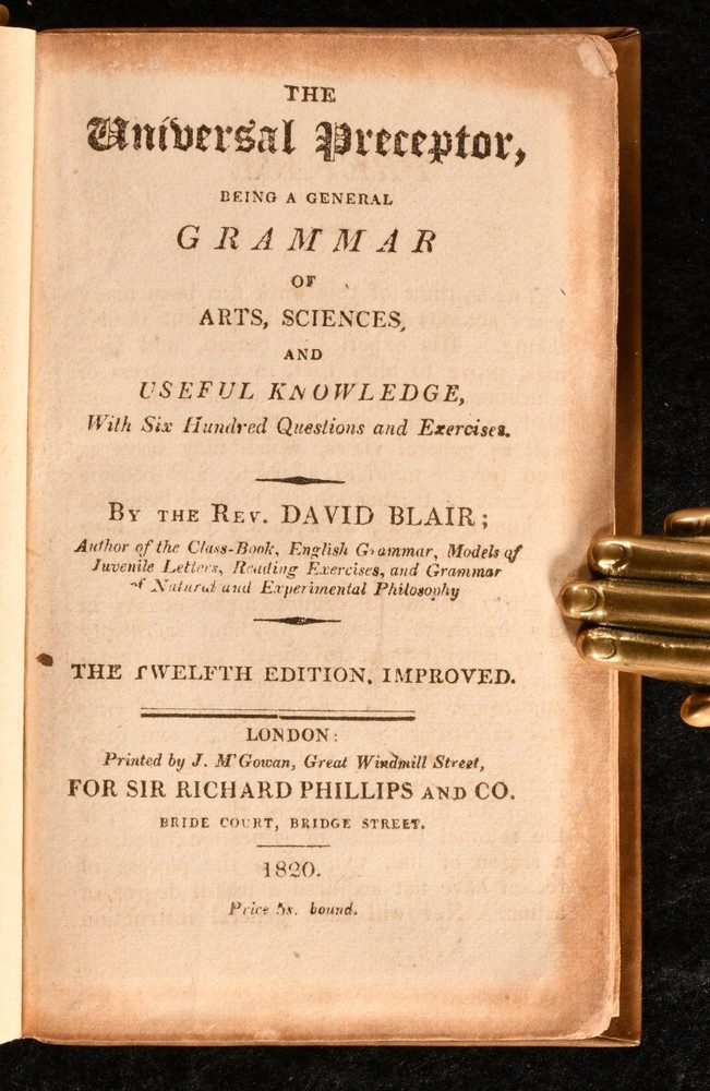 Click here to see our other books! The Universal Preceptor David Blair 1820 Sir Richard Phillips and Co : London 6" by 4.5" [3], iv, [2], 3-364, 4pp SUMMARY A finely bound, pocket sized reference work from the early nineteenth century. Leather Binding,Uncommon Overall Condition: Near Fine This book weighs 0.75 KG when packed UK Postage: £ 3.99 US Postage: £ 19.99 EU Postage : £ 15.99 European Postage: £ 16.99 Asia Postage: £ 21.99 Worldwide Postage: £ 25.99 DESCRIPTION With chapters on grammar, arts, sciences, and many other aspects of 'useful knowledge'. The twelfth edition, improved. An uncommon work. Illustrated, with nine plates total. Written by Rev David Blair, the author of the 'Class-Book', 'English Grammar', 'Juvenile Letters'. CONDITION Rebound, in a full calf binding. Externally, very smart. Externally, fine. Internally, firmly bound. Pages are generally bright. Occasional light spots to pages. Overall Condition: Near Fine GLOSSARY OF TERMS Overall Condition (Dustwrapper condition rating is shown after that for the book itself, where a dustwrapper is present) Fine - Very well preserved copy showing very little wear Very Good Indeed - Only one or two minor faults, really a very attractive copy Very Good - Quite a wide term meaning no major faults but probably several smaller ones often expected given the age of the book, but still a respectable copy Good - Meaning not very good. Some more serious faults as will be described in the condition report under 'condition' Good Only - Meaning one or more faults that could really do with repair Fair - As with good only above but with other faults leaving a compromised copy even after repair Poor - Really bad and possibly seriously incomplete. We only sell books in this condition where their rarity or value makes them attractive none the less. Major defects will be described. GUARANTEE We offer a full money back guarantee on our descriptions. Please ask for details and conditions. We prefer PAYPAL. If you pay via PAYPAL we will post the item off the same or the next working day with the postage you have selected. Please note we cannot accept USD cheques