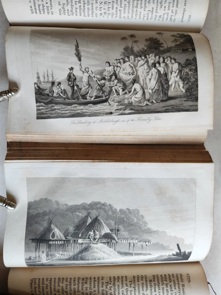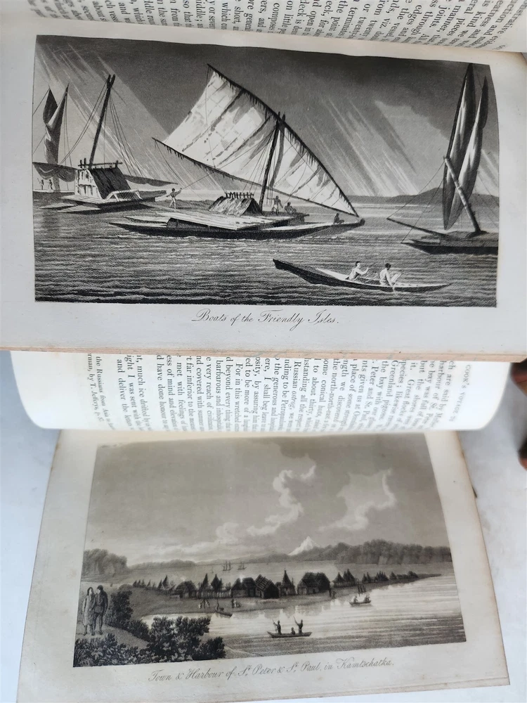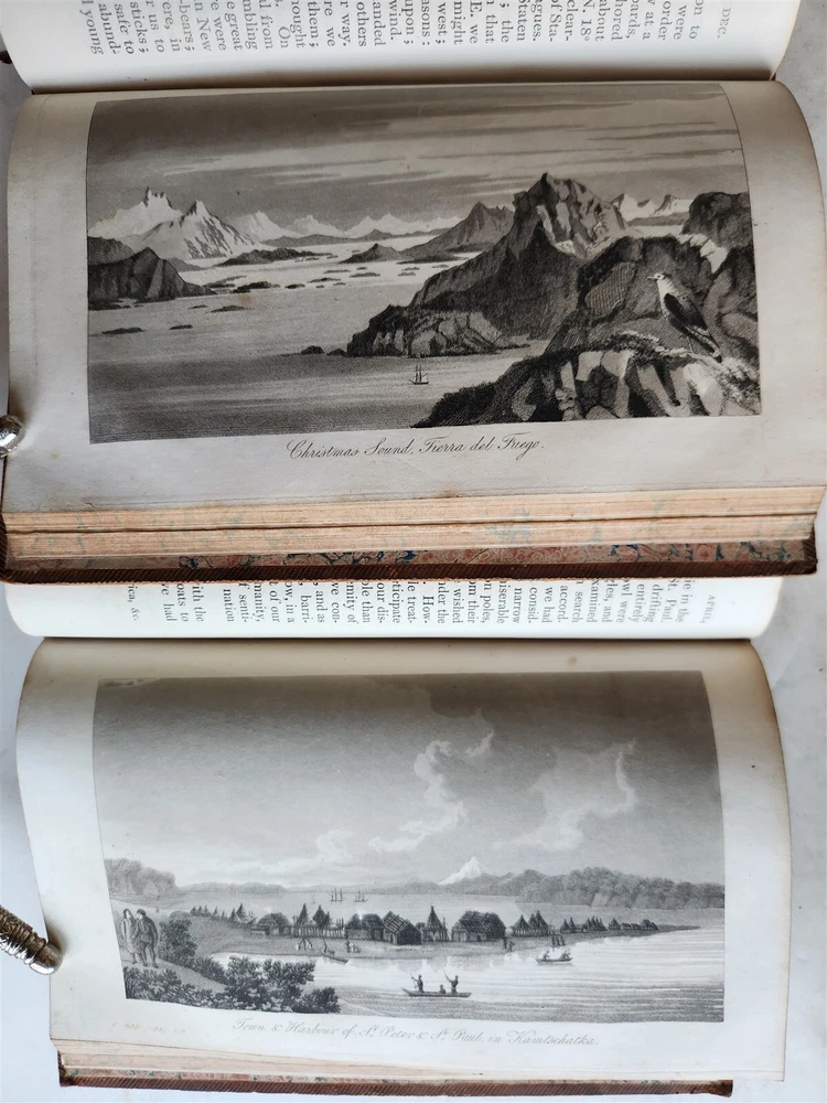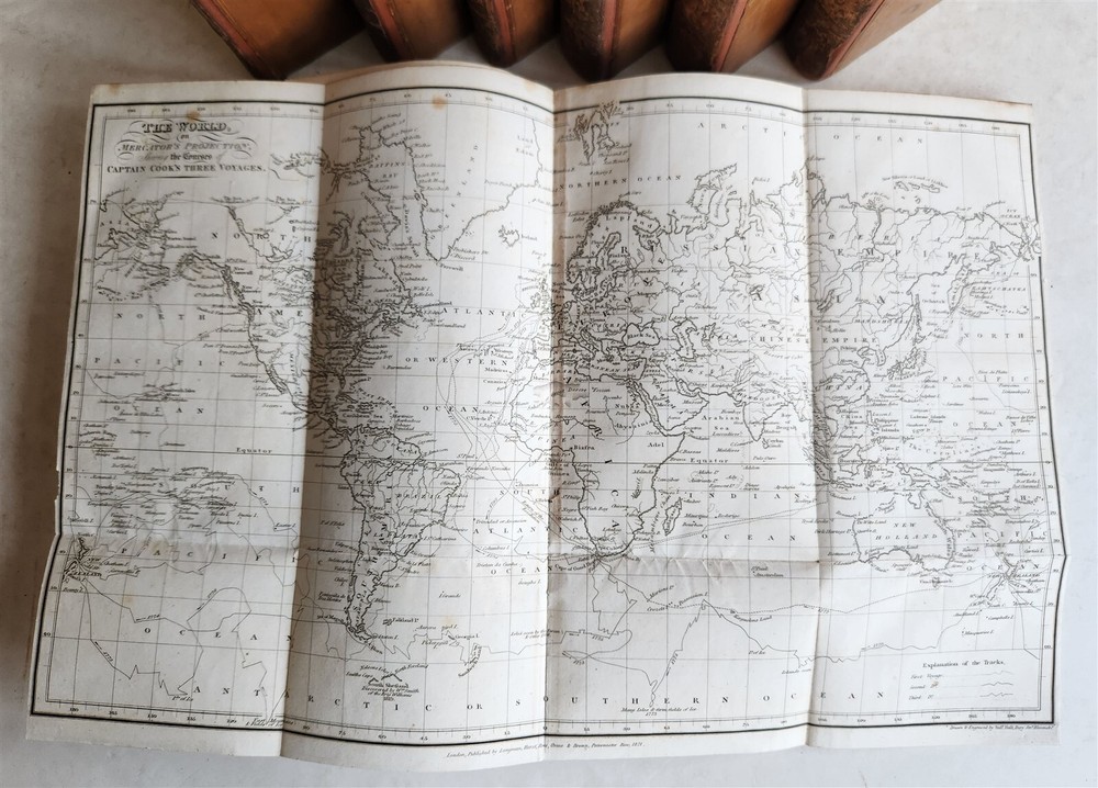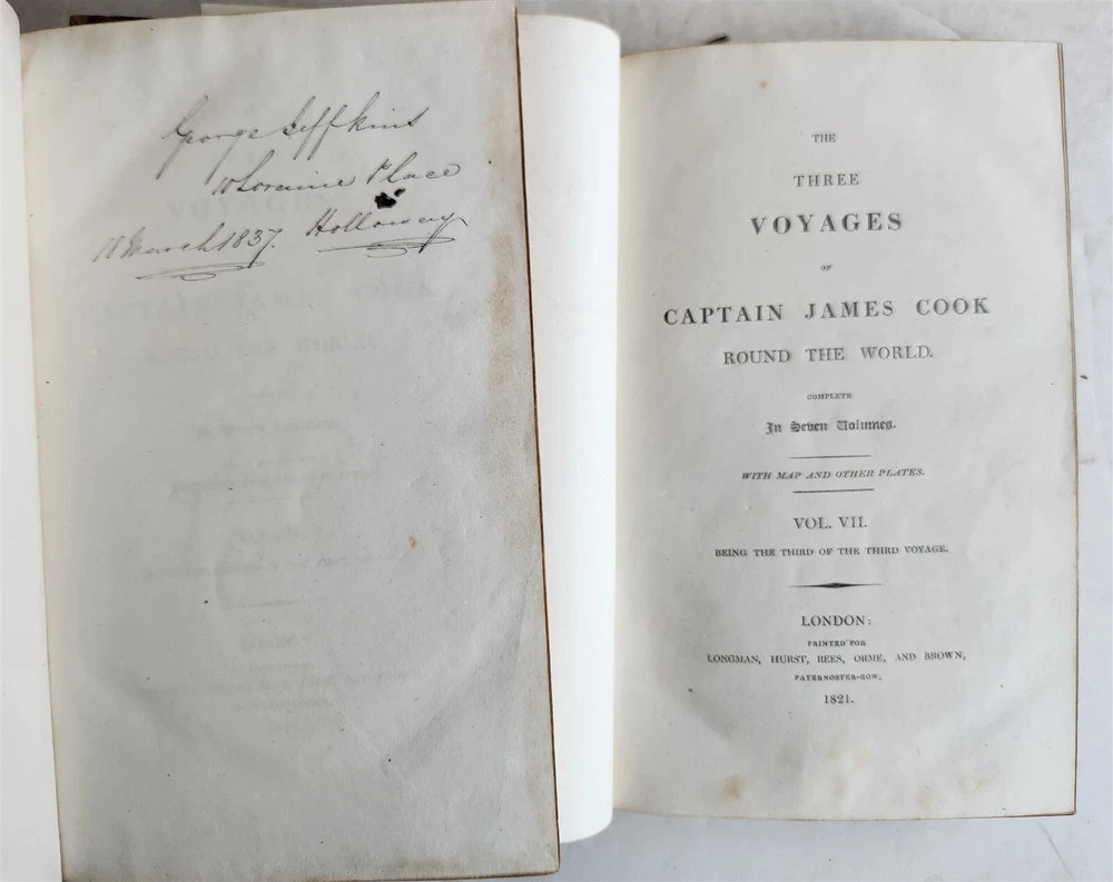 COOK, James THE THREE VOYAGES OF CAPTAIN JAMES COOK Round the World. Complete in Seven Volumes. With Map and Other Plates. Seven volumes London, Longman, Hurst, Rees, Orme, and Brown, 1821 Size 5.5 by 8.5" Illustrated with engraved plates and folding map Original polished calf, rebacked preserving original spines (bit worn), marbled edges and marbled endpapers. A scarce and attractive set: new edition of the full texts of the original published accounts of Cook’s three voyages Very good interior condition Text in French ==================================== Please see my other auctions Thank You Refund Policy: We will issue a FULL REFUND, 100% money back if you are not satisfied with your purchase. Items must be returned to us within 20 days in order to receive a refund or replacement. Buyer is responsible for shipping costs. Powered by SixBit's eCommerce Solution