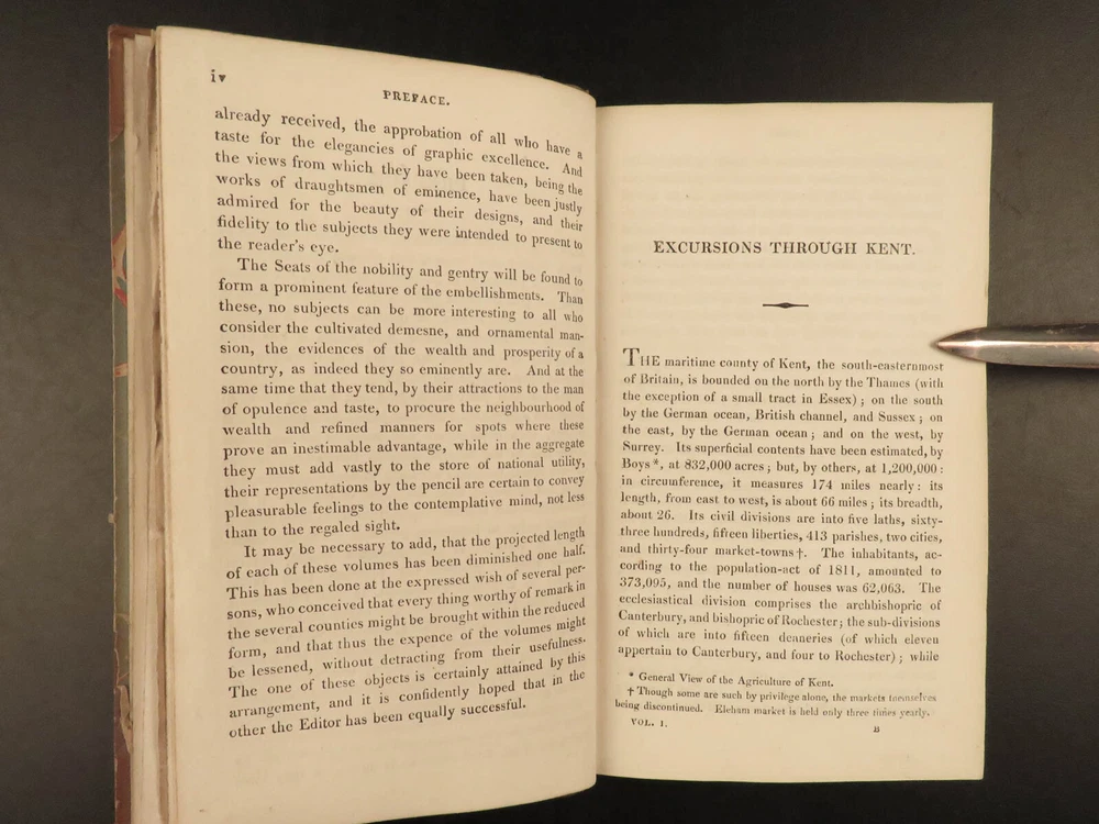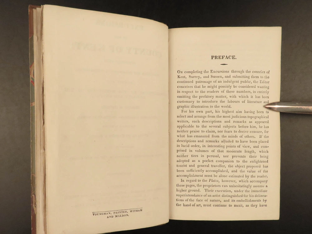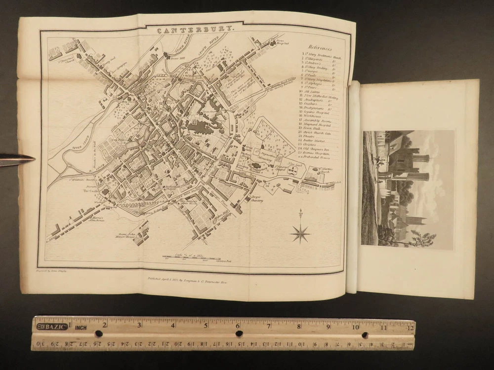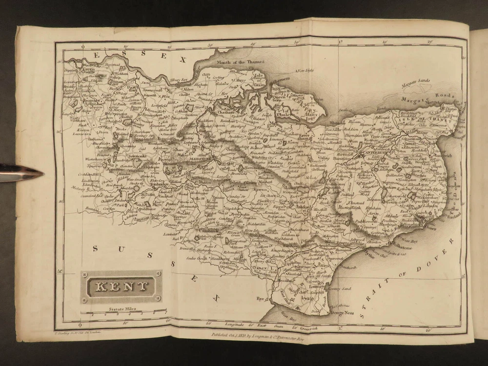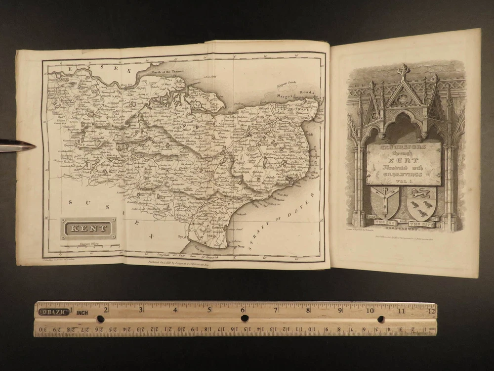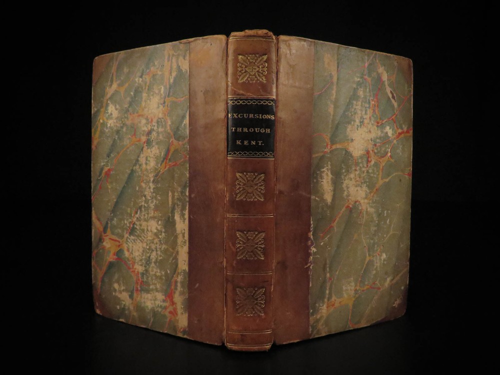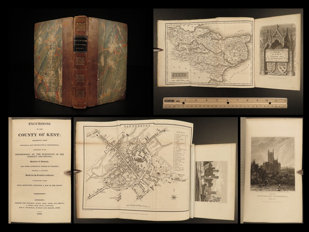 1822 1 ed Excursions in KENT England Castles Cathedrals Illustrated MAPS Canterbury “ Excursions in the Country of Kent ” is a rare, early 19 th -century history of Kent, England. Author Thomas Cromwell offers descriptions of English nobility as well as notes on ancient English ruins, castles, and cathedrals. This 1822 edition contains fifty exquisite engravings including maps of Kent and the city of Canterbury! An impressive work! Item number: #20070 Price: $499 CROMWELL, Thomas Excursions in the county of Kent comprising brief historical and topographical delineations; London: printed for Longman, Hurst, Rees, Orme, and Brown, 1822. Details : · Collation: Complete with all pages o iv, 216, [2] o 46 engravings, plus engraved title page (including 2 folding maps) · Provenance: Handwritten – James Tho s . Mutlow · Language: English · Binding: Leather; tight and secure · Size : ~6.5in X 4in (16.5cm x 10cm) Our Guarantee: Very Fast. Very Safe. Free Shipping Worldwide. Customer satisfaction is our priority! Notify us with 7 days of receiving, and we will offer a full refund without reservation! 20070
