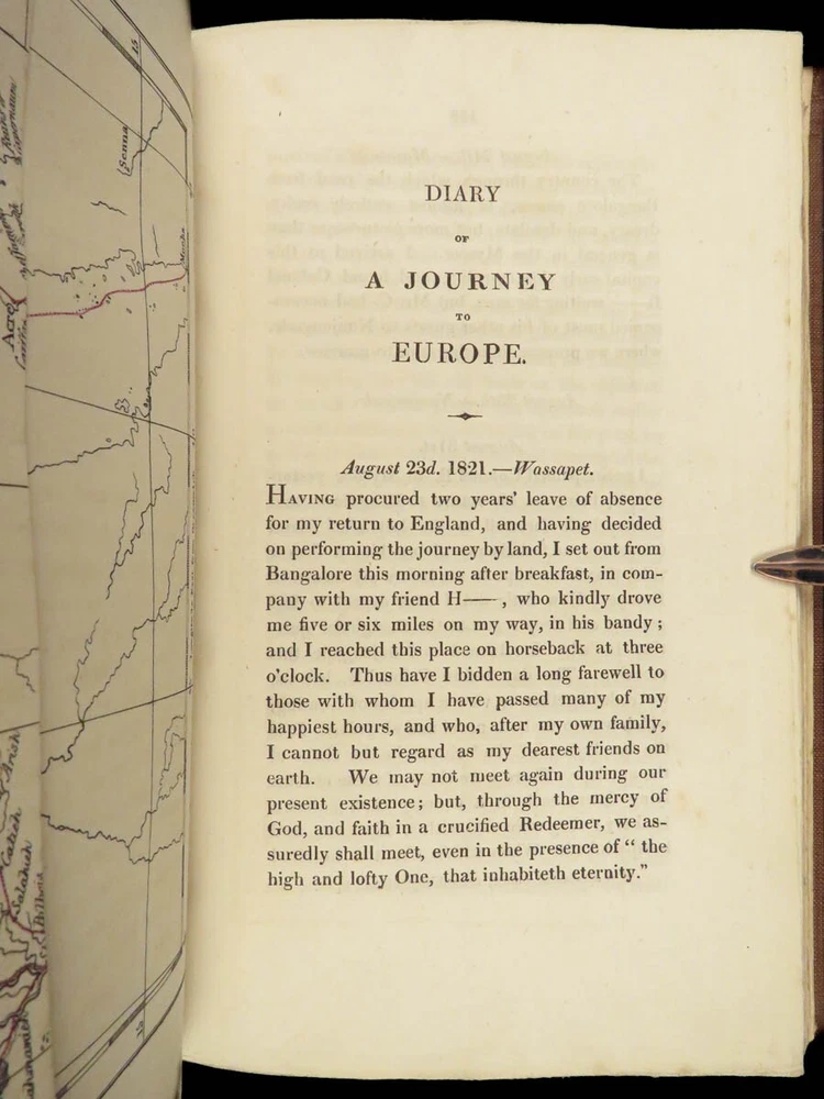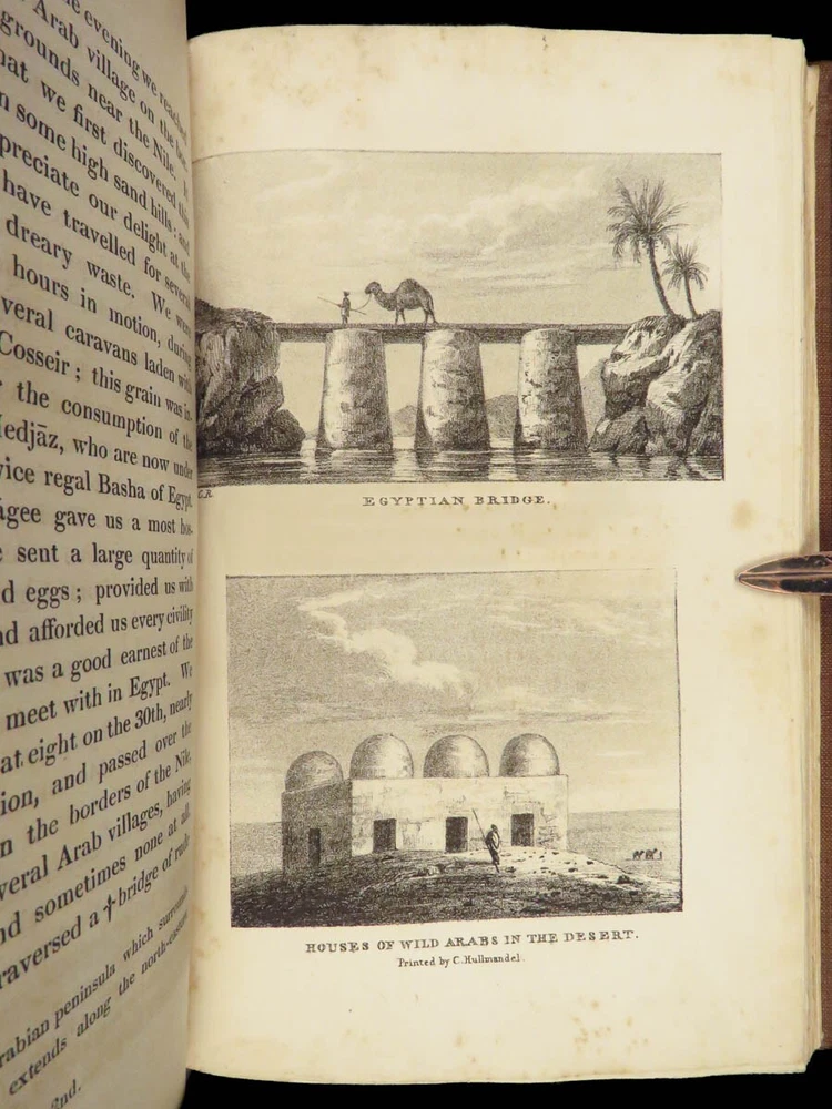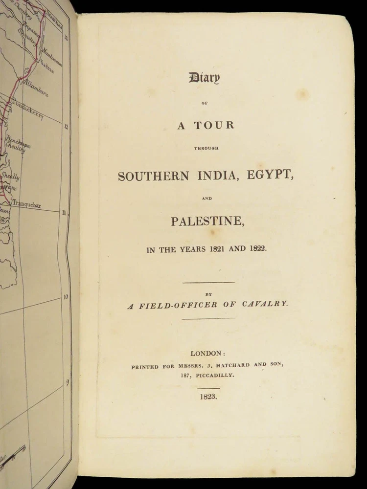 1823 Diary of Tour in EGYPT South INDIA Palestine MAPS Voyages Digby Mackworth Digby Mackworth’s “ Diary of a Tour ” was the English military officer’s travelogue of his voyages in India, Egypt, and Palestine. This journal offers a first hand, yet accurate account of Egypt, Southern India and the Middle East as it was during the early part of the 19 th -century. Mackworth includes impressive illustrations of the things he encountered – bridges, desert homes, and landscapes. Though, without question, the most desirable aspect of this work is the highly coveted folding maps of Southern India and Egypt near the Red Sea. Item number: #24601 Price: $499 MACKWORTH, Digby Diary of a tour through southern India, Egypt, and Palestine, in the years 1821 and 1822 London: Printed for Messrs. J. Hatchard and Son, 1823. 1 st edition Details : · Collation: Complete with all pages o [8], 372 o 2 folding maps o 2 engraved plates · Provenance: Handwritten – [ Valeri Siddall ] · Language: English · Binding: Leather; tight and secure · Size : ~9in X 5.75in (22.5cm x 14.5cm) Our Guarantee: Very Fast. Very Safe. Free Shipping Worldwide. Customer satisfaction is our priority! Notify us with 7 days of receiving, and we will offer a full refund without reservation! 24601