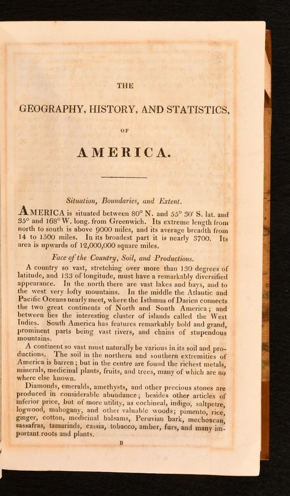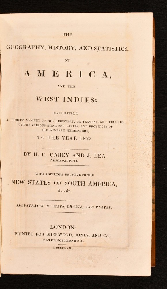 Click here to see our other books! The Geography, History, and Statistics, of America, and the West Indies H. C. Carey; J. Lea 1823 Sherwood, Jones, and Co. : London 8.5" by 5.5" vi, [2], 477pp. SUMMARY The first UK edition of this comprehensive study of America and the West Indies by H. C. Carey and J. Lea, illustrated with folding maps. First Edition,Folding Maps,Leather Binding,Scarce Overall Condition: Near Fine This book weighs 2 KG when packed UK Postage: £ 3.99 US Postage: £ 29.99 EU Postage : £ 21.99 European Postage: £ 23.99 Asia Postage: £ 37.99 Worldwide Postage: £ 38.99 DESCRIPTION The first UK edition. Bound in a very smart half calf with marbled paper-covered boards. Written by Henry Charles Carey, an American publisher and politician, and J. Lea, who were part of the publishing company Lea & Carey. This informative work provides a comprehensive documentation of America and the West Indies, with a focus on the geography, history and statistics. This includes a "correct account of the discovery, settlement and progress of the various kingdoms, states and provinces of the Western hemisphere, to the year 1822". Illustrated with eighteen folding maps, some of which have been hand-coloured. Map entitled 'View of the Havannah' has been bound to p350. Collated, complete. Bound with the half title. CONDITION Bound in half calf with marbled paper-covered boards. Externally, lovely, with slight bumping to the extremities. Endpapers and blanks have been renewed. Internally, firmly bound. Pages generally bright and clean, with the occasional spot or handling mark and a little offsetting from plates. Maps have the odd mark and light wear, but are generally bright. Overall Condition: Near Fine GLOSSARY OF TERMS Overall Condition (Dustwrapper condition rating is shown after that for the book itself, where a dustwrapper is present) Fine - Very well preserved copy showing very little wear Very Good Indeed - Only one or two minor faults, really a very attractive copy Very Good - Quite a wide term meaning no major faults but probably several smaller ones often expected given the age of the book, but still a respectable copy Good - Meaning not very good. Some more serious faults as will be described in the condition report under 'condition' Good Only - Meaning one or more faults that could really do with repair Fair - As with good only above but with other faults leaving a compromised copy even after repair Poor - Really bad and possibly seriously incomplete. We only sell books in this condition where their rarity or value makes them attractive none the less. Major defects will be described. GUARANTEE We offer a full money back guarantee on our descriptions. Please ask for details and conditions. We prefer PAYPAL. If you pay via PAYPAL we will post the item off the same or the next working day with the postage you have selected. Please note we cannot accept USD cheques