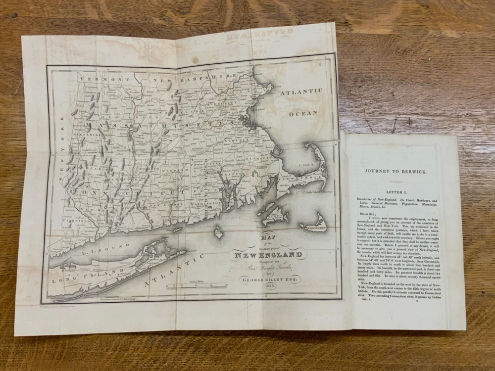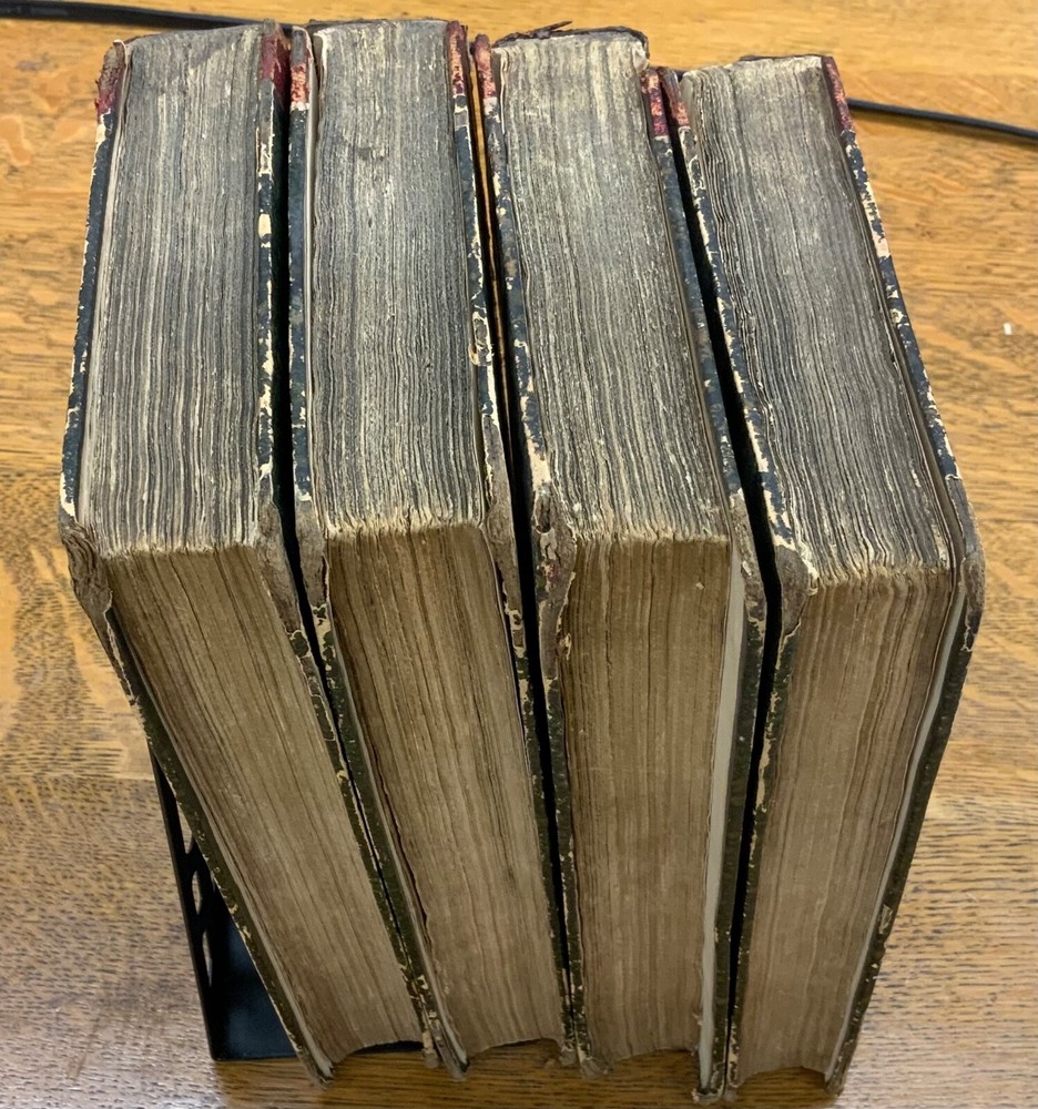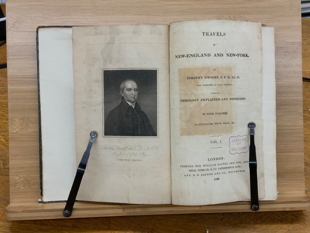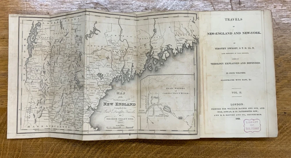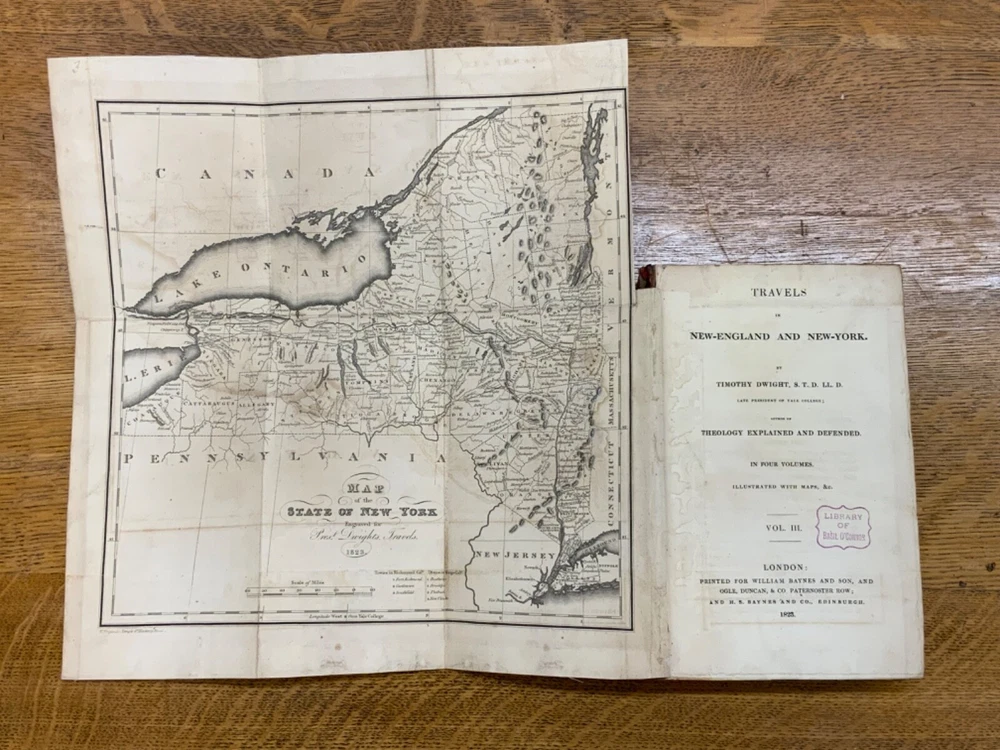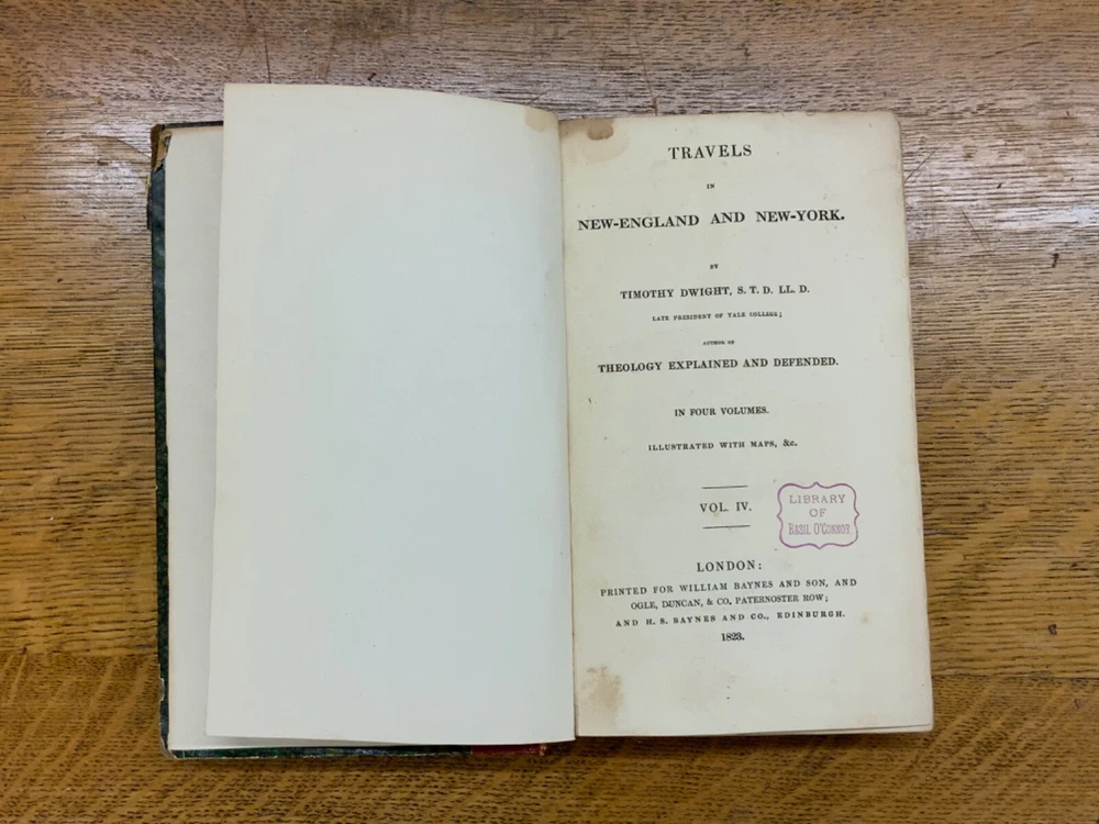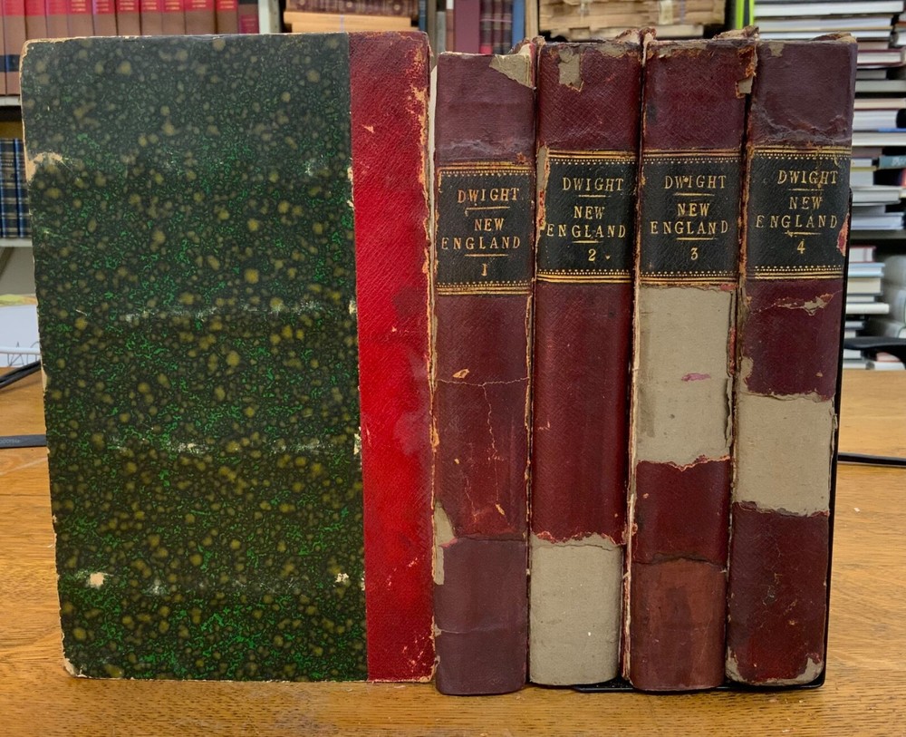 Travels in New-England and New-York. By Timothy Dwight, S.T.D. LL.D., Late President of Yale College; Author of Theology Explained and Defended. In Four Volumes. Illustrated with Maps, &c., Vols. I-IV, London: Printed for William Baynes and Son, 1823, half-leather marbled boards, 483 pp, 504 pp, 514 pp, 514 pp, 9 x 5.5", 8vos. In poor condition. Vols. I-III-s boards are detached from binding. Vols. II-IV exhibit large chips missing from leather spine, however, title label & gilt lettering still bright and clean. Green marbled boards on all volumes are scuffed at edges and worn at corners. Vol. VI's boards are attached by cording only, very fragile. Heads and tails of all spines lacing, binding exposed. Personal library stamp throughout all volumes: Basil O'Connor. Vols. I-III include reinforced fold-out maps. Instances of foxing, toning, off-setting, and age-staining throughout all volumes. No pages missing, all volumes complete. Binding intact, boards detached. Please see photos. Timothy Dwight (1752-1817) was an American academic and educator, Congregationalist minister, theologian, and author. He was also the eighth president of Yale College. Dwight ws said to have learned the alphabet in a single lesson, and to have been able to read the Bible at the age of four. He had twelve younger siblings. These editions are complete as a four volume set, and are perfect candidates for restoration. FORN-MSB-0723-0741-HK465