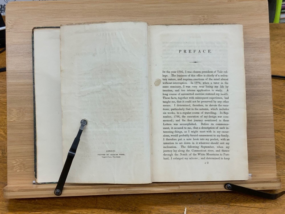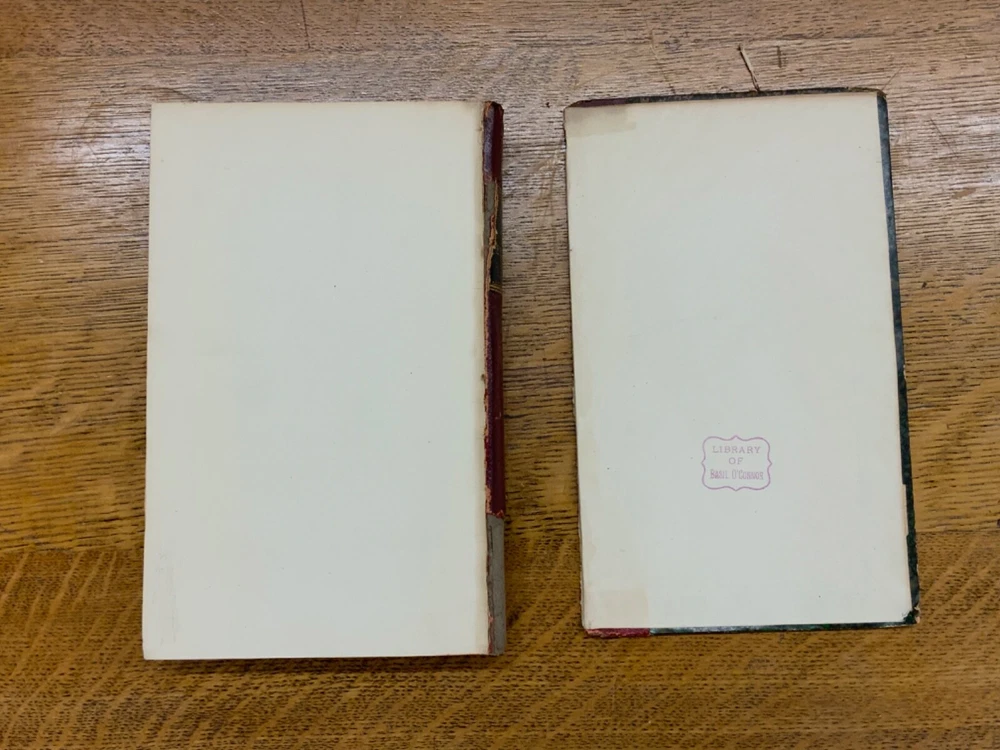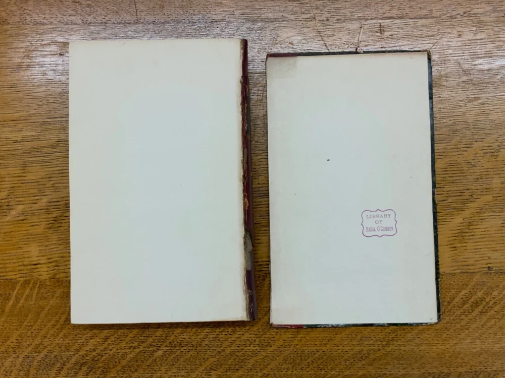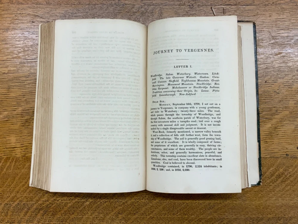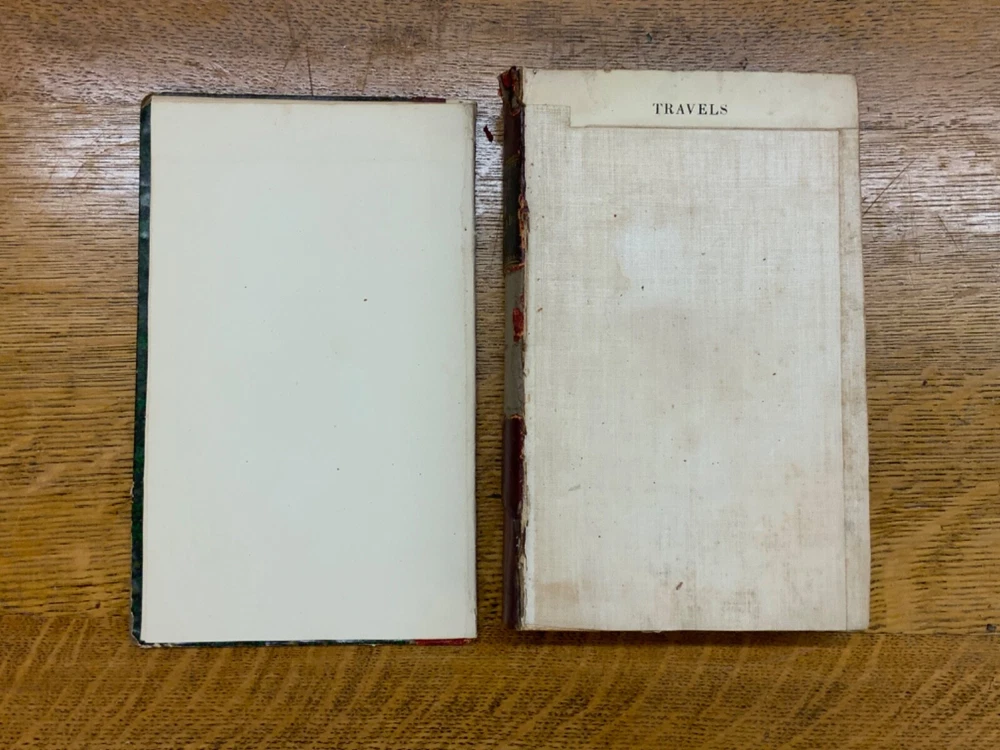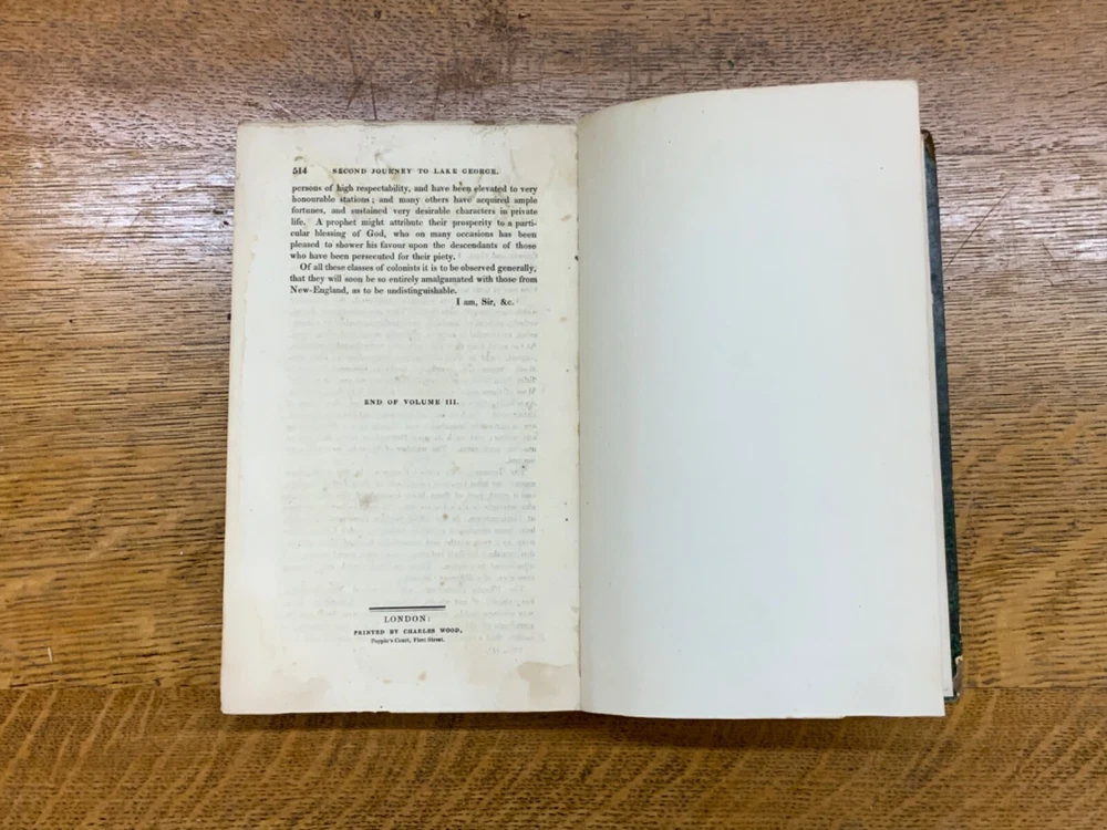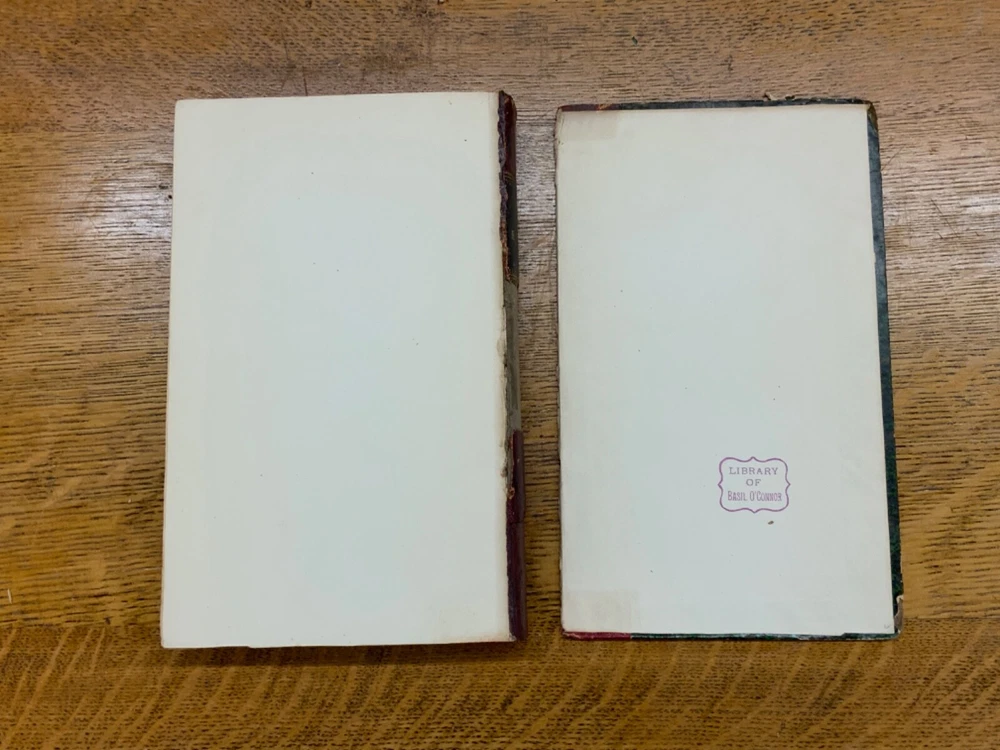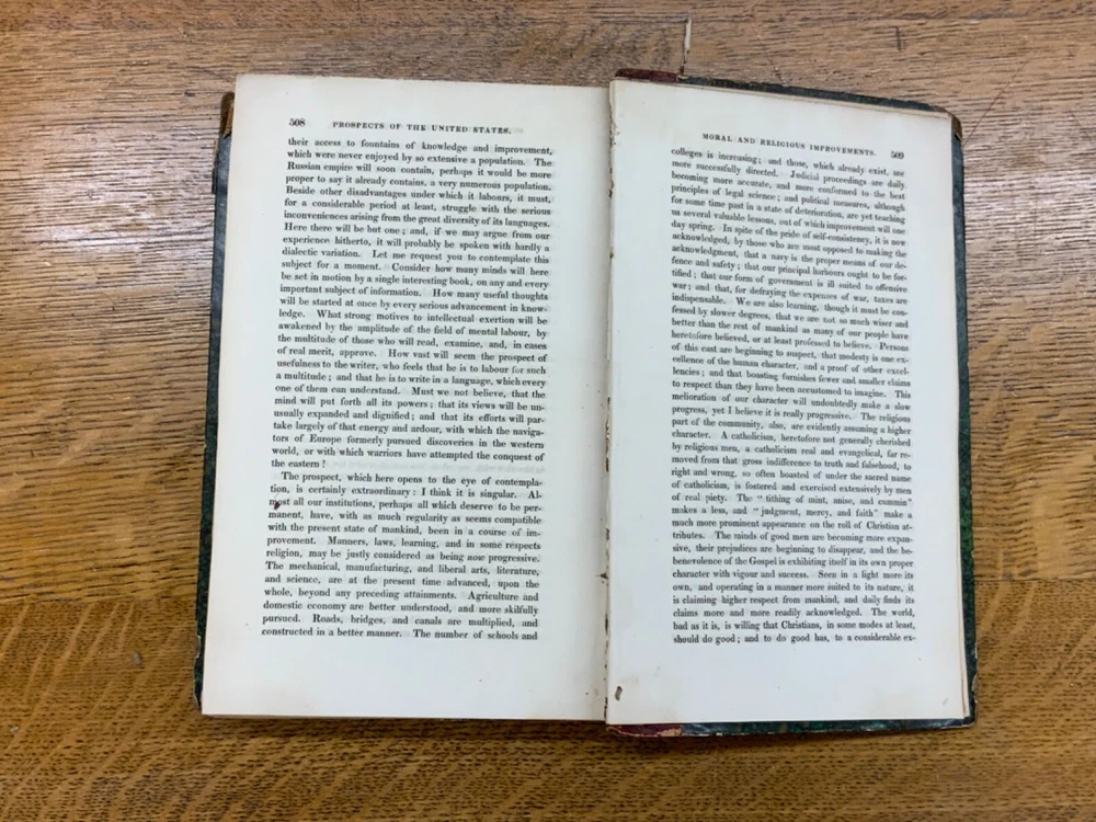 Travels in New-England and New-York. By Timothy Dwight, S.T.D. LL.D., Late President of Yale College; Author of Theology Explained and Defended. In Four Volumes. Illustrated with Maps, &c., Vols. I-IV, London: Printed for William Baynes and Son, 1823, half-leather marbled boards, 483 pp, 504 pp, 514 pp, 514 pp, 9 x 5.5", 8vos. In poor condition. Vols. I-III-s boards are detached from binding. Vols. II-IV exhibit large chips missing from leather spine, however, title label & gilt lettering still bright and clean. Green marbled boards on all volumes are scuffed at edges and worn at corners. Vol. VI's boards are attached by cording only, very fragile. Heads and tails of all spines lacing, binding exposed. Personal library stamp throughout all volumes: Basil O'Connor. Vols. I-III include reinforced fold-out maps. Instances of foxing, toning, off-setting, and age-staining throughout all volumes. No pages missing, all volumes complete. Binding intact, boards detached. Please see photos. Timothy Dwight (1752-1817) was an American academic and educator, Congregationalist minister, theologian, and author. He was also the eighth president of Yale College. Dwight ws said to have learned the alphabet in a single lesson, and to have been able to read the Bible at the age of four. He had twelve younger siblings. These editions are complete as a four volume set, and are perfect candidates for restoration. FORN-MSB-0723-0741-HK465