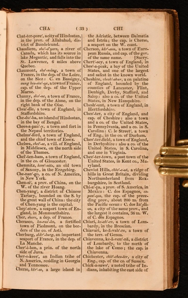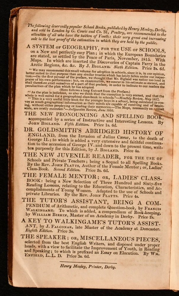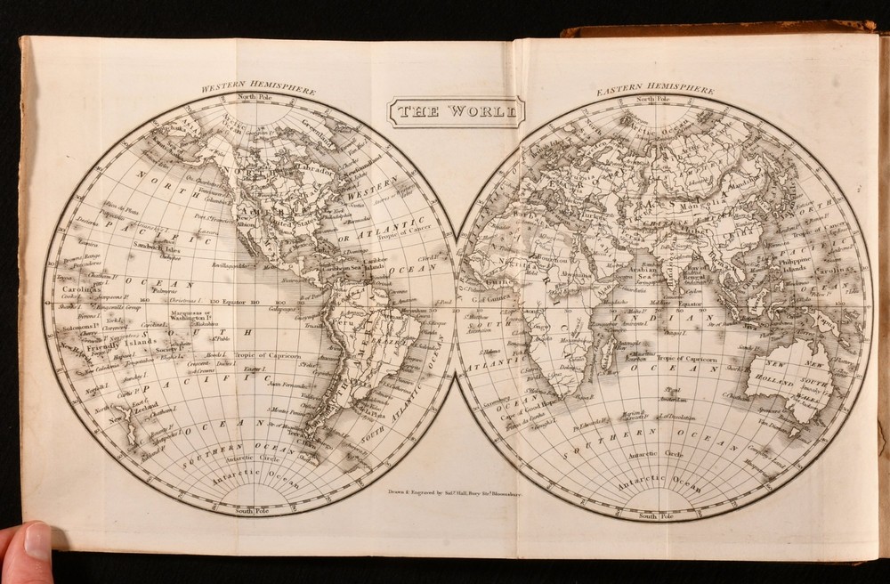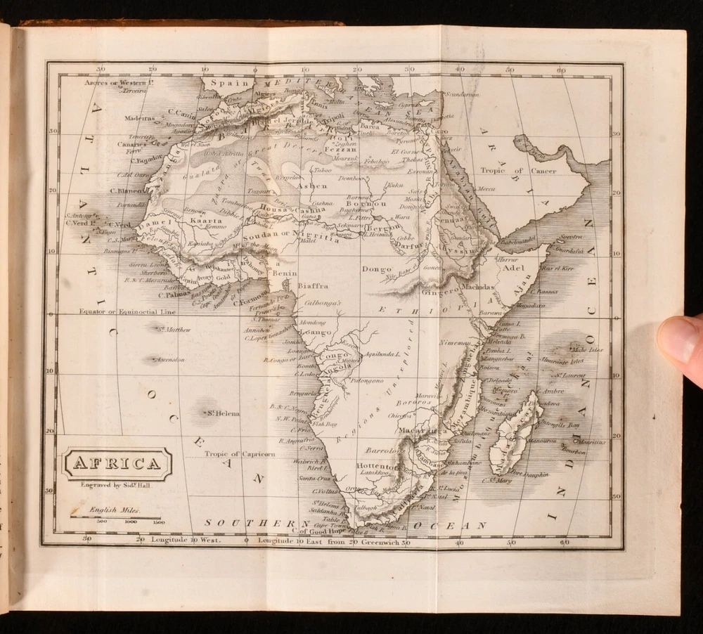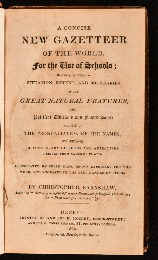 Click here to see our other books! A Concise New Gazetteer of the World, For the Use of Schools Christopher Earnshaw 1824 H. Mozley; G. Cowie and Co : London 7" by 4" [8], 261, [3pp] SUMMARY A vanishingly scarce first edition gazetteer of the world, an extensively detailed work complete with seven folding maps. First Edition,Folding Maps,Illustrated,Leather Binding,Very Scarce Overall Condition: Good This book weighs 0.5 KG when packed UK Postage: £ 3.99 US Postage: £ 15.99 EU Postage : £ 13.99 European Postage: £ 14.99 Asia Postage: £ 18.99 Worldwide Postage: £ 19.99 DESCRIPTION A vanishingly scarce work. The first and only edition. Illustrated with a folding map to the frontispiece, and six folding maps. Three leaves of adverts to the rear. Collated, complete. 'An extensive gazetteer of the world, a brilliant history and exploration of the world in the format of a dictionary, intended for use in schools'. The work lists the geography of countries, as well as the political divisions and subdivisions. Helpfully including an explanation to the pronunciation, as well essential vocabulary of nouns of adjectives which are derived from names of places. By Christopher Earnshaw CONDITION In a full calf binding. Externally, the front board is held by two cords only and may detach with further handling. Rear joint is starting, rear hinge is strained. Bumping to the head and tail of the spine and to the extremities, resulting in a small amount of loss to the head and tail of the spine. Some light rubbing and marks to the boards. Spine is a little discoloured with a couple of minor marks. Lacking the front endpaper. Internally, firmly bound. Pages are lightly age-toned and generally clean with scattered spots. Very small tide mark to the margin of the frontispiece, and to two other folding maps. Overall Condition: Good GLOSSARY OF TERMS Overall Condition (Dustwrapper condition rating is shown after that for the book itself, where a dustwrapper is present) Fine - Very well preserved copy showing very little wear Very Good Indeed - Only one or two minor faults, really a very attractive copy Very Good - Quite a wide term meaning no major faults but probably several smaller ones often expected given the age of the book, but still a respectable copy Good - Meaning not very good. Some more serious faults as will be described in the condition report under 'condition' Good Only - Meaning one or more faults that could really do with repair Fair - As with good only above but with other faults leaving a compromised copy even after repair Poor - Really bad and possibly seriously incomplete. We only sell books in this condition where their rarity or value makes them attractive none the less. Major defects will be described. GUARANTEE We offer a full money back guarantee on our descriptions. Please ask for details and conditions. We prefer PAYPAL. If you pay via PAYPAL we will post the item off the same or the next working day with the postage you have selected. Please note we cannot accept USD cheques