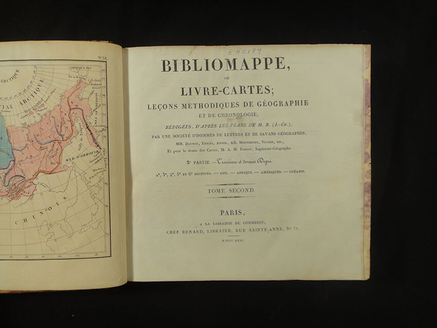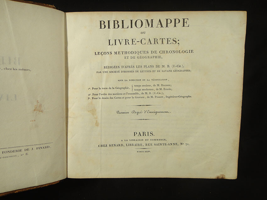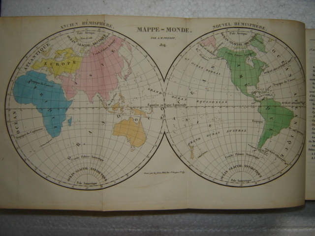 Untitled Document FREE DHL worldwide shipping: 2/4 days to North America, 3/5 days to Europe. Please check our feedback and see how quickly we ship. We are the leading Antiquarian Booksellers in Latin America & members of ILAB (International League of Antiquarian Booksellers, London) & ABA (Antiquarian Booksellers Association, London). Have been in business for more than 30 years. We are a general antiquarian bookstore with emphasis in Spanish-American material. Don't forget to visit our eBay store , this is one of the best stores of rare books on eBay. Title : Bibliomappe ou livre - cartes; leçons methodiques de chronologie et de geographie, redigees d'apres les plans de M. B. (j.-Ch.), par une societe d'hommes de lettres et de savans geographes; sous la direction et la verification, Pour le text de la geographie, temps anciens, de M Daunou; temps modernes, de M. Eyries; Pour l'ordre des matieres et l'ensemble, de M. B. (J. Ch.); Pour le desin des cartes et puor la gravure, de M. Perrot, Ingenieur-Geographe. Date and publisher : Paris, Renard, 1824 / 26. Description: 2 Volumes of 3. Fully illustrated. All maps are in contemporary color, some folded. 2 Volumenes de 3, profusamente ilustrado con mapas en color, algunos plegados. Binding: Full leather with modern spine. Size : 8.3 x 8.8 inches. Number of pages : 722 + 680. Condition : Some offsetting, some spots (foxing + a few water spots), last 3 pages in volume 2 with marginal restorations, binding with traces of use, corners bumped. Internal reference: AA21C67 / A0907 / E9E29