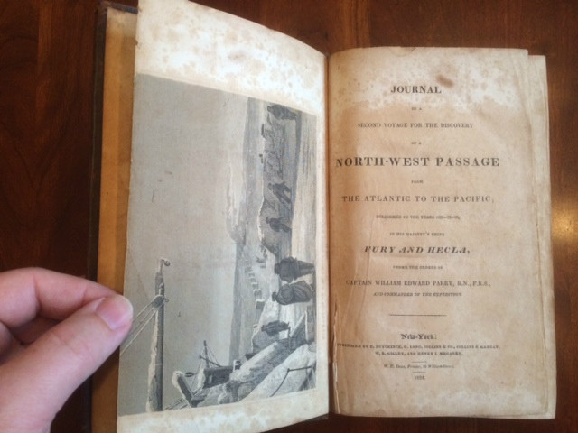 Journal of a Second Voyage for the Discovery of a North-West Passage from the Atlantic to the Pacific, in the Years 1821-22-25 in his Majesty’s ships Fury and Hecla, under the orders of William Edward Parry. By Capt. William Edward Parry Published: E. Duyckinck, G. Long, Collins & Company, New York, 1824 . 464 pp. Full leather binding with gilted title on leather spine label. Frontis engraving, charts, Eskimo vocabulary. Plates & maps present in the British edition were not published in this American edition. Spine and covers showing rubbing, wear. Covers firmly attached, hinges secure. Contents are tight. With slight crack after ffep. Light, scattered foxing; Title page browned; pages age-toned under print. A nice copy of this scarce title. Not Ex-Lib. I've done my best to describe the book, but if you have additional questions, please don't hesitate to send me an e-mail.