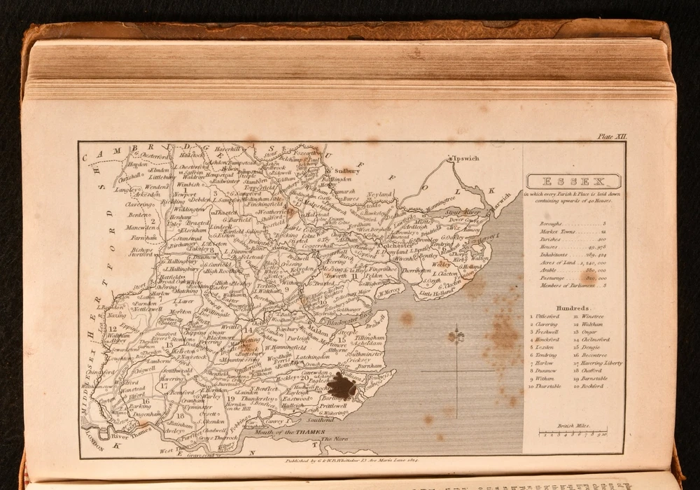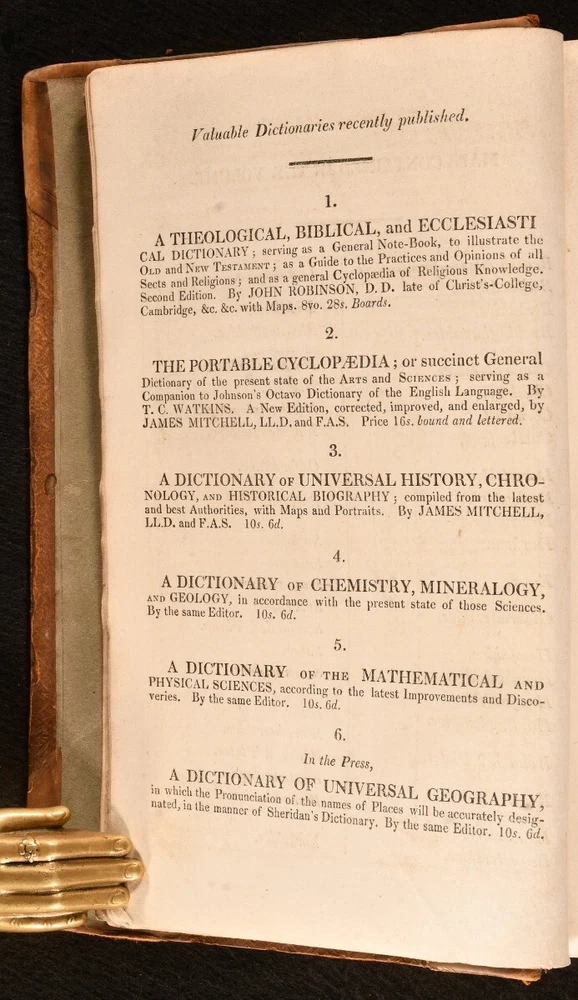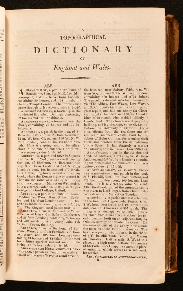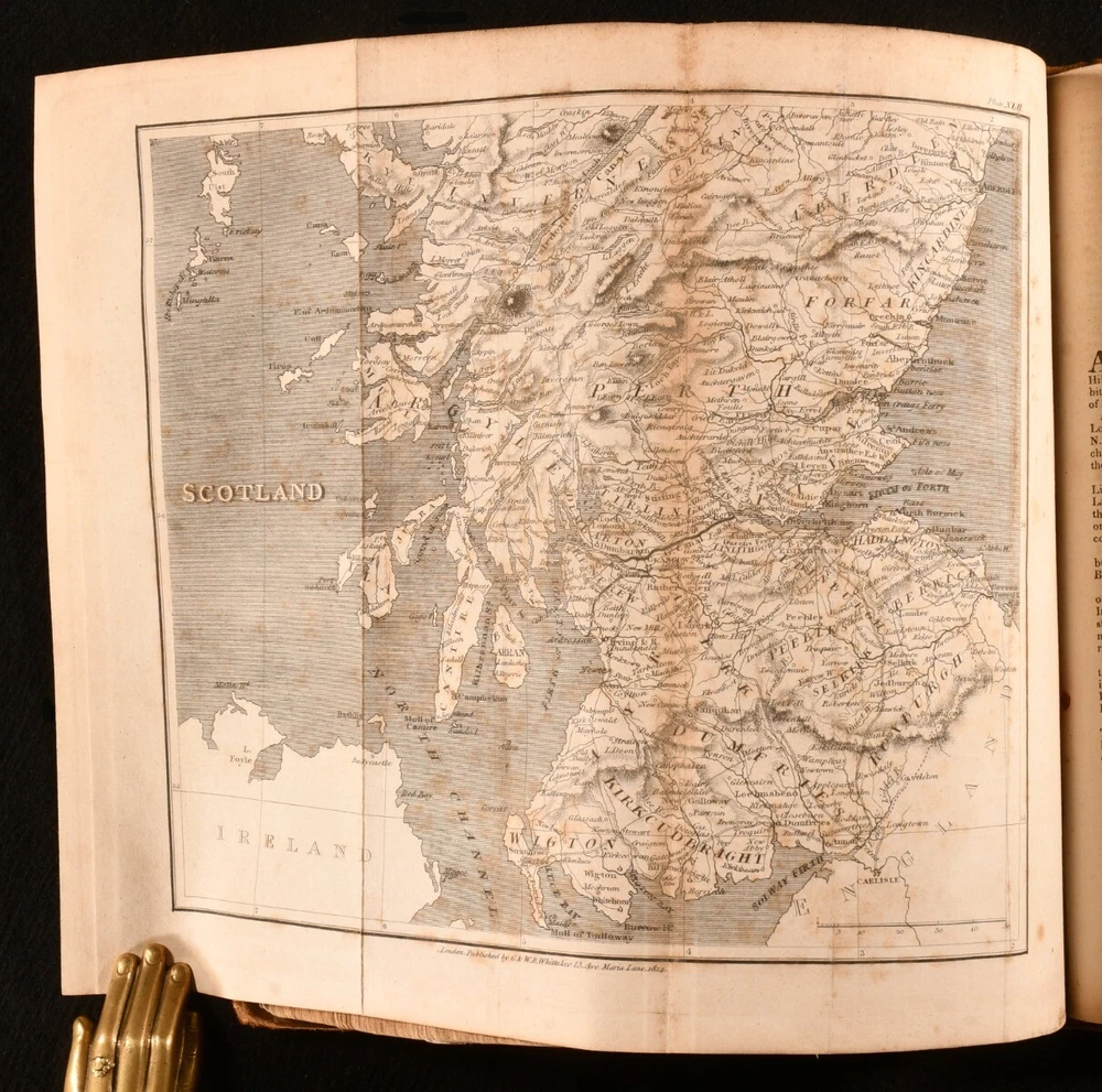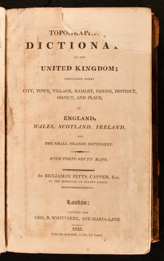 Click here to see our other books! A Topographical Dictionary of the United Kingdom; Containing Every City, Town, Village, Hamlet, Parish, District, Object, and Place in England, Wales, Scotland, Ireland, and the Small Islands Dependent Benjamin Pitts Capper 1825 Geo. B. Whittaker : London 3.5" by 5" vi, [18], 865, [3], 152, 40pp. SUMMARY An uncommon edition of this popular topographical dictionary of the United Kingdom, with numerous maps. Folding Maps,Illustrated,Leather Binding,Uncommon Overall Condition: Good This book weighs 2 KG when packed UK Postage: £ 3.99 US Postage: £ 29.99 EU Postage : £ 21.99 European Postage: £ 23.99 Asia Postage: £ 37.99 Worldwide Postage: £ 38.99 DESCRIPTION An uncommon new edition. In a full calf binding with gilt detail, and new endpapers. With a folding map frontispiece, a further six folding maps, and thirty-nine full-page maps. Collated complete. Wales is on one plate, not two as stated in the list of maps, as is common for this edition. A comprehensive topographical dictionary of England, Wales, Scotland and Ireland, from the early nineteenth century. Containing every city, town, village, hamlet, parish, and district. Benjamin Pitts Capper was a British gazetteer publisher. His best known work was this topographical dictionary, which was published in over twenty different editions. CONDITION In a full calf binding. Externally, a trifle rubbed. Rubbing to the extremities. Fading to the spine. Marks to the boards. Crack to the upper rear board. Front hinge is starting but still firm. Light marks to the paste-downs and free endpapers. Internally, binding slightly strained but still firm. Pages lightly age-toned to the edges, otherwise generally bright and clean. Spotting and cockling to the frontispiece map. Loss to the upper title page. Some offsetting and scattered marks to the title page. Scattered spots throughout, heavier to the plates. Occasional offsetting on the pages facing the plates. Scattered handling marks and the odd ink mark. Ink mark to the map of Essex. Overall Condition: Good GLOSSARY OF TERMS Overall Condition (Dustwrapper condition rating is shown after that for the book itself, where a dustwrapper is present) Fine - Very well preserved copy showing very little wear Very Good Indeed - Only one or two minor faults, really a very attractive copy Very Good - Quite a wide term meaning no major faults but probably several smaller ones often expected given the age of the book, but still a respectable copy Good - Meaning not very good. Some more serious faults as will be described in the condition report under 'condition' Good Only - Meaning one or more faults that could really do with repair Fair - As with good only above but with other faults leaving a compromised copy even after repair Poor - Really bad and possibly seriously incomplete. We only sell books in this condition where their rarity or value makes them attractive none the less. Major defects will be described. GUARANTEE We offer a full money back guarantee on our descriptions. Please ask for details and conditions. We prefer PAYPAL. If you pay via PAYPAL we will post the item off the same or the next working day with the postage you have selected. Please note we cannot accept USD cheques
