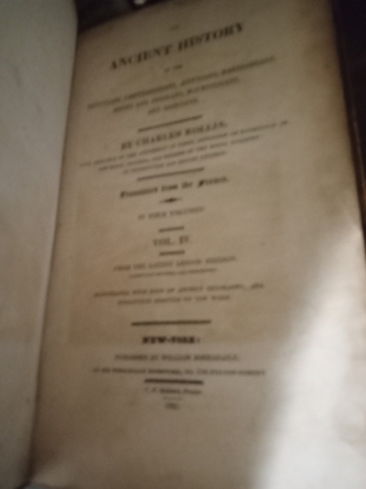 Charles Rollin's Classic T he Ancient History of the world a history of the Egyptians, Carthaginians, Assyrians, Babylonians, Medes and Persians, Grecians, and Macedonians was published in 4 full leather bound volumes in 1825 by William Boradaile. A first edition set by this publisher, and a nice edition of a often printed work. Appear be original binding.