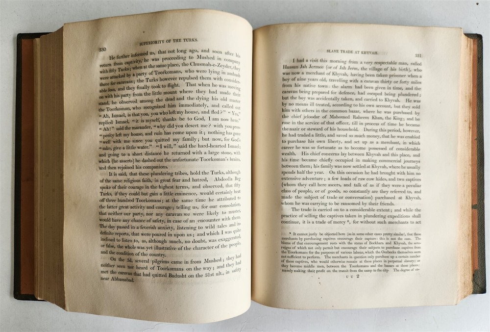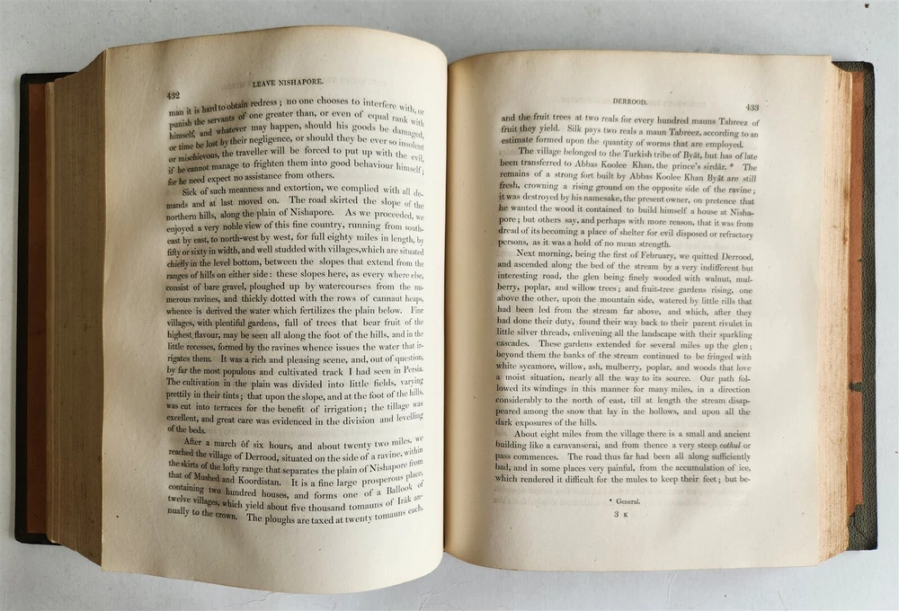 NARRATIVE of a JORNEY INTO KHORSAN, in the years 1821 and 1822 Including some account of the countries to the north-east of Persia; with remarks upon the national character, government, and resources of that kingdom by Fraser, James Baillie (1783-1856) London; 1825 Size 4 1/4 by 10 3/4 inches quarter leather over cloth boards, expertly rebacked xxvi, [1], 623, 148 pages; large folding map (25.5 x 17.5 inches (648 x 445 mm)) ex-library Sion College, London, with their stamp and their crest gilt-stamped on front board. Map foxed, with small closed tear at upper right; otherwise very good condition with ample margins and clean and bright text. Text in English ======================================== An early detailed account. "James Baillie Fraser left his native Scotland for India in 1813. After a short and unsuccessful stint working in a trading business in Calcutta, in 1821 Fraser accompanied Dr. Andrew Jukes of the East India Company on a diplomatic mission to Persia. Jukes died in Isfahan in late 1821, but Fraser continued the journey, visiting Tehran, Mashhad, Tabriz, and other cities before returning to London. This book is Fraser's account of his voyage through Khorasan, a historical region that includes parts of present-day Iran, Turkmenistan, and Afghanistan. It contains detailed information about the peoples of the region and their customs, religious practices, and forms of government. Appended to the main work is a lengthy 'Geographical Sketch of the Principal Districts of Khorasan,' with descriptions of the countryside and of towns such as Herat, Afghanistan. At the end are listed the route and travel distances from Mashad to Herat, Herat to Kabul, Kabul to Balkh, and between various other points. Also included are several tables with geographic and meteorological data." (Library of Congress) ============================= Please see my other auctions Thank You Refund Policy: We will issue a FULL REFUND, 100% money back if you are not satisfied with your purchase. Items must be returned to us within 20 days in order to receive a refund or replacement. Buyer is responsible for shipping costs. Powered by SixBit's eCommerce Solution