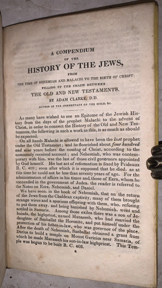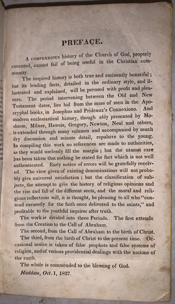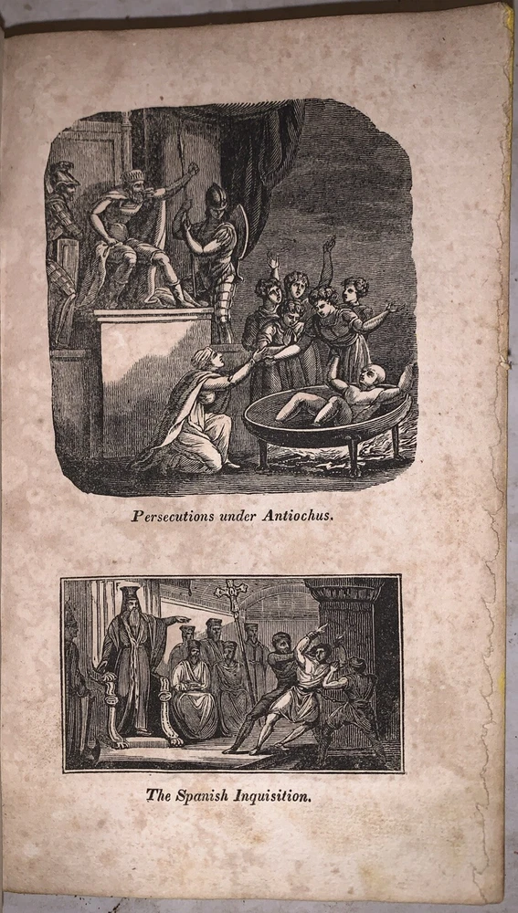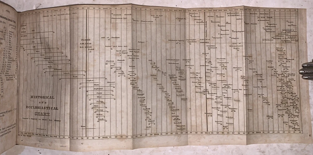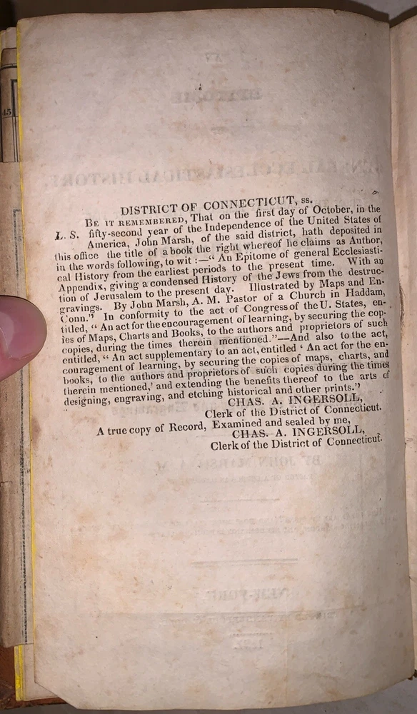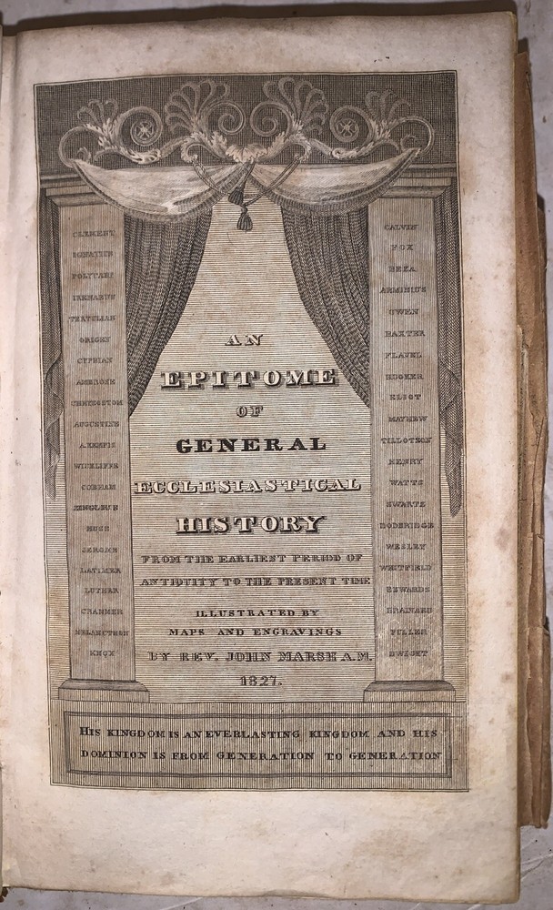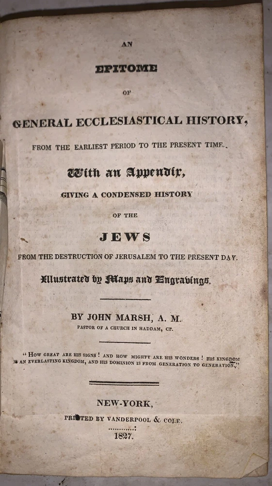 An Epitome of General Ecclesiastical History from the Earliest Period to the Present Time with an Appendix Giving a Condensed History of the Jews from the Destruction of Jerusalem to the Present Day Illustrated by Maps and Engravings by John Marsh, A. M. New York: Vanderpool & Cole 1827 First Edition Octavo, 420, 32 pages, period full leather binding with gilt lettering and decoration to spine. Illustrated with several foldouts, including a hand-colored foldout frontispiece map and black-and-white engravings. Large tear to the hand-colored map, some rubbing and wear, scuffs, foxing and discoloration, else in good + condition. If you have any questions, feel free to ask, and don't forget to check out my other listings.