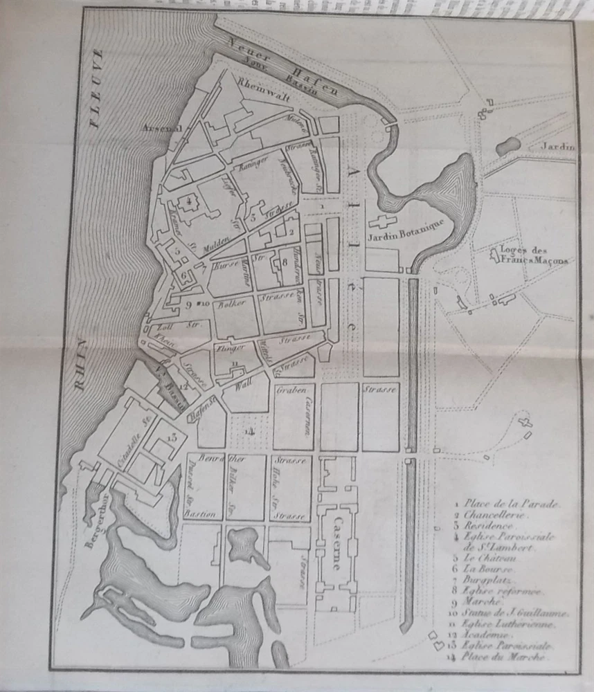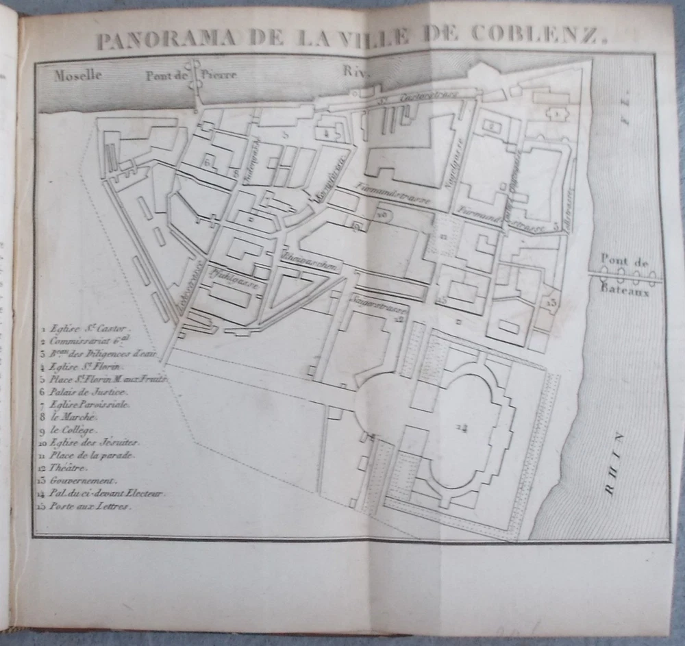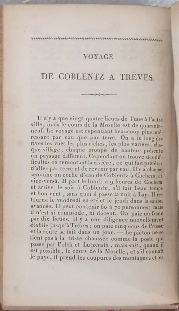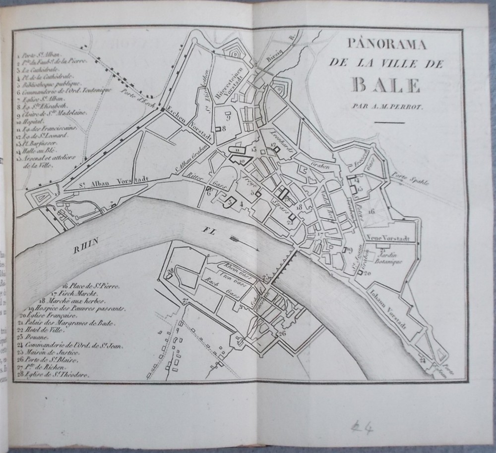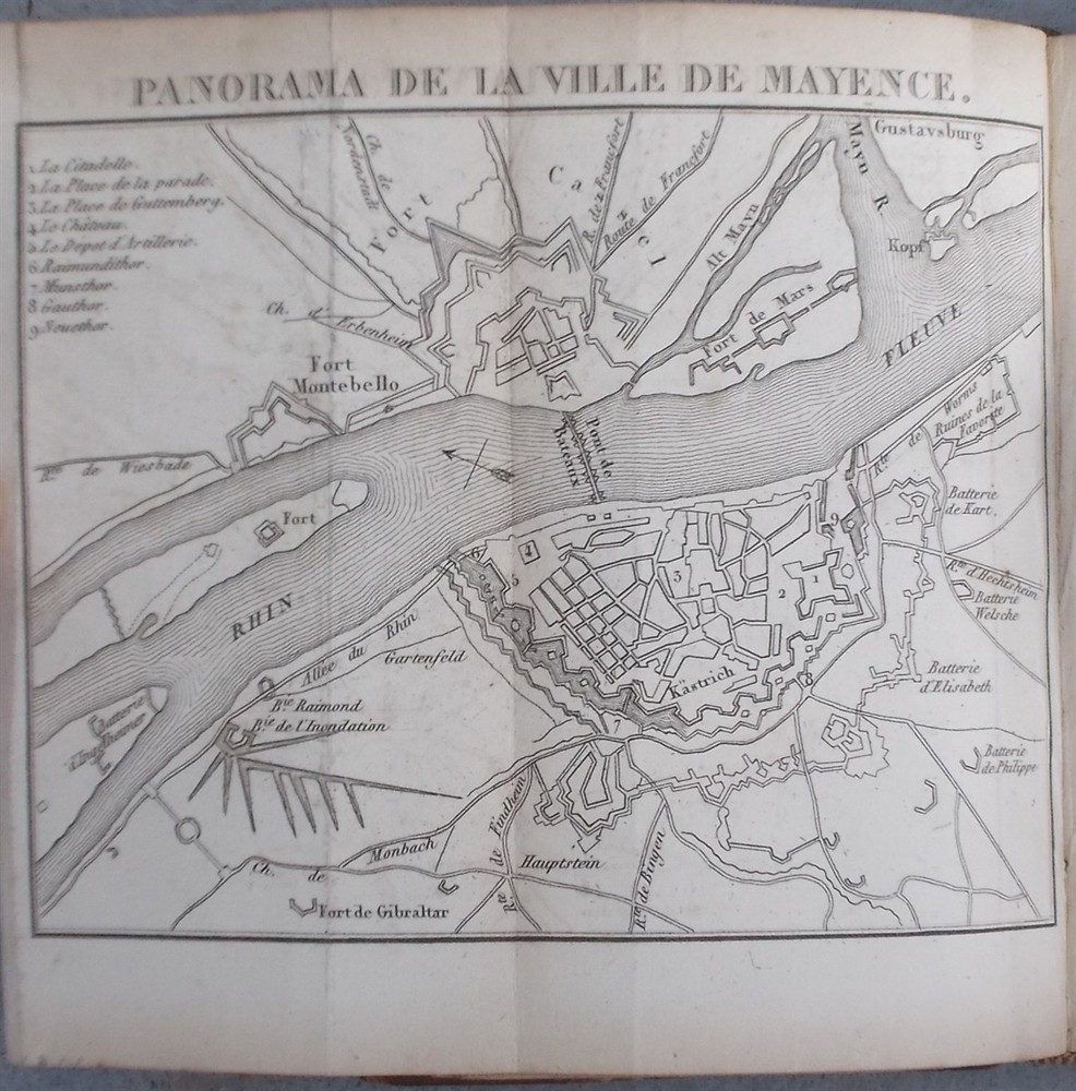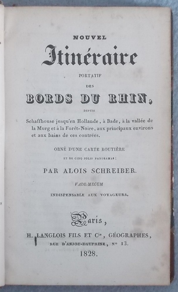 Schreiber, Alois. Nouvel Itinéraire Portatif Des Bords Du Rhin, Depuis Schaffhouse Jusqu'en Hollande, à Bade, à La Vallée De La Murg Et à La Forêt Noire, Aux Principaux Environs Et Aux Bains De Ces Contrées. Langlois Fils Et Cie. , 1828. Leather: Fair 5.25" x 3.5", 387pp plus six folding maps. The front cover is detached, otherwise a good copy with some mild foxing. The maps are in good condition.