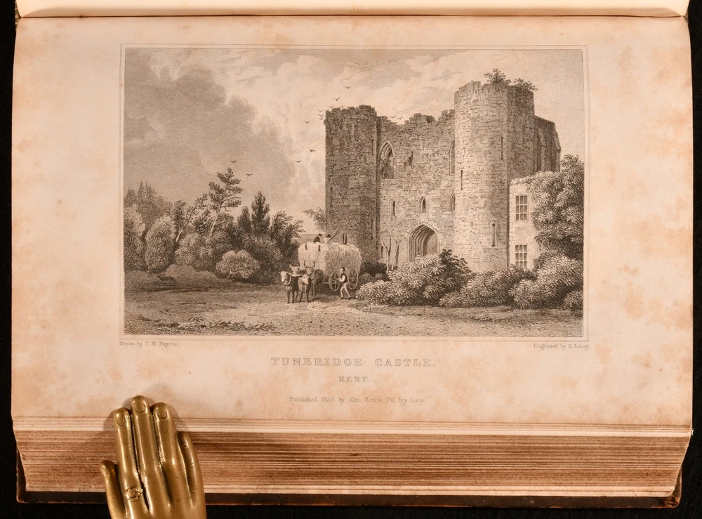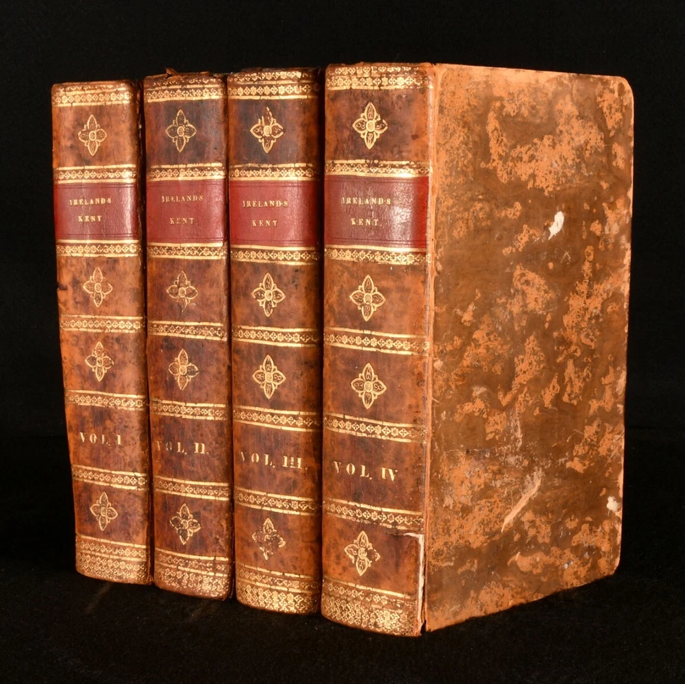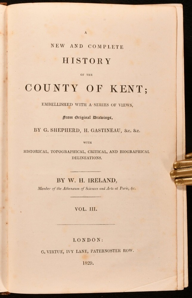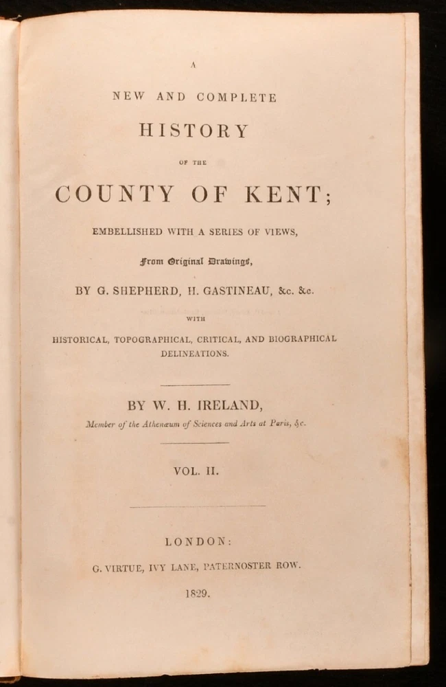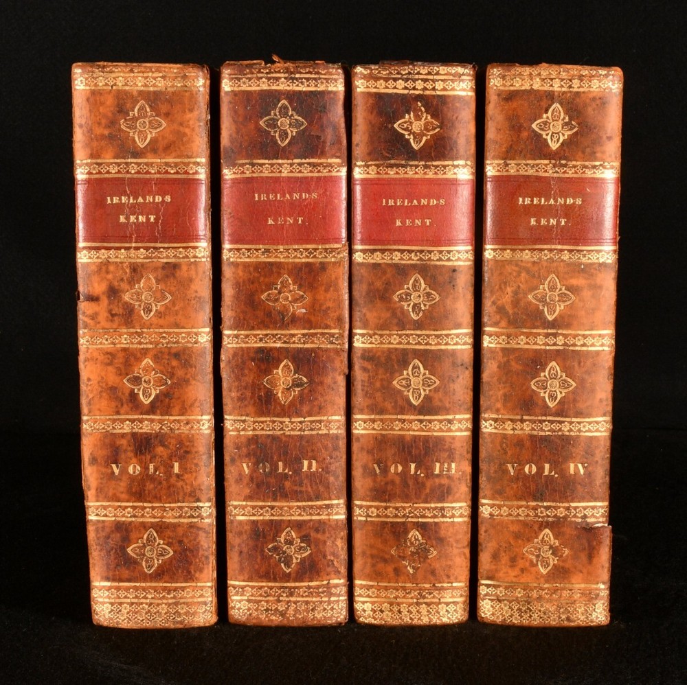 Click here to see our other books! England's Topographer: A New and Complete History of the County of Kent W. H. Ireland [William Henry Ireland] 1828-1830 G. Virtue : London 9" by 6" 2-712, xix; 713, xv; 698, xviii; 780, xii [10] pp SUMMARY The first edition of W. H. Ireland's study of the history and topography of the county of Kent. Illustrated with a folding map and 124 further beautifully engraved plates. First Edition,Folding Maps,Illustrated,Leather Binding Overall Condition: Good This book weighs 5 KG when packed UK Postage: £ 4.49 US Postage: £ 42.99 EU Postage : £ 27.99 European Postage: £ 45.99 Asia Postage: £ 74.99 Worldwide Postage: £ 129.99 DESCRIPTION The complete four volume first edition of English poet and writer William Henry Ireland's topographical study of Kent, in smart full tree calf bindings. Illustrated throughout with a series of views from G. Shepherd and H. Gastineau. Illustrated with an engraved title page, folding map and 124 further plates: folding map, engraved title page and thirty plates to volume I; twenty-seven plates to volume II; twenty-nine plates to volume III and thirty-eight plates to volume IV. Collated, complete. With an index to the rear of each volume, and an errata to the rear of volume IV. With the inscription of Margaret Ridgen, 1830, to a front endpaper of volume I. An excellent first edition work from gothic author and historian Ireland, best remembered now, however, for his forgeries of would-be Shakespeare documents and plays. CONDITION In full tree calf bindings. Rubbing to back strips and board perimeters. Front and rear joint of volume I, front joint of volume II, and tail of front joint of volume IV starting, with boards all holding firm. Contemporary inscription to front endpaper of volume I. Internally, firmly bound. Instances of spotting and discolouration throughout, most prominent to volume I, plates, and pages surrounding plates. Overall Condition: Good GLOSSARY OF TERMS Overall Condition (Dustwrapper condition rating is shown after that for the book itself, where a dustwrapper is present) Fine - Very well preserved copy showing very little wear Very Good Indeed - Only one or two minor faults, really a very attractive copy Very Good - Quite a wide term meaning no major faults but probably several smaller ones often expected given the age of the book, but still a respectable copy Good - Meaning not very good. Some more serious faults as will be described in the condition report under 'condition' Good Only - Meaning one or more faults that could really do with repair Fair - As with good only above but with other faults leaving a compromised copy even after repair Poor - Really bad and possibly seriously incomplete. We only sell books in this condition where their rarity or value makes them attractive none the less. Major defects will be described. GUARANTEE We offer a full money back guarantee on our descriptions. Please ask for details and conditions. We prefer PAYPAL. If you pay via PAYPAL we will post the item off the same or the next working day with the postage you have selected. Please note we cannot accept USD cheques