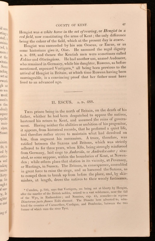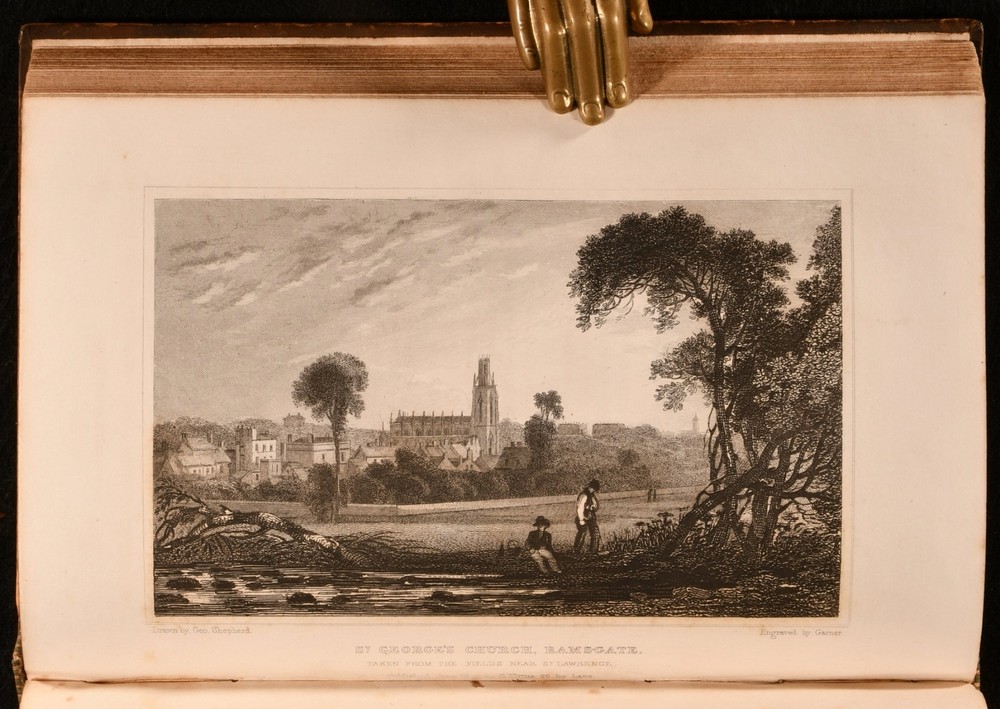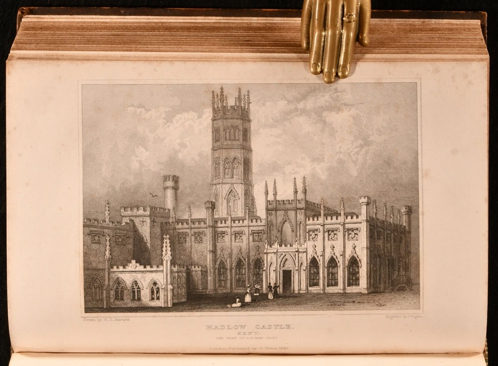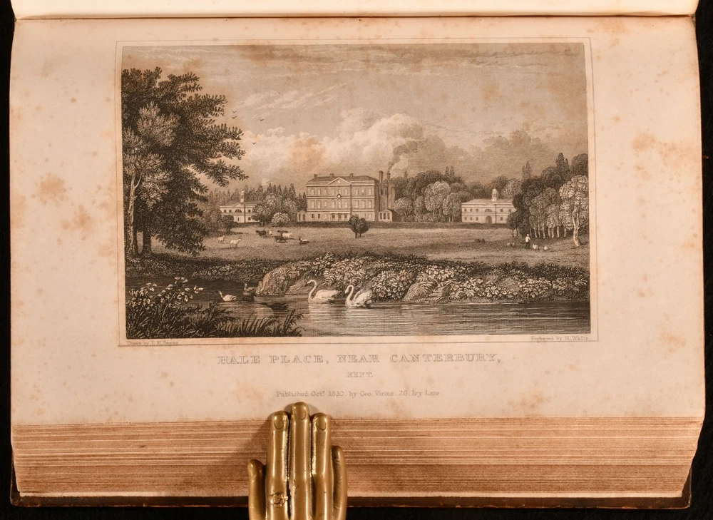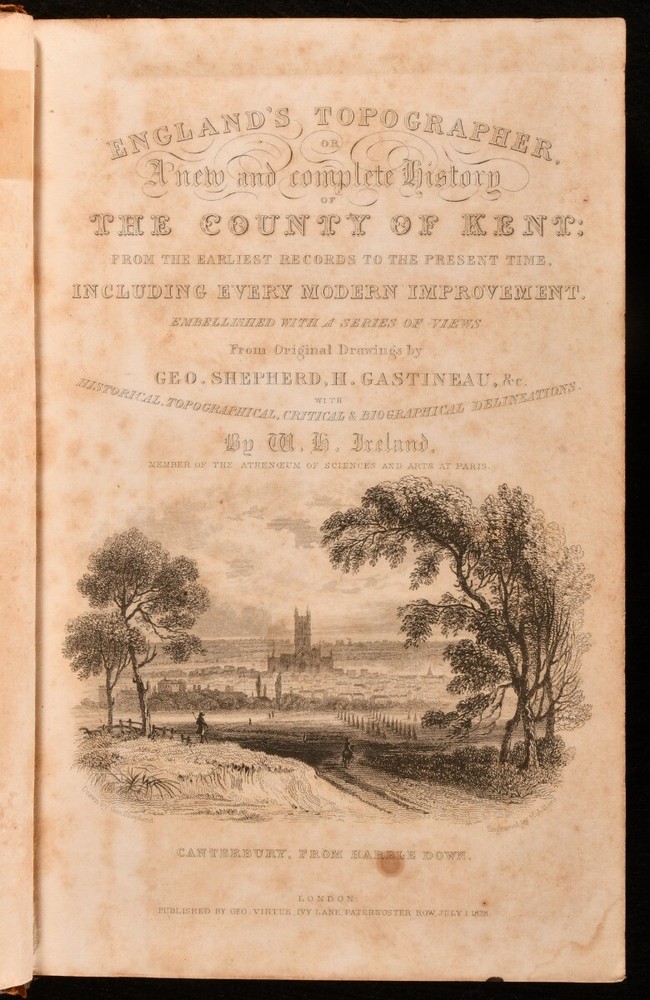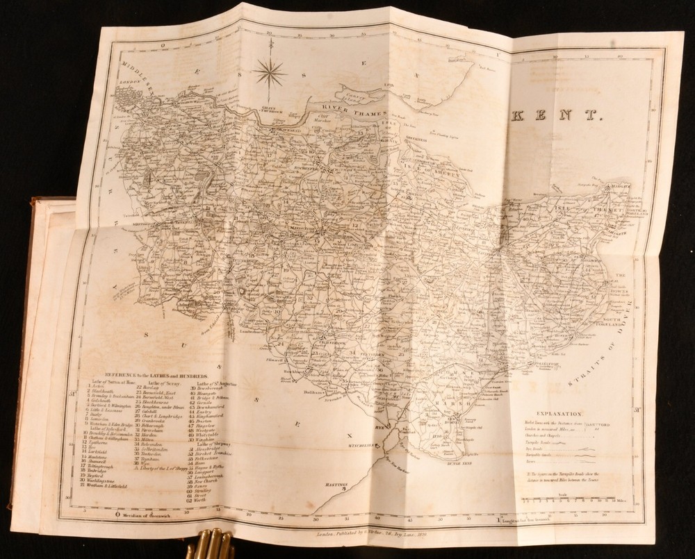 Click here to see our other books! England's Topographer: A New and Complete History of the County of Kent W. H. Ireland [William Henry Ireland] 1828-1830 G. Virtue : London 9" by 6" 2-712, xix; 713, xv; 698, xviii; 780, xii [10] pp SUMMARY The first edition of W. H. Ireland's study of the history and topography of the county of Kent. Illustrated with a folding map and 124 further beautifully engraved plates. First Edition,Folding Maps,Illustrated,Leather Binding Overall Condition: Good This book weighs 5 KG when packed UK Postage: £ 4.49 US Postage: £ 42.99 EU Postage : £ 27.99 European Postage: £ 45.99 Asia Postage: £ 74.99 Worldwide Postage: £ 129.99 DESCRIPTION The complete four volume first edition of English poet and writer William Henry Ireland's topographical study of Kent, in smart full tree calf bindings. Illustrated throughout with a series of views from G. Shepherd and H. Gastineau. Illustrated with an engraved title page, folding map and 124 further plates: folding map, engraved title page and thirty plates to volume I; twenty-seven plates to volume II; twenty-nine plates to volume III and thirty-eight plates to volume IV. Collated, complete. With an index to the rear of each volume, and an errata to the rear of volume IV. With the inscription of Margaret Ridgen, 1830, to a front endpaper of volume I. An excellent first edition work from gothic author and historian Ireland, best remembered now, however, for his forgeries of would-be Shakespeare documents and plays. CONDITION In full tree calf bindings. Rubbing to back strips and board perimeters. Front and rear joint of volume I, front joint of volume II, and tail of front joint of volume IV starting, with boards all holding firm. Contemporary inscription to front endpaper of volume I. Internally, firmly bound. Instances of spotting and discolouration throughout, most prominent to volume I, plates, and pages surrounding plates. Overall Condition: Good GLOSSARY OF TERMS Overall Condition (Dustwrapper condition rating is shown after that for the book itself, where a dustwrapper is present) Fine - Very well preserved copy showing very little wear Very Good Indeed - Only one or two minor faults, really a very attractive copy Very Good - Quite a wide term meaning no major faults but probably several smaller ones often expected given the age of the book, but still a respectable copy Good - Meaning not very good. Some more serious faults as will be described in the condition report under 'condition' Good Only - Meaning one or more faults that could really do with repair Fair - As with good only above but with other faults leaving a compromised copy even after repair Poor - Really bad and possibly seriously incomplete. We only sell books in this condition where their rarity or value makes them attractive none the less. Major defects will be described. GUARANTEE We offer a full money back guarantee on our descriptions. Please ask for details and conditions. We prefer PAYPAL. If you pay via PAYPAL we will post the item off the same or the next working day with the postage you have selected. Please note we cannot accept USD cheques