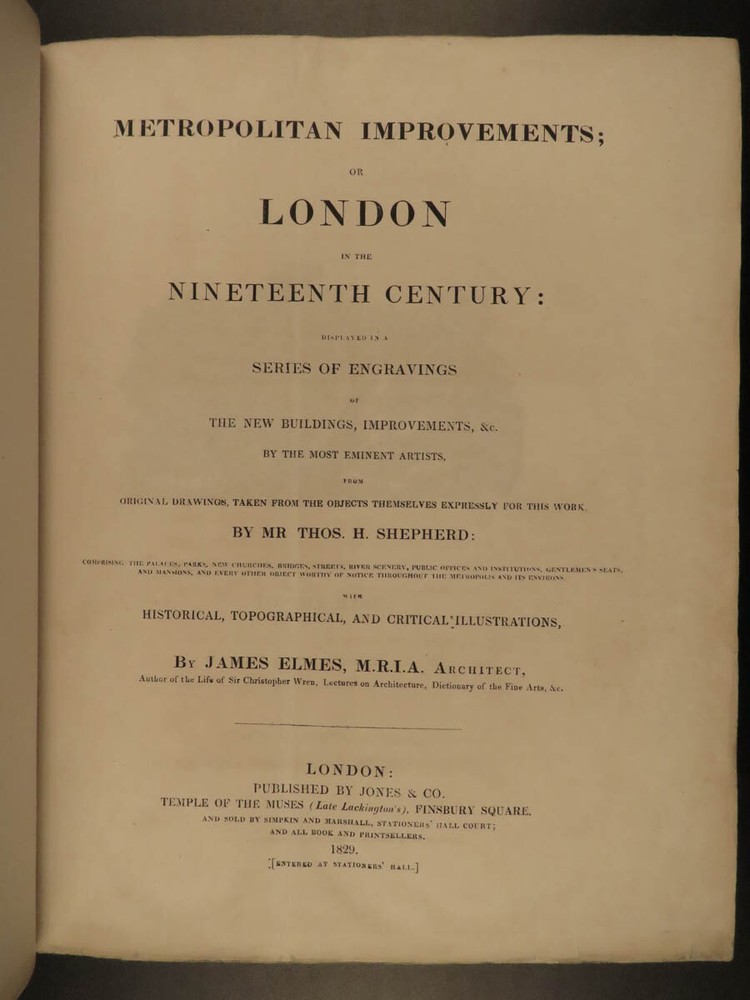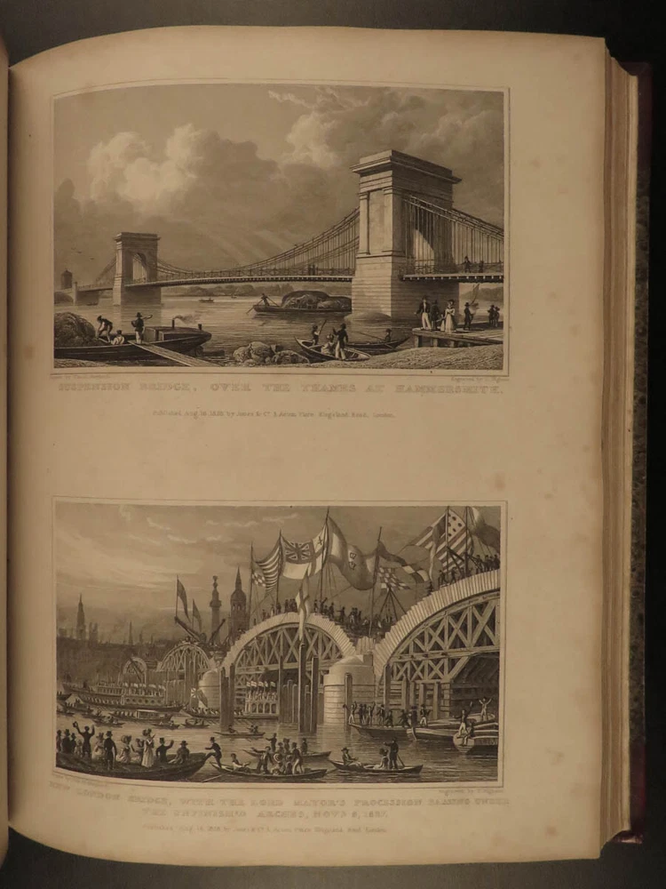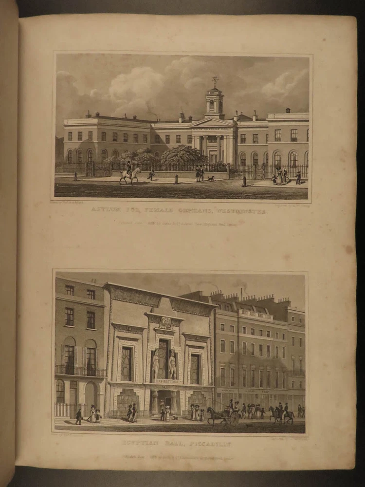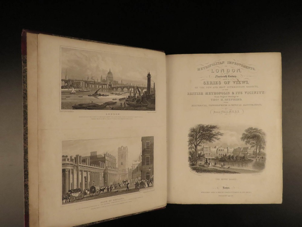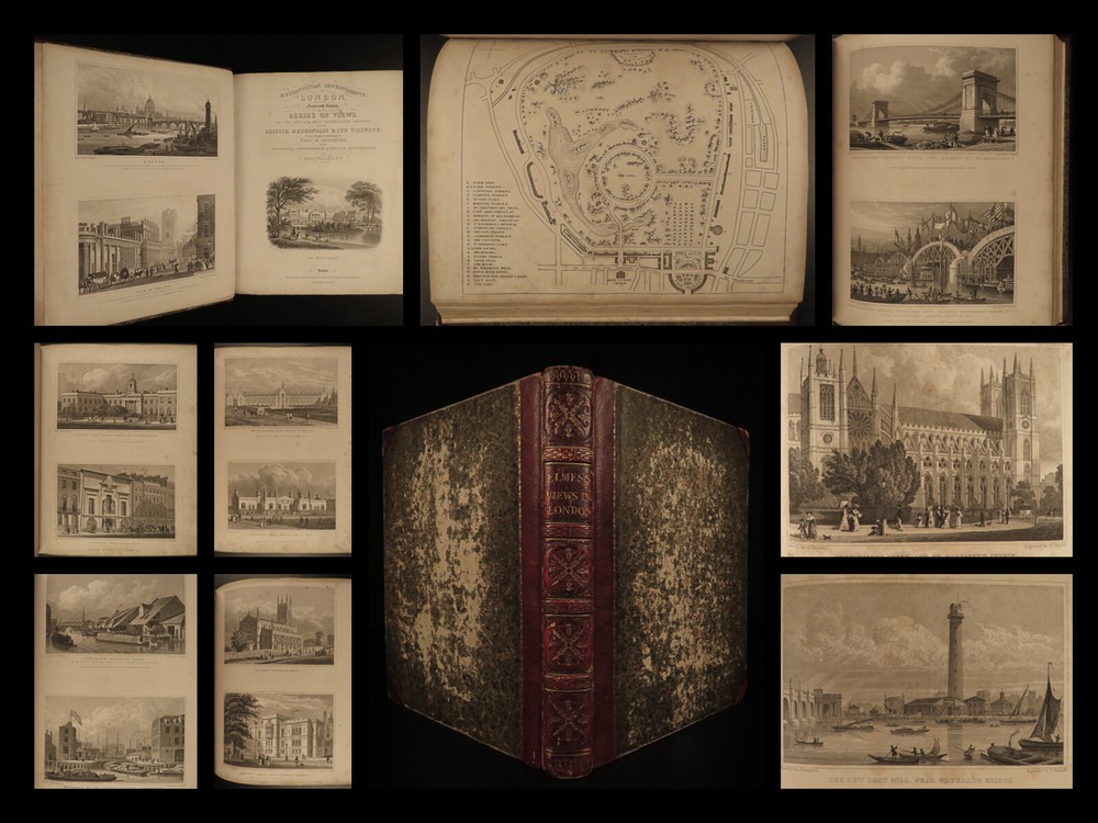 1829 LONDON Architecture Metropolitan Improvements Engravings Cathedrals MAPS Elmes and Shepherd’s “ Metropolitan Improvements ” is an early 19 th -century illustrated history of London. Illustrator Thomas Shepherd supplied this book with numerous engravings of iconic London locations – parks, palaces, cathedrals and churches, bridges and streets, rivers, institutions, and other environs. This 1829 printing includes nearly 160 views on 81 steel-engraved plates – a remarkable illustrated history of London! Item number: #15157 Price: $750 ELMES, James Metropolitan Improvements; or London in the Nineteenth century; displayed in a series of Engravings of the new buildings, improvements London: Published by Jones & Co. and sold by Simkin and Marshall, 1829. Details : · Collation: Complete with all pages o vi, 172, ii o 81 engraved plates · Language: English · Binding: Leather; tight and secure · Size : ~10.5in X 8.75in (27.5cm x 22.5cm) Our Guarantee: Very Fast. Very Safe. Free Shipping Worldwide. Customer satisfaction is our priority! Notify us with 7 days of receiving, and we will offer a full refund without reservation! 15157