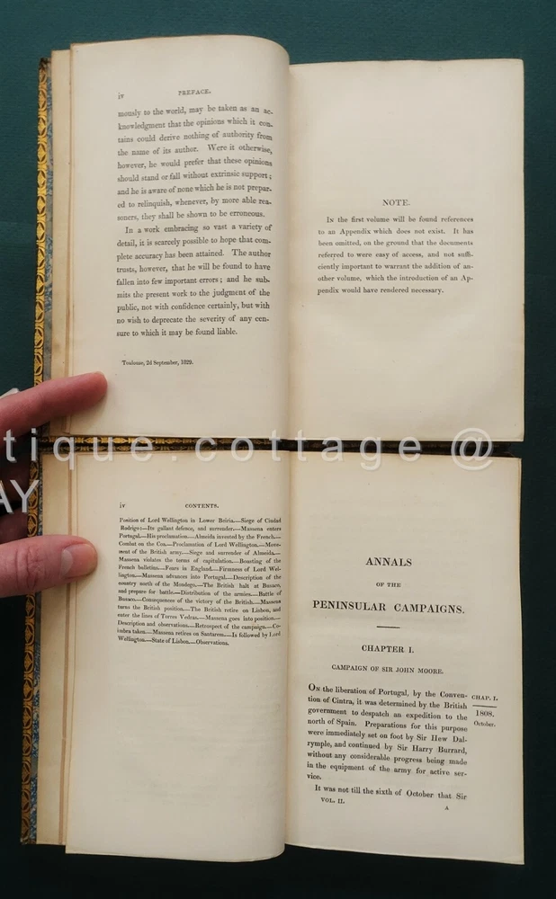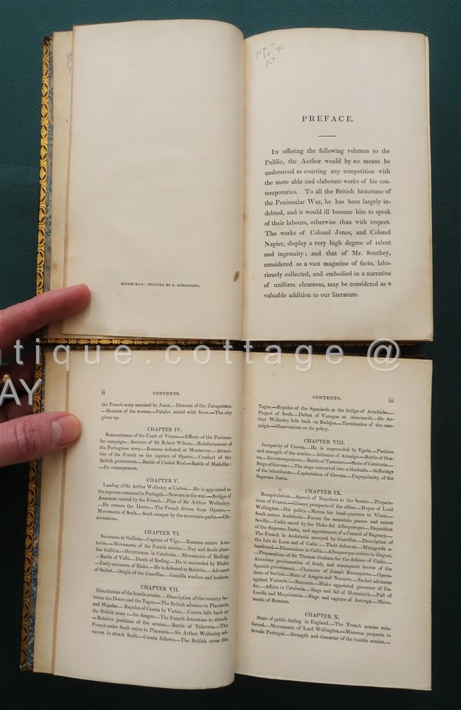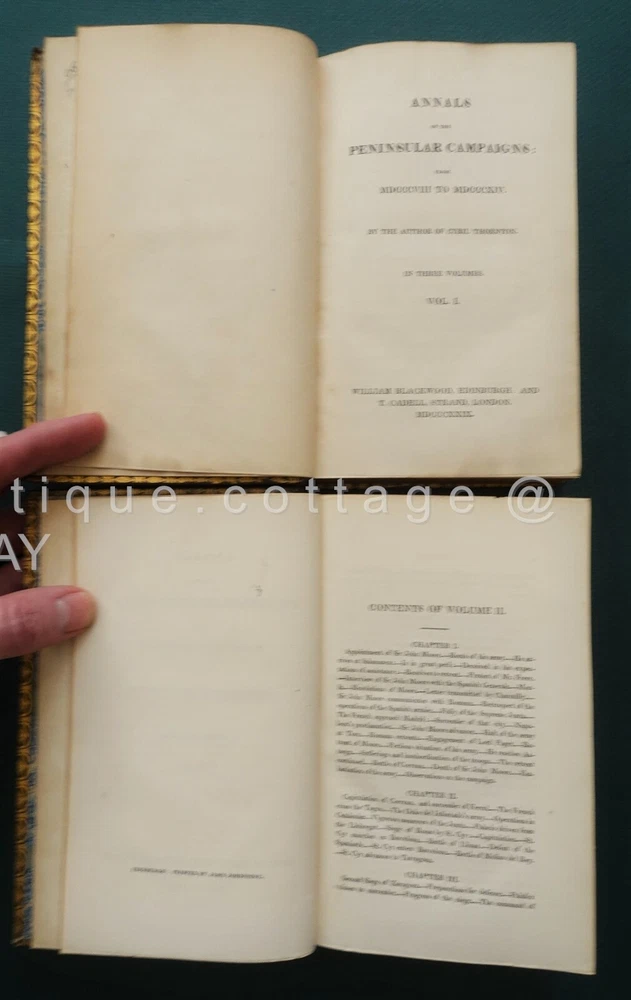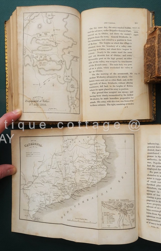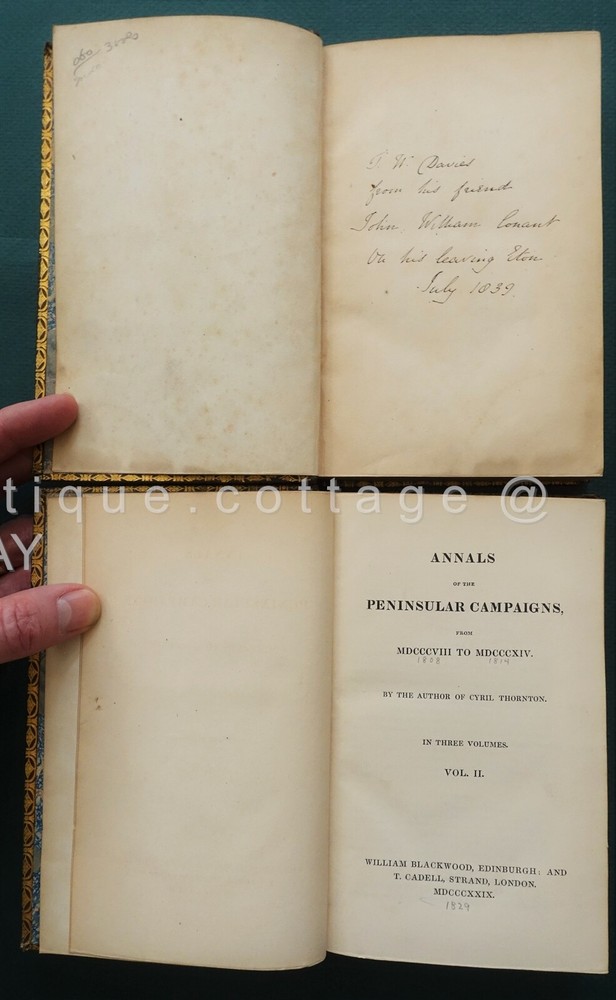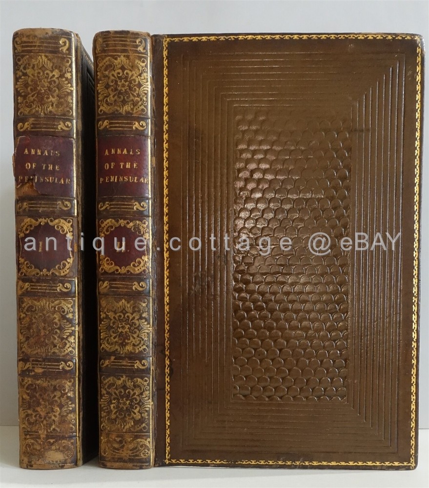 1829 antique ANNALS PENINSULAR CAMPAIGNS MAPS gardner dwindell pond bookplate SCROLL DOWN for MORE PHOTOS in DESCRIPTION Click HERE to view or search ANTIQUE.COTTAGE listings. This listing is for the 2 volume books. This is volume 1 and 2 only of a set of 3. ANNALS of the PENINSULAR CAMPAIGNS by the author of Cyril Thornton (Hamilton, Thomas), William Blackwood, Edinburgh: and T. Cadel, Strand London. Leather over board hardcovers. They measure approx 6.75"x4.25". Shiny gold page edges on 3 sides. Overall good and tight binding. There is a dampstain on bottom of one corner and other antique wear as shown. Inside inscription is handwritten: T. W. Davies from his friend John William Conant on his leaving Eton July 1839 CONDITION : See listing description and photos. - International buyers are responsible to pay VAT or other Taxes to their countries as required. - eBAY collects and remits sales tax on behalf of several states. If you are a dealer, you can write to eBay to file a form to become tax exempt. LOC: LOC2: BOOKSHELF16-TM Powered by SixBit's eCommerce Solution