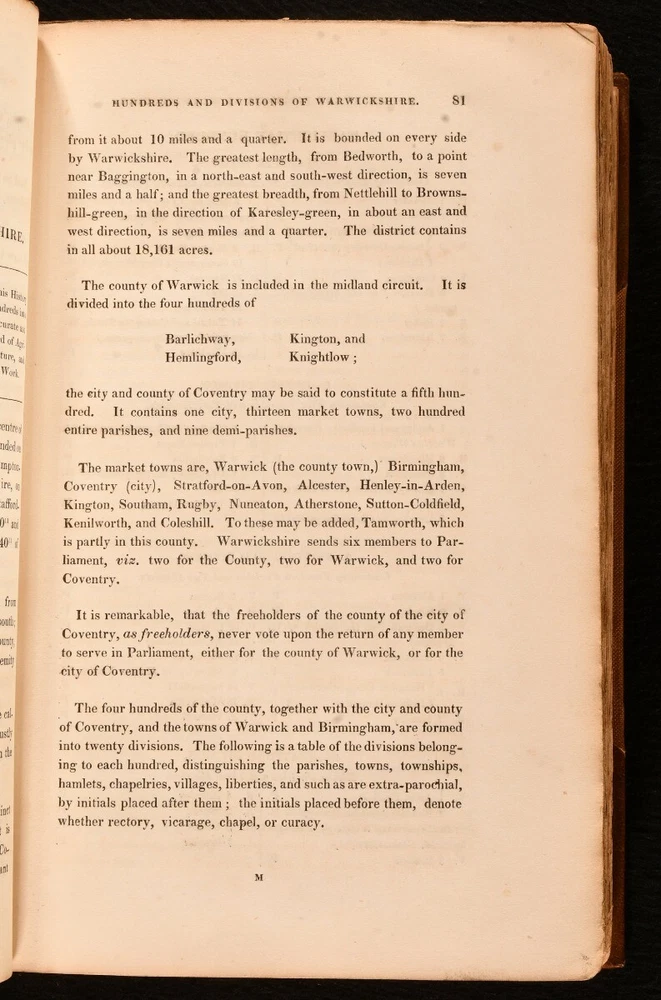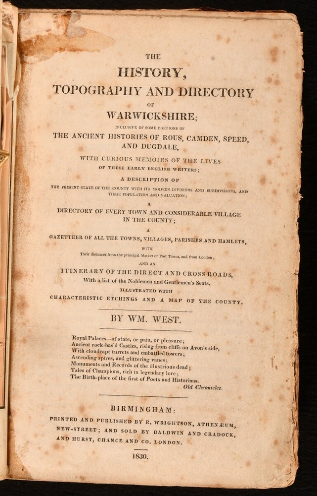 Click here to see our other books! The History, Topography and Directory of Warwickshire William West 1830 R. Wrightson; Baldwin and Cradock; Hurt, Chance and Co : Birmingham; London 9" by 6" [14], xiii, [1], 800pp SUMMARY The first edition of this extensive history on William West, an illustrated work which includes an extensive directory on Warwickshire. Colour Plates,First Edition,Folding Maps,Illustrated,Leather Binding Overall Condition: Very Good This book weighs 1.5 KG when packed UK Postage: £ 3.99 US Postage: £ 23.99 EU Postage : £ 18.99 European Postage: £ 19.99 Asia Postage: £ 31.99 Worldwide Postage: £ 32.99 DESCRIPTION The first edition. Illustrated with a colour folding map to the frontispiece, and six plates. Six leaves of publisher's adverts to the front, and seventeen bound throughout, two of which are folding. Collated, lacking one plate, and thirteen pages of the adverts to the front, the adverts to the rear, and some of the adverts bound throughout the work - different copies have different collations of the bound-in adverts, but it is common to see between twenty-five and twenty-seven adverts. A brilliant history of Warwickshire. William West delves deeply into the history of the county, alongside an essential and informative directory. The directory provides a unique insight into business in the first decades of the nineteenth century, during the Industrial Revolution. Also including itineraries showing different trips across the county, and concise biographies on William Camden, John Speed, and William Dugdale. CONDITION In a half morocco binding with cloth to the boards. Externally, smart , with very light rubbing to the joints. Very minor bumping to the extremities. Internally, firmly bound. Pages are lightly age-toned and generally clean with some scattered spots. The title page to page vi are working loose. Neat tape repairs to the reverse of the folding map. Overall Condition: Very Good GLOSSARY OF TERMS Overall Condition (Dustwrapper condition rating is shown after that for the book itself, where a dustwrapper is present) Fine - Very well preserved copy showing very little wear Very Good Indeed - Only one or two minor faults, really a very attractive copy Very Good - Quite a wide term meaning no major faults but probably several smaller ones often expected given the age of the book, but still a respectable copy Good - Meaning not very good. Some more serious faults as will be described in the condition report under 'condition' Good Only - Meaning one or more faults that could really do with repair Fair - As with good only above but with other faults leaving a compromised copy even after repair Poor - Really bad and possibly seriously incomplete. We only sell books in this condition where their rarity or value makes them attractive none the less. Major defects will be described. GUARANTEE We offer a full money back guarantee on our descriptions. Please ask for details and conditions. We prefer PAYPAL. If you pay via PAYPAL we will post the item off the same or the next working day with the postage you have selected. Please note we cannot accept USD cheques
