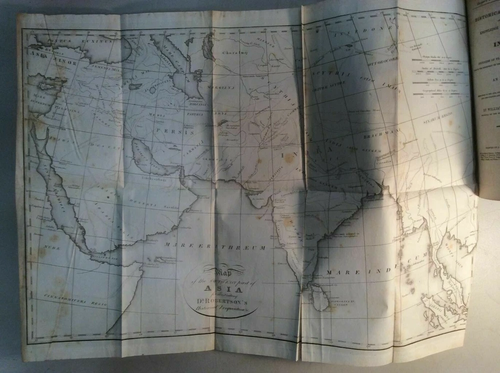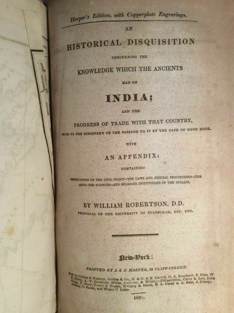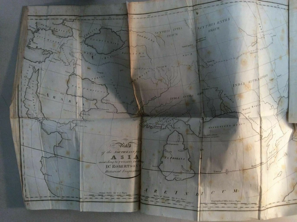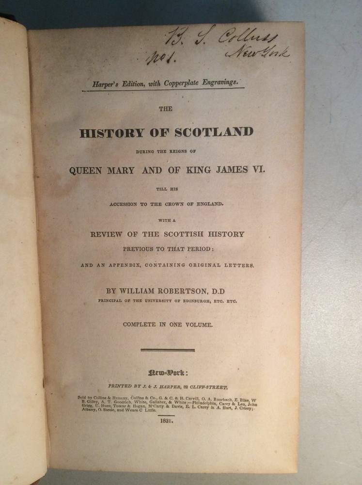 Attention Collectors!!! You are bidding on a super rare antique hardcover book. This book contains two very scarce titles in this one volume. The first title in the book is: The History of Scotland, During the Reigns of Queen Mary and King James VI. Till His Accession to the Crown of England : with a Review of the Scottish History Previous to that Period: and an Appendix Containing Original Letters. By William Robertson, Principal of the University of Edinburgh. Printed by J & J Harper, 1831. This title contains 460 pages. There are two copperplate engravings at the front of the book. The second title in the book is: An Historical Disquisition Concerning the knowledge Which the Ancients Had of India; Progress of Trade With That Country, Prior to the Discovery of the Passage to It By The Cape of Good Hope. With an Appendix Containing Observations on the Civil Policy - the Laws and Judicial Proceedings - The Arts - the Sciences - and Religious Institutions of the Indians. By William Robertson, Principal of the University of Edinburgh. Printed by J & J Harper, 1831. This title contains 146 pages. It also has two large fold-out maps of Asia. The maps measure approximately 14" by 20". They remain in very good condition with no tears. This is an extremely rare book. Condition: Book is fully bound in leather. Has four raised bands on spine. The title label on spine is gone. Covers firmly attached with no splitting or cracking of hinges. The leather binding remains in very good condition. All pages are clean and tightly bound with light foxing. Heavier foxing to preliminary pages. Previous owner name on first title page. There is no other writing in book and no previous owner bookplates. The printing of this book was a limited printing as it was printed and distributed only to the booksellers listed at the bottom of the title page and was not available for general public distribution, thus making this book very rare and difficult to find and it would have been printed in significantly lesser quantity. The book remains in overall very good condition. Quite a rare and collectible book! Would make a super addition to a collection. Great gift idea! (Inventory: 98-A) Track Page Views With Auctiva's FREE Counter