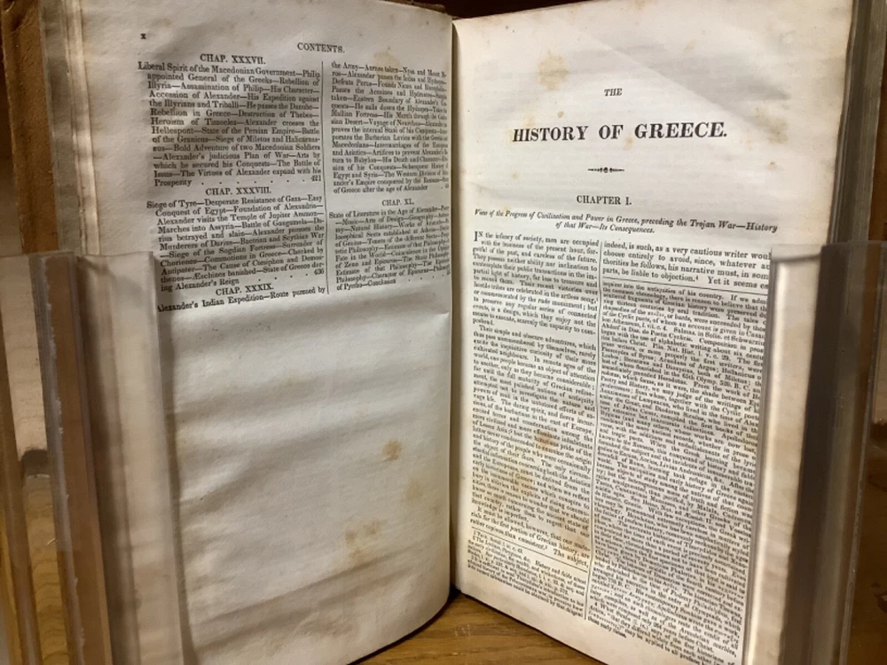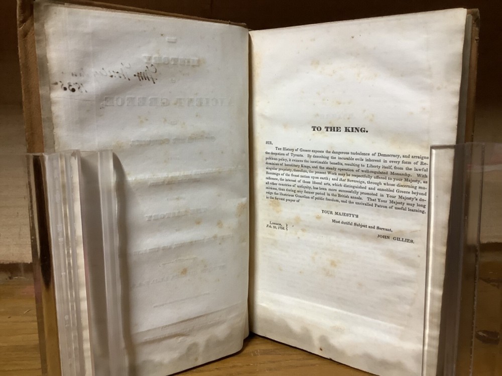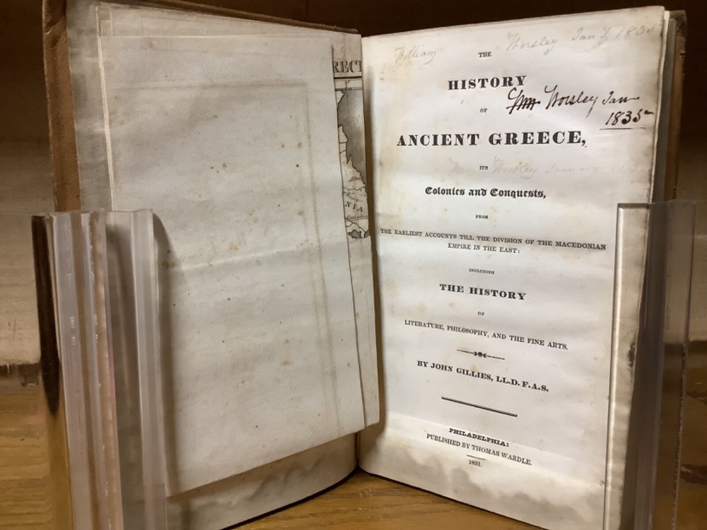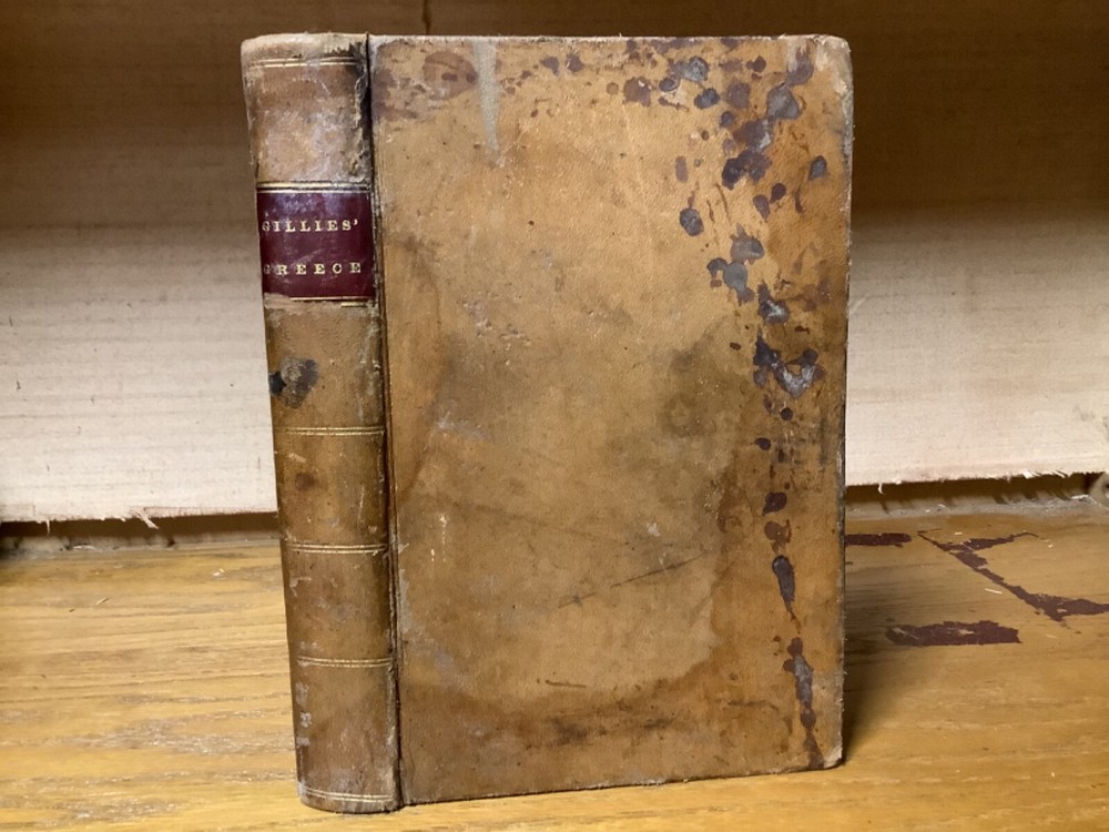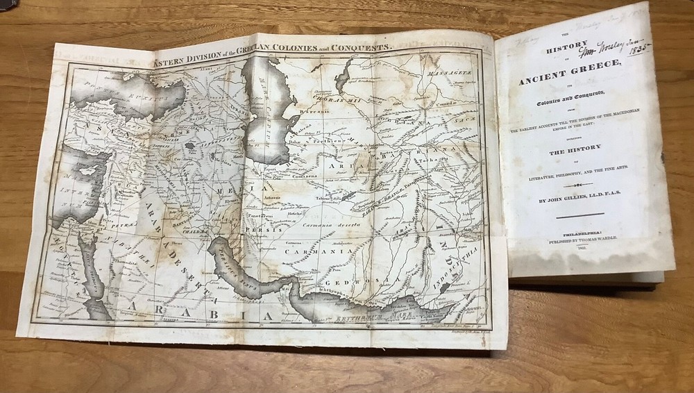 The History of Ancient Greece, its Colonies and Conquests from the Earliest Accounts Till the Division of the Macedonian Empire in the East: Including the History of Literature, Philosophy, and the Fine Arts. By John Gillies and printed in Philadelphia by Thomas Wardle. 1831, 492 pp, 9” x 6”, 8vo, hardcover full leather. In good condition, with assorted staining, rubbing, and inscription remnants to boards. Light loss to title label on spine. Hinges remain in good condition and text block remains bound well. Some staining to pages, primarily at rear. Includes frontispiece foldout of Grecian colonies and conquests in Asia Minor, with light rubbing and wear along edges and folds. General age-related toning to pages, along with periodic foxing and wear. Please see photographs and ask any questions prior to purchasing. A scarce piece on Ancient Greek history by Scottish historian John Gillies (1747-1836). The piece contains a strong bias in favor of monarchy, and criticizes democratic principles evident in parts of Greece throughout its ancient history. COLC1831ABDB-0324-aj1183