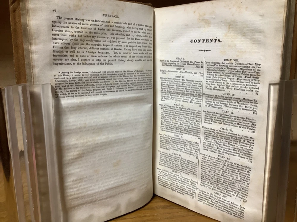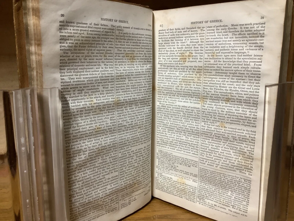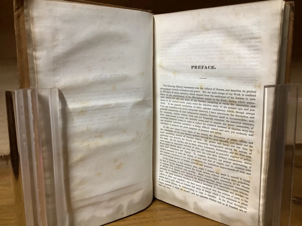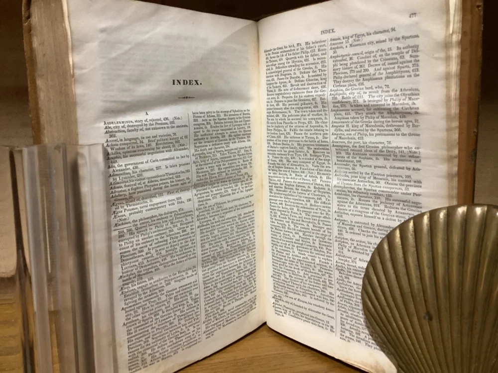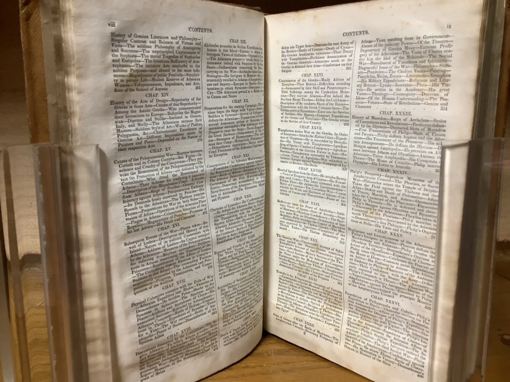 The History of Ancient Greece, its Colonies and Conquests from the Earliest Accounts Till the Division of the Macedonian Empire in the East: Including the History of Literature, Philosophy, and the Fine Arts. By John Gillies and printed in Philadelphia by Thomas Wardle. 1831, 492 pp, 9” x 6”, 8vo, hardcover full leather. In good condition, with assorted staining, rubbing, and inscription remnants to boards. Light loss to title label on spine. Hinges remain in good condition and text block remains bound well. Some staining to pages, primarily at rear. Includes frontispiece foldout of Grecian colonies and conquests in Asia Minor, with light rubbing and wear along edges and folds. General age-related toning to pages, along with periodic foxing and wear. Please see photographs and ask any questions prior to purchasing. A scarce piece on Ancient Greek history by Scottish historian John Gillies (1747-1836). The piece contains a strong bias in favor of monarchy, and criticizes democratic principles evident in parts of Greece throughout its ancient history. COLC1831ABDB-0324-aj1183