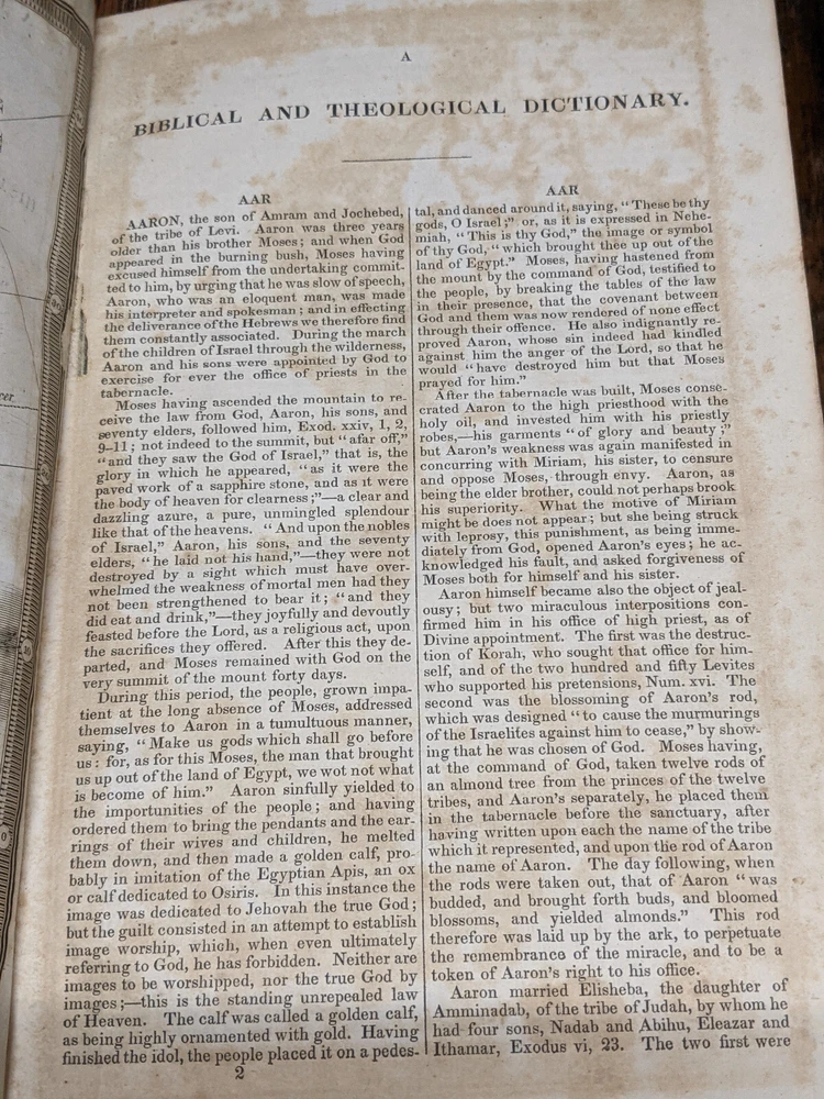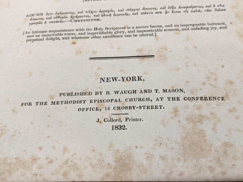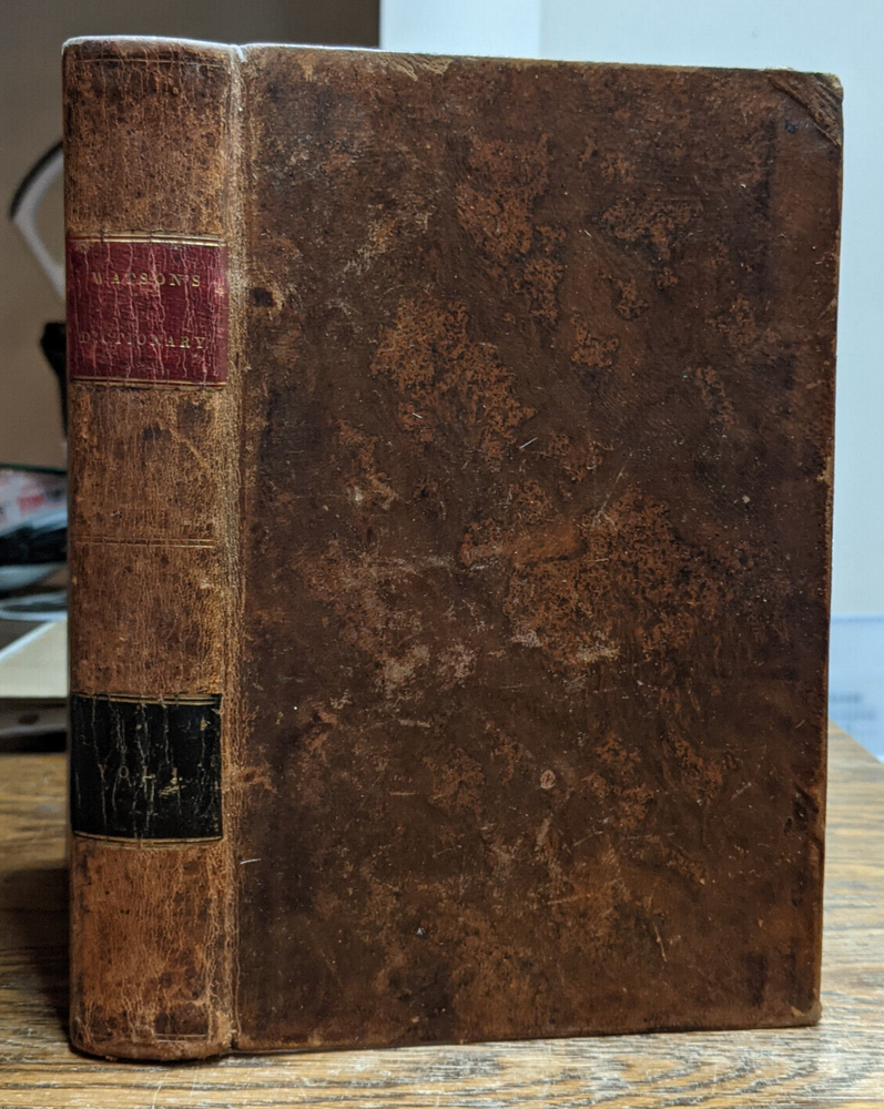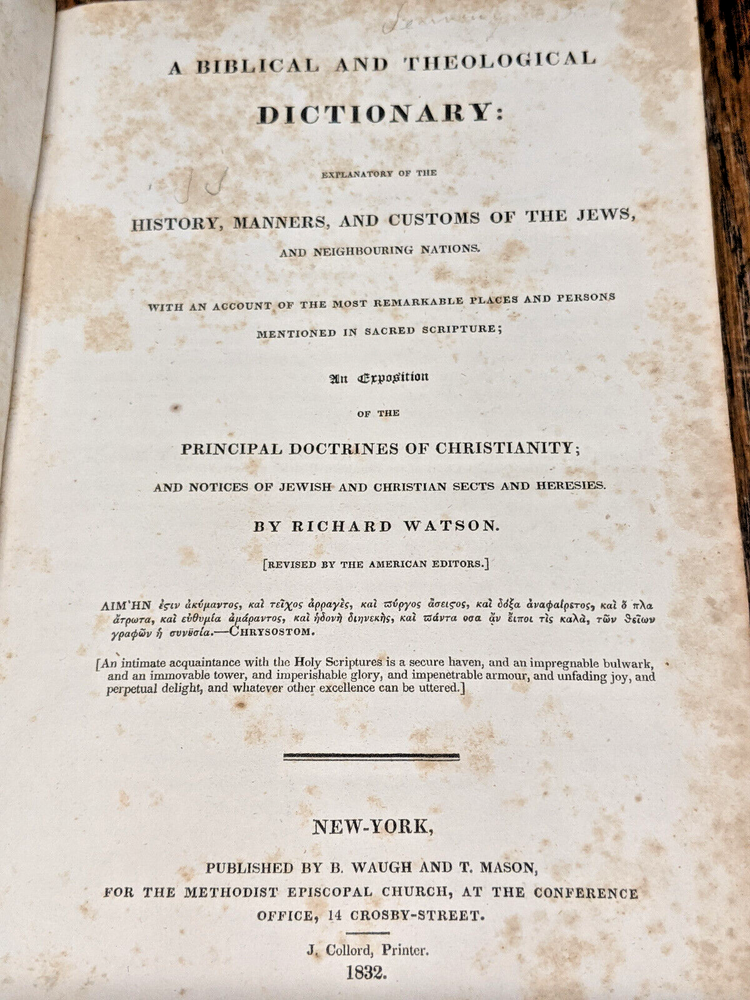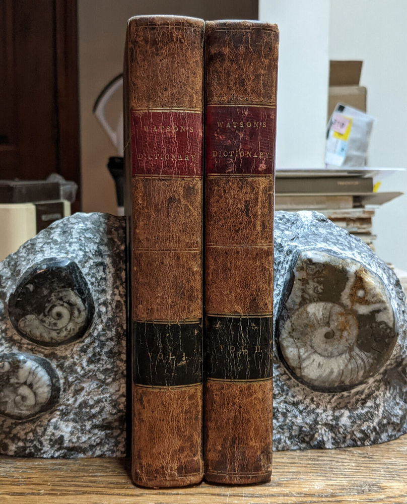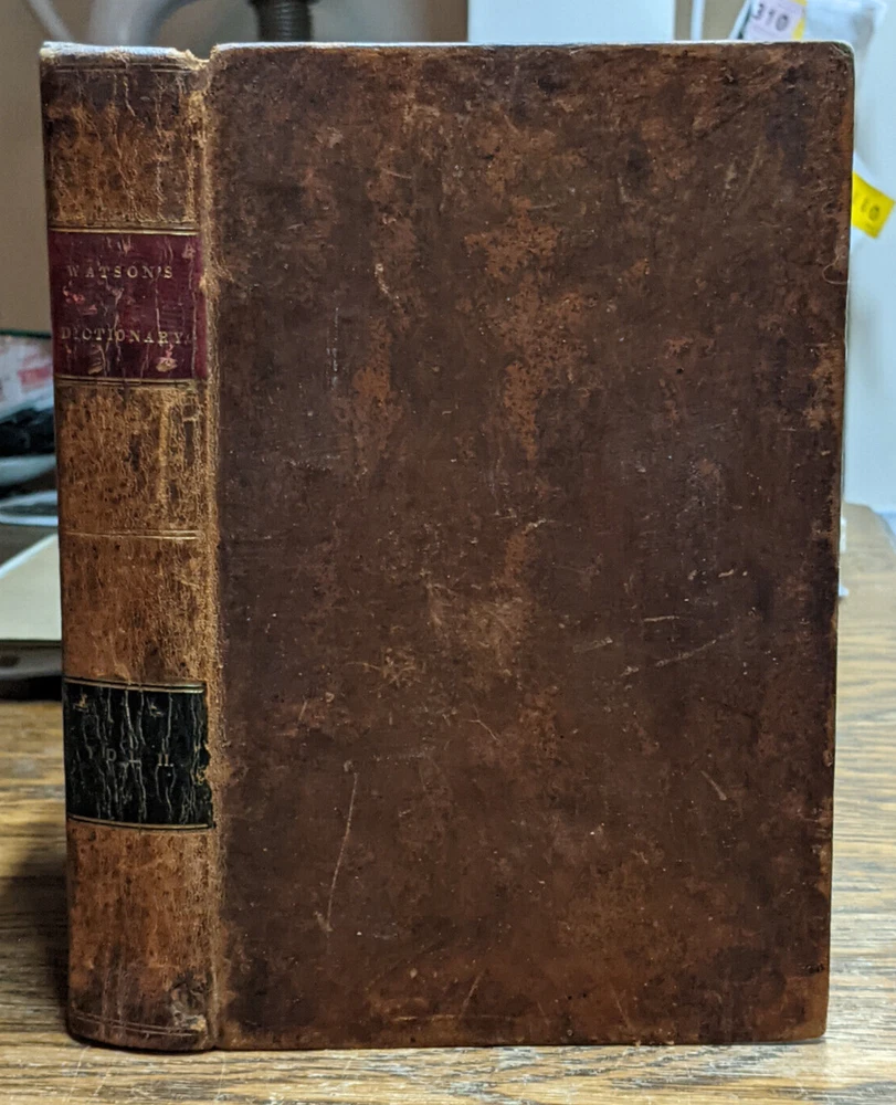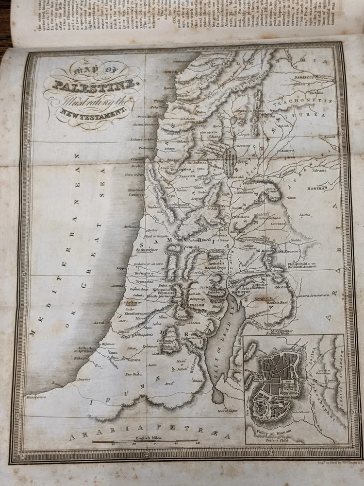 Rare "A Biblical And Theological Dictionary: Explanatory of the History, Manners, And Customs Of The Jews, and Neighboring Nations". With an Account of the Most Remarkable Places and Persons Mentioned in Sacred Scriptures; In Exposition of the Principal Doctrines of Christianity...By Richard Watson. Complete in Two Volumes. New-York: Published By B. Waugh And T. Mason. 1832. First American Edition. Both volumes publisher's full leather covered boards, gilt titles on red morocco and black leather labels on spines. Vol. I: 496 pp. Vol. II: 1,003 pp. Measures 9 1/4" x 6 1/4". Vol. I contains 2 fold-out maps, Vol. II contains 3 fold-out maps. 5 maps in total. These steel-plate engraved maps are amazing in detail. Rare set! Both volumes in very good condition. Intact. Pages are clean & bright. Pages display scattered minor to moderate foxing. Heavy foxing on endpapers. No musty or loose pages. Boards are clean with solid hinges. Minor to moderate rubbing/wear on corners, edges, and main surface of boards. Smoke-free home.
