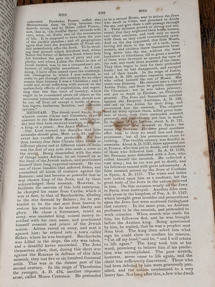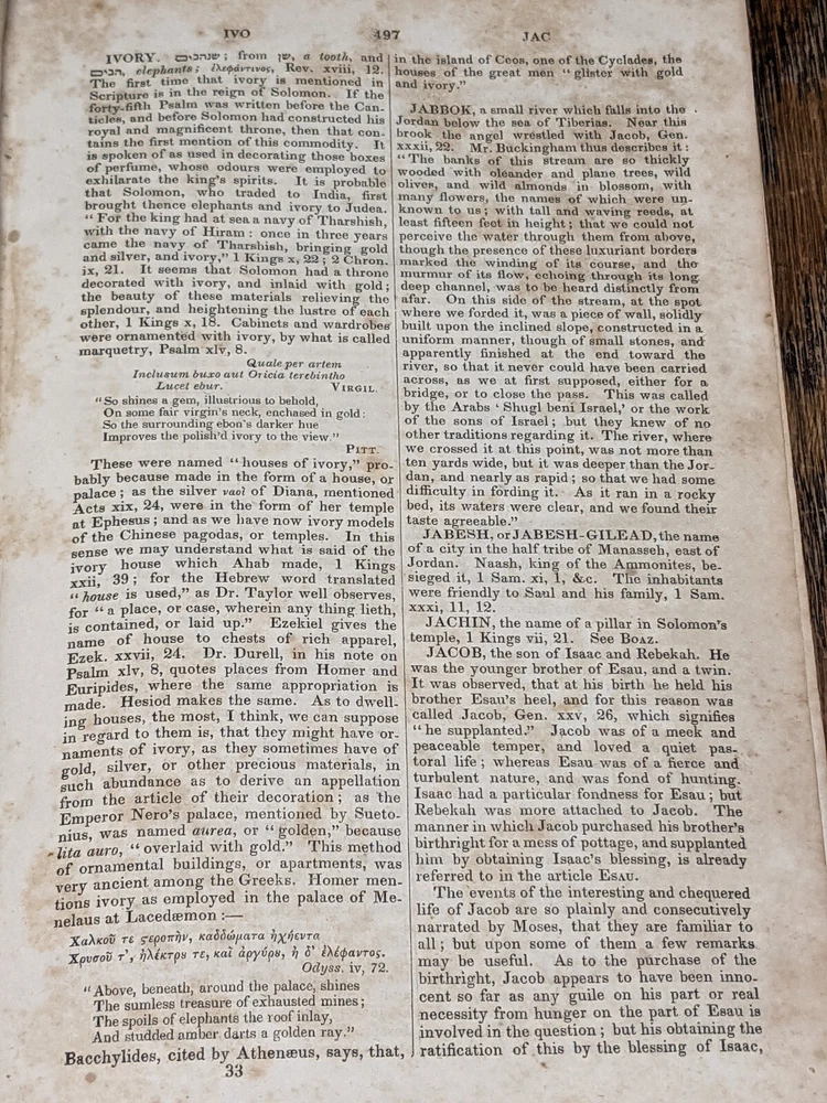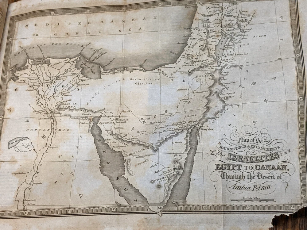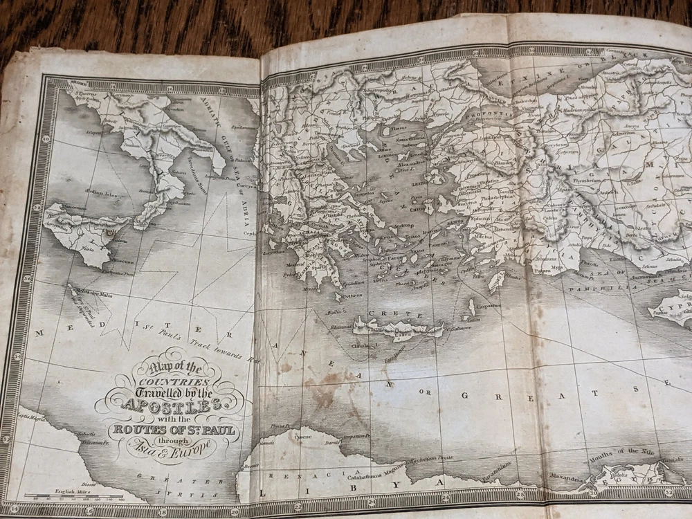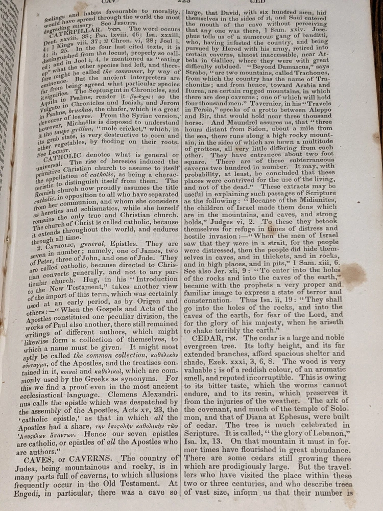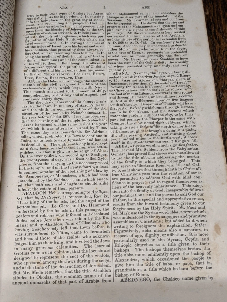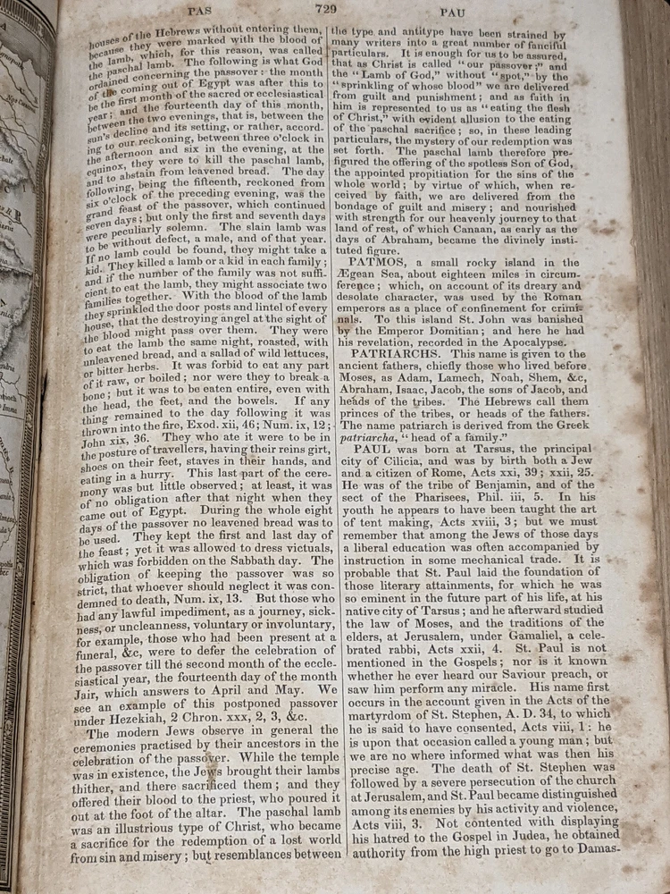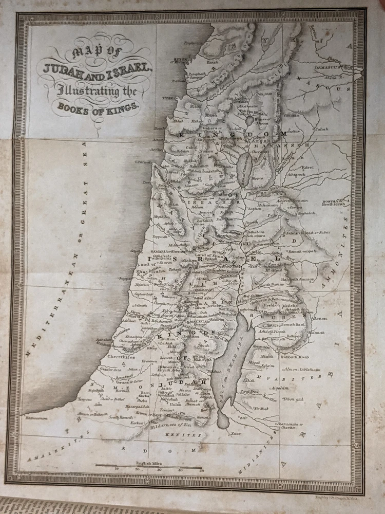 Rare "A Biblical And Theological Dictionary: Explanatory of the History, Manners, And Customs Of The Jews, and Neighboring Nations". With an Account of the Most Remarkable Places and Persons Mentioned in Sacred Scriptures; In Exposition of the Principal Doctrines of Christianity...By Richard Watson. Complete in Two Volumes. New-York: Published By B. Waugh And T. Mason. 1832. First American Edition. Both volumes publisher's full leather covered boards, gilt titles on red morocco and black leather labels on spines. Vol. I: 496 pp. Vol. II: 1,003 pp. Measures 9 1/4" x 6 1/4". Vol. I contains 2 fold-out maps, Vol. II contains 3 fold-out maps. 5 maps in total. These steel-plate engraved maps are amazing in detail. Rare set! Both volumes in very good condition. Intact. Pages are clean & bright. Pages display scattered minor to moderate foxing. Heavy foxing on endpapers. No musty or loose pages. Boards are clean with solid hinges. Minor to moderate rubbing/wear on corners, edges, and main surface of boards. Smoke-free home.