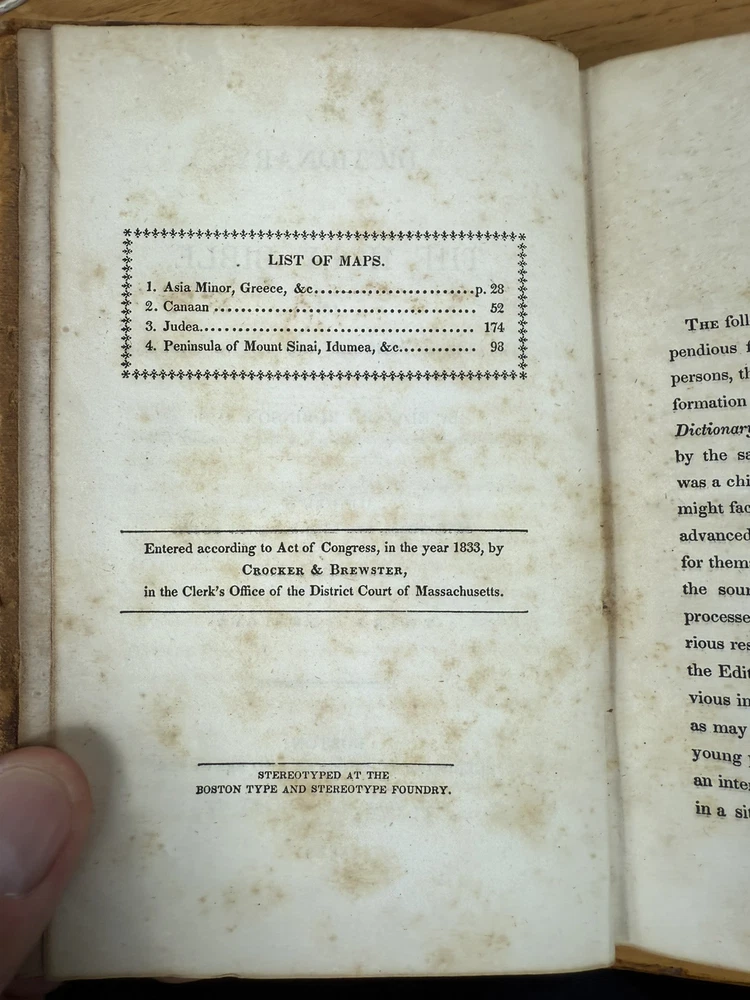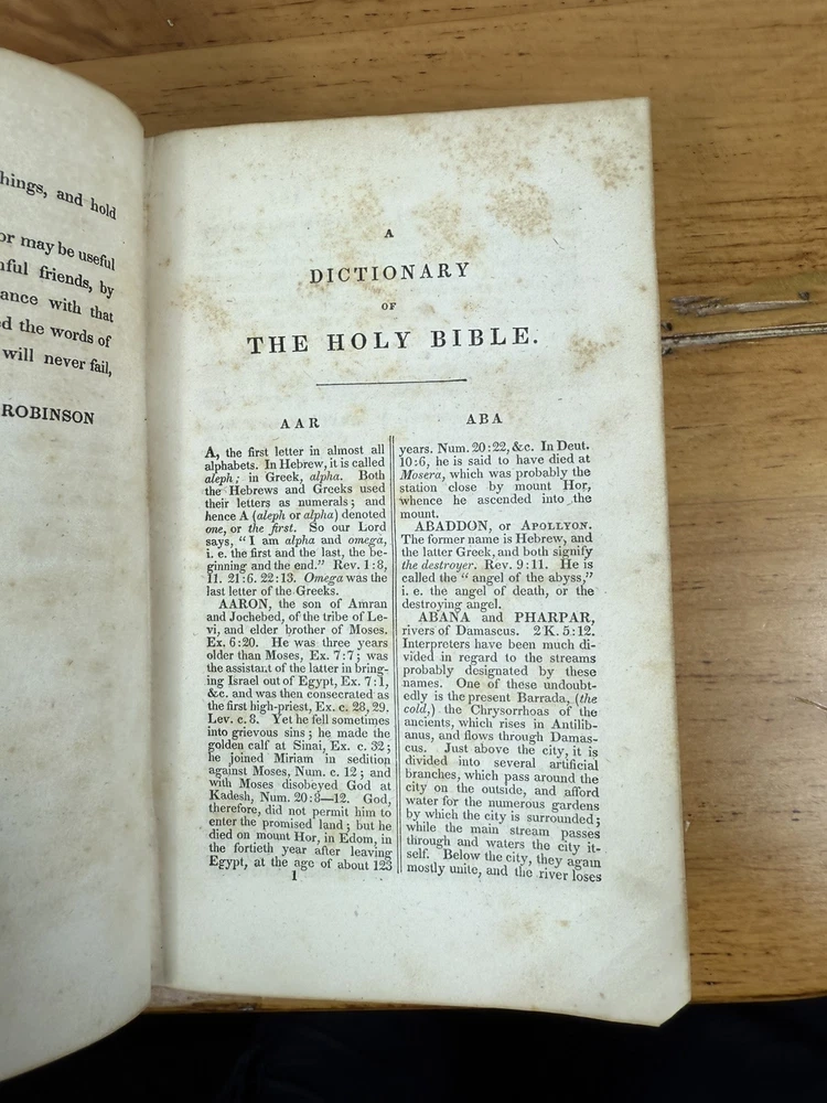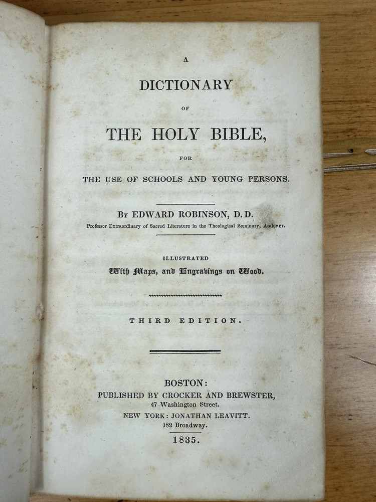 Up for sale is A Dictionary of the Holy Bible for the use of schools and young persons by Edward Robinson, D.D. Professor Extraordinary of Sacred Literature in the Theological Seminary, Andover. Illustrated with Maps, and Engravings on Wood. Third Edition. Boston: Published by Crocker and Brewster 47 Washington Street. New York: Jonathan Leavitt 182 Broadway. 1835 With 4 Maps. Please see all photos for the book you will receive.
