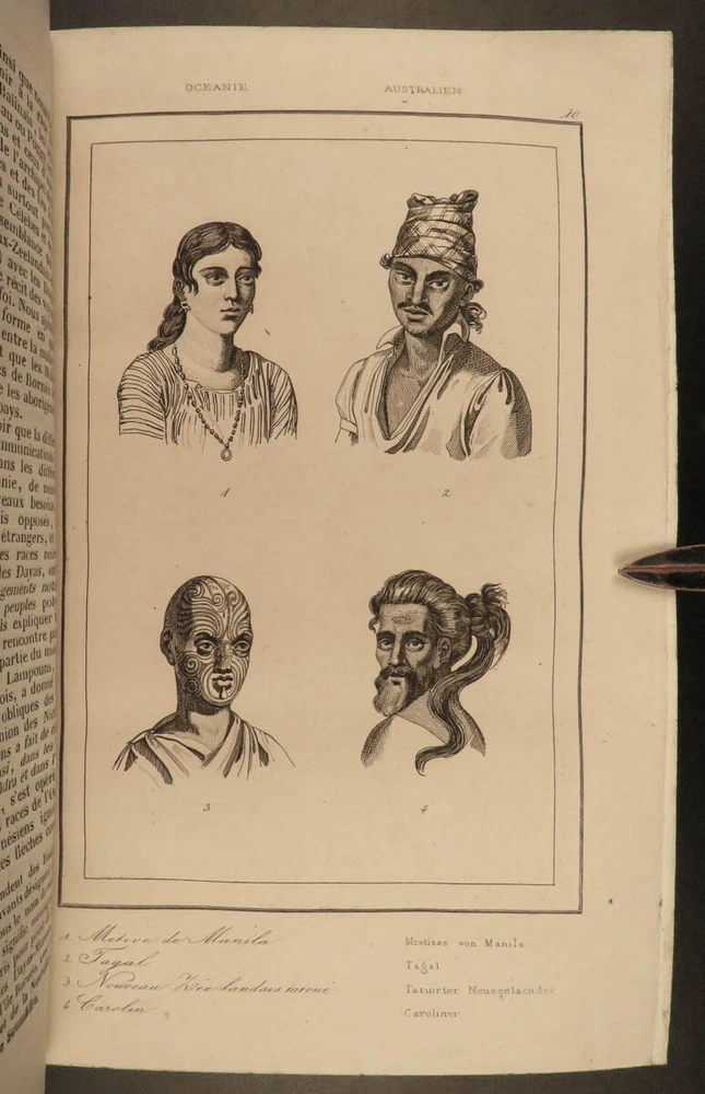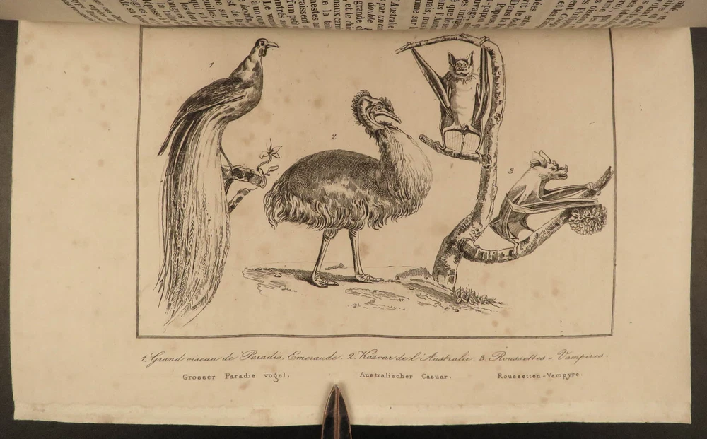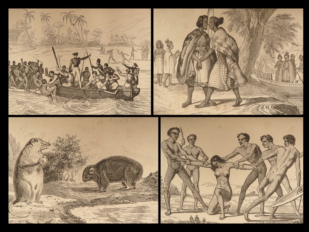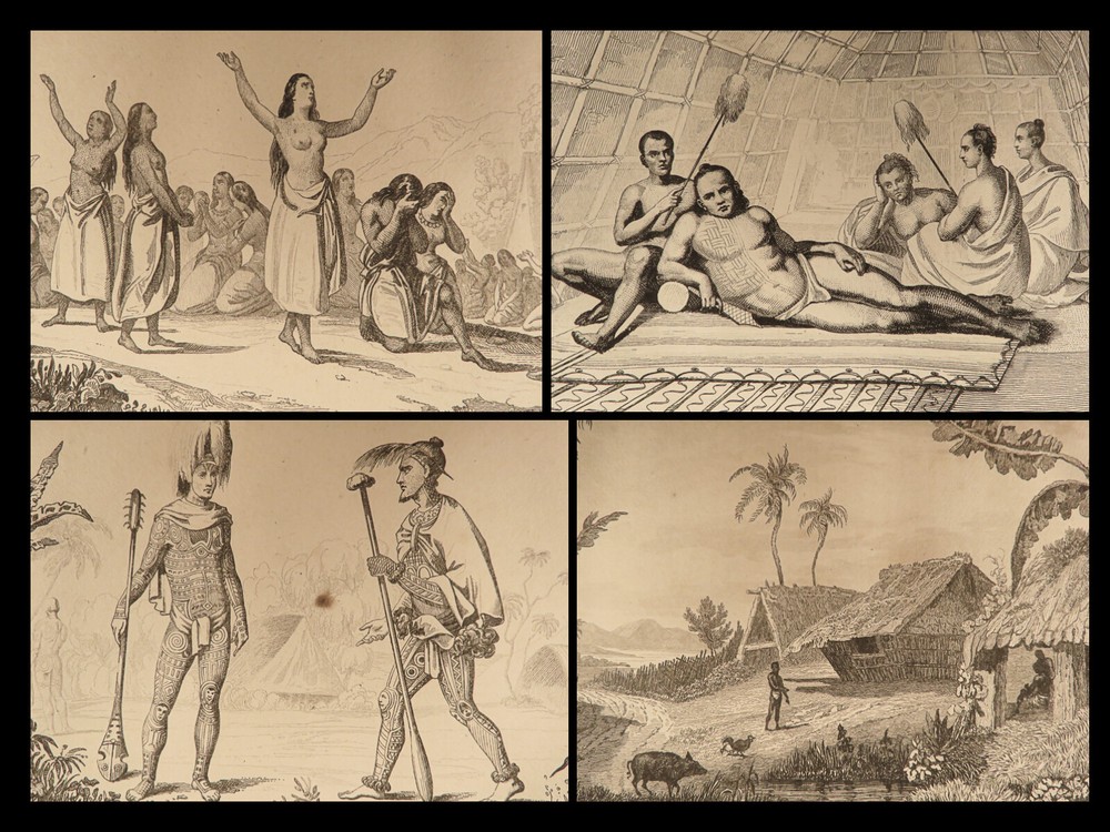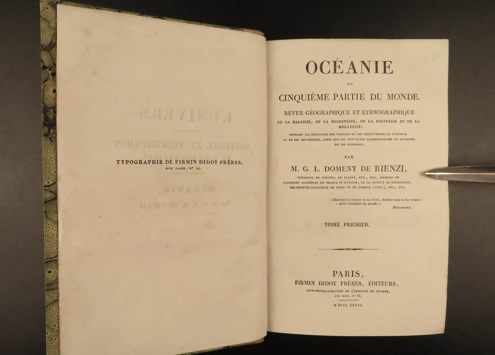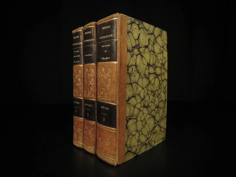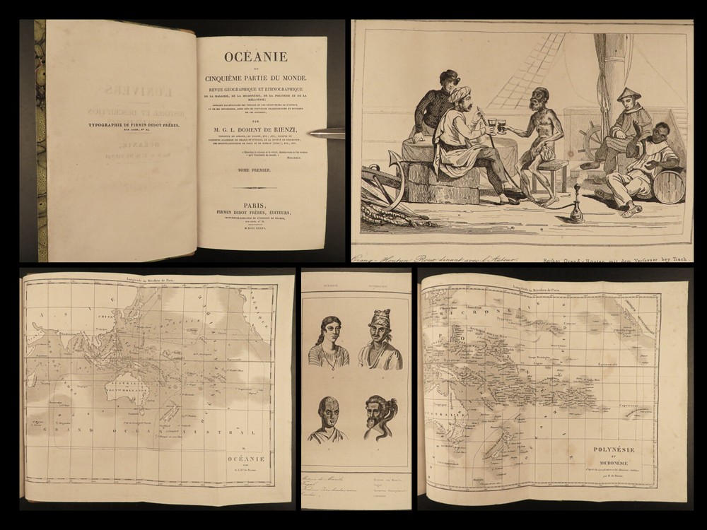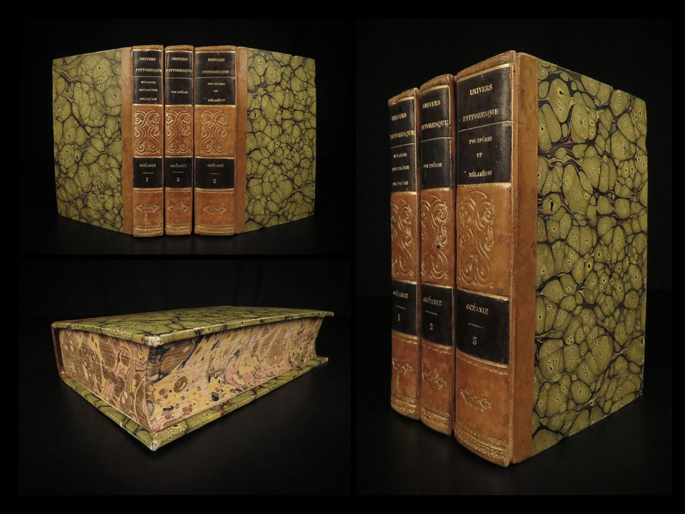 1836 1 ed Oceania Voyages Malaysia Polynesia Maps Captain Cook Anson Rienzi 3v Louis de Rienzi was a French 19 th -century traveler and author who following his personal voyages wrote the 1836 masterwork, ‘ Oceania, or Fifth Part of the World .’ Contained within is a compilation of the voyages of James Cook, George Anson, and Bougainville which are then supplemented by Rienzi’s own travels. According to Nunc Broc this work was “…quite successful. The book makes more room for history than for geography. If the exotic flora and fauna are not neglected, the author is particularly interested in customs of the natives.” This set features folding maps of the South Pacific Islands including Australia, Malaysia, Borneo as well as illustrated views of native people and their customs. It also includes original musical scores with text. Item number: #40097 Price: $750 RIENZI, Gregoire Louis Domeny de Océanie, ou, Cinquième partie du monde. Revue géographique et ethnographique de la Malaisie, de la Micronésie, de la Polynésie et de la Mélanésie ; offrant les résultats des voyages et des découvertes de l'auteur et de ses devanciers, ainsi que ses nouvelles classifications et divisions de ces contrées, par M.G.L. Domeny de Rienzi Paris : Firmin Didot freres, Editeurs…, 1836-38. First edition. Details : · Collation: Complete with all pages; 3 volumes o Vol. 1 – [4], 399, [3] o Vol. 2 – [4], 397, [3] o Vol. 3 – [4], 635, [5] o 304 plates throughout § 5 folding plates § 299 engravings · Reference: Nunc Broc, Dictionary of French Explorers , p.335 · Language: French · Binding: Leather; tight and secure · Size : ~8.25in X 5.25in (21cm x 13.5cm) Our Guarantee: Very Fast. Very Safe. Free Shipping Worldwide. Customer satisfaction is our priority! Notify us with 7 days of receiving, and we will offer a full refund without reservation! 40097