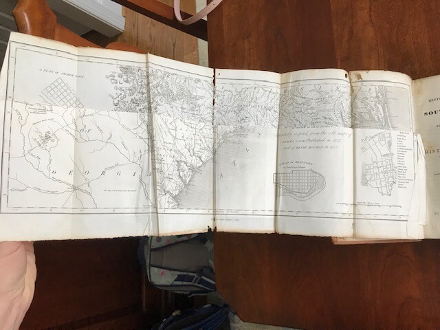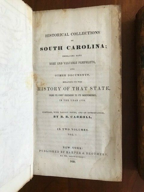 Historical Collections of South Carolina Embracing Many Rare and Valuable Pamphlets and Other Documents, Relating to the History of That State from its Discovery Until its Independence in 1776. Two volumes By B.R. Carroll Published: Harper & Brothers, 1836. Two volumes. [2],lxxx,[9]-533;576pp. includes the folding map. Full leather binding. Boards loosening and leather is a bit dry/dusty. Light scattered foxing but internally quite clean. No Ex-Lib. I did not unfold the map entirely for the picture. It appears to be complete, but is fragile along the fold lines. The map is very often missing from the set, so it is uncommon to see it present in this set. An excellent collection of important and rare foundation works in the history of South Carolina. An interesting early attempt to bring together and reprint rare pamphlets for the history of a state. Begins with a brief description of the province of Carolina from 1666, originally printed for Robert Horne, and continues with over thirty additional works from the 17th and 18th centuries. A storehouse of early works relating to South Carolina. HOWES C178 I've done my best to describe the books, but if you have additional questions, please don't hesitate to send me an e-mail.