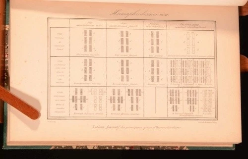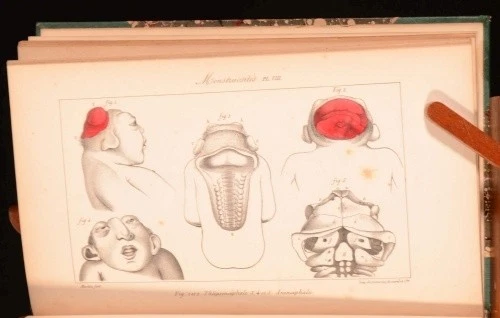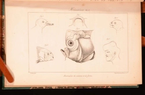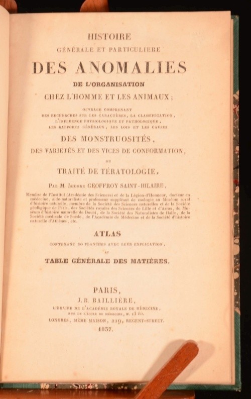 Click here to see our other books! Histoire Generale et Particuliere Des Anomalies de L'Organisation Chez L'Homme et Les Animaux Atlas Contenant 20 Planches Avec Leur Explication, et Table Generale Des Matieres Isidore Geoffroy Saint-Hilaire 1837 J. B. Bailliere : London 9.5" by 6" 8, xx, xxpp SUMMARY The scarce atlas and table of contents to Isidore Geoffroy Saint-Hilaire's influential teratological work, with twenty engraved plates. Folding Plates,Illustrated,Scarce Overall Condition: Good Only This book weighs 0.5 KG when packed UK Postage: £ 3.99 US Postage: £ 15.99 EU Postage : £ 13.99 European Postage: £ 14.99 Asia Postage: £ 18.99 Worldwide Postage: £ 19.99 DESCRIPTION First edition. Atlas volume. Being volume four of a four volume set. With twenty plates; nineteen illustrating birth abnormalities in humans and animals and one with a table titled 'Hermaphrodismes'. Collated complete Isidore Geoffroy Saint-Hilaire (December 16, 1805 – November 10, 1861) was a French zoologist and an authority on deviation from normal structure. He coined the term ethology. He was born in Paris, the son of Etienne Geoffroy Saint-Hilaire. In his earlier years he showed an aptitude for mathematics, but eventually he devoted himself to the study of natural history and of medicine, and in 1824 he was appointed assistant naturalist to his father. In 1832-1837 he published his great teratological work in three volumes, accompanied by this volume containing an explanation of the plates, twenty pages of medical illustrations and a table of contents referring to all four volumes. With previous owner's bookplate to front pastedown of one G. N. J. Sommer, MD. of Trenton, New Jersey. CONDITION Expertly rebound in a half cloth binding with marbled paper covered boards. Externally, generally smart with very slight shelfwear and bumping to extremities. Internally, firmly bound. Loss to rear pastedown, though this can be easily repaired. Some details of one plate have been neatly hand coloured. Slight age-toning to many pages, though most plates remain bright. Slight marginal tidemarks to last few pages. Some scattered spotting throughout as usual. Overall Condition: Good Only GLOSSARY OF TERMS Overall Condition (Dustwrapper condition rating is shown after that for the book itself, where a dustwrapper is present) Fine - Very well preserved copy showing very little wear Very Good Indeed - Only one or two minor faults, really a very attractive copy Very Good - Quite a wide term meaning no major faults but probably several smaller ones often expected given the age of the book, but still a respectable copy Good - Meaning not very good. Some more serious faults as will be described in the condition report under 'condition' Good Only - Meaning one or more faults that could really do with repair Fair - As with good only above but with other faults leaving a compromised copy even after repair Poor - Really bad and possibly seriously incomplete. We only sell books in this condition where their rarity or value makes them attractive none the less. Major defects will be described. GUARANTEE We offer a full money back guarantee on our descriptions. Please ask for details and conditions. We prefer PAYPAL. If you pay via PAYPAL we will post the item off the same or the next working day with the postage you have selected. Please note we cannot accept USD cheques