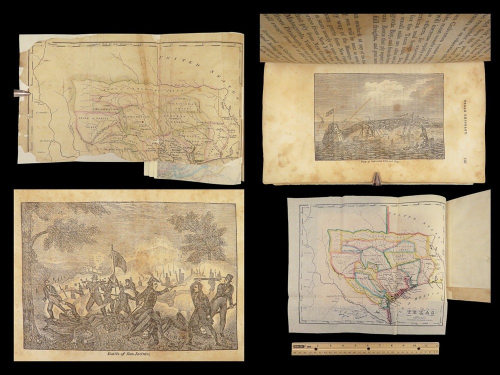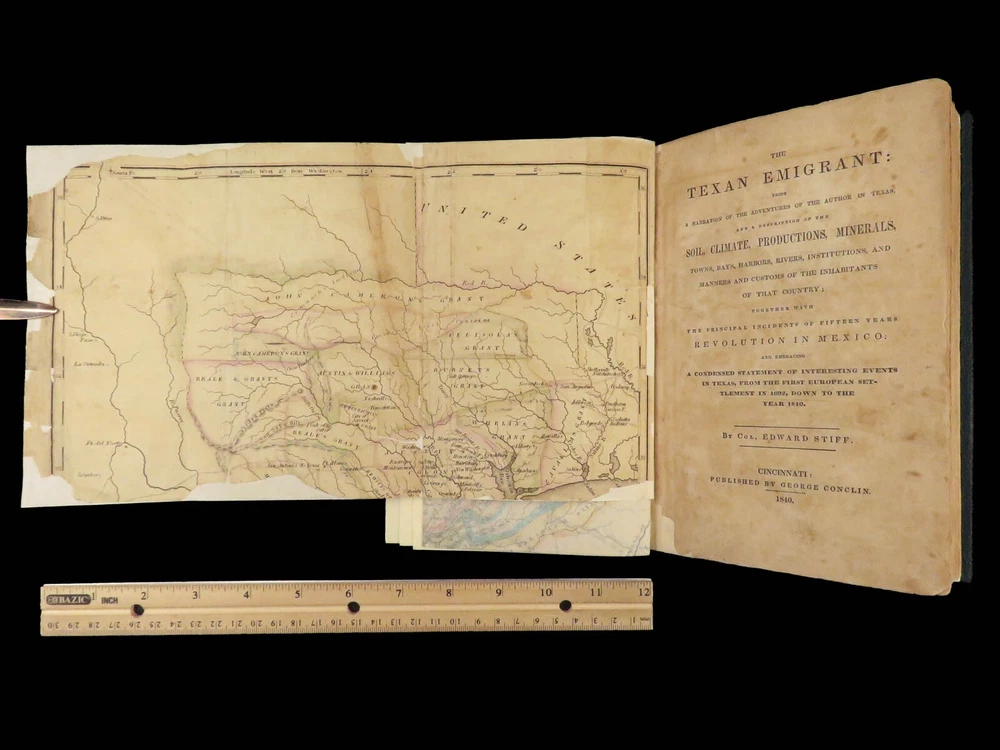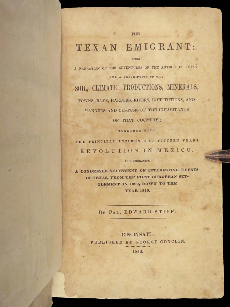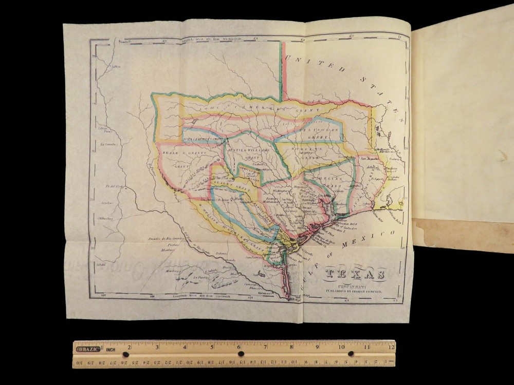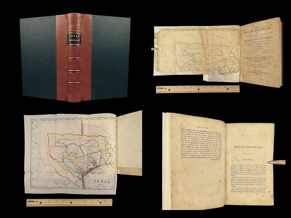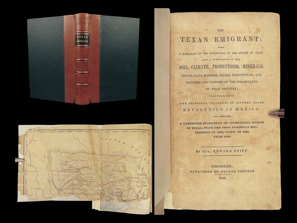 1840 TEXAS History 1 ed Edward Stiff Texan Emigrant Mexican War Alamo Mexico MAPS Edward Stiff’s “ New History of Texas ” is one of the best histories of pre-Civil War Texas. First published as ‘ The Texan Emigrant’ , this book became immensely popular throughout the 1840s. According to Howes, this book is “One of the most objective accounts of Texas affairs issued in the days of the Republic, written largely from personal knowledge. Later editions included account of the war between Mexico and the United States” Per Streeter: “Here conventional accounts of the physical features of Texas and of its cities and towns are interspersed with gossipy comments on various named individuals and on life in Texas in general, making it quite an entertaining book.” This incredibly valuable 1840 true first edition is complete with the highly desirable folding maps. In fact, this work, complete with maps, is known to have sold for $10,000 at auction within the last 3 years. Item number: #25694 Price: $2500 STIFF, Edward The Texan emigrant: being a narration of the adventures (of the author in Texas, and a description) of the soil, climate, productions, minerals Cincinnati: G. Conclin, 1840. TRUE first edition! Details : · Collation: o v, [1], 7-367, [1] o 2 folding frontispiece maps (1 present but incomplete) · References: Howes S 998; S 1005; Graff 3989; Sabin 91726; Streeter Texas 1367 · Language: English · Binding: Leather; tight and secure · Size: ~8in X 5.25in (20.5cm x 13cm) · VERY rare and desirable with auction records and price comparisons as high as $10,000 Our Guarantee: Very Fast. Very Safe. Free Shipping Worldwide. Customer satisfaction is our priority! Notify us with 7 days of receiving, and we will offer a full refund without reservation! 25694