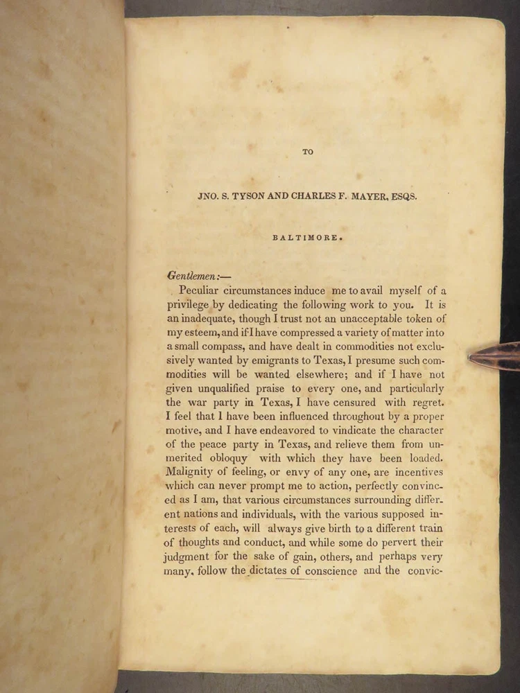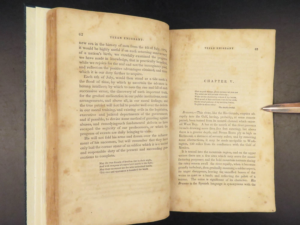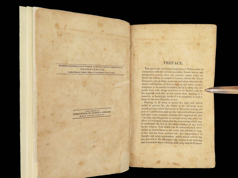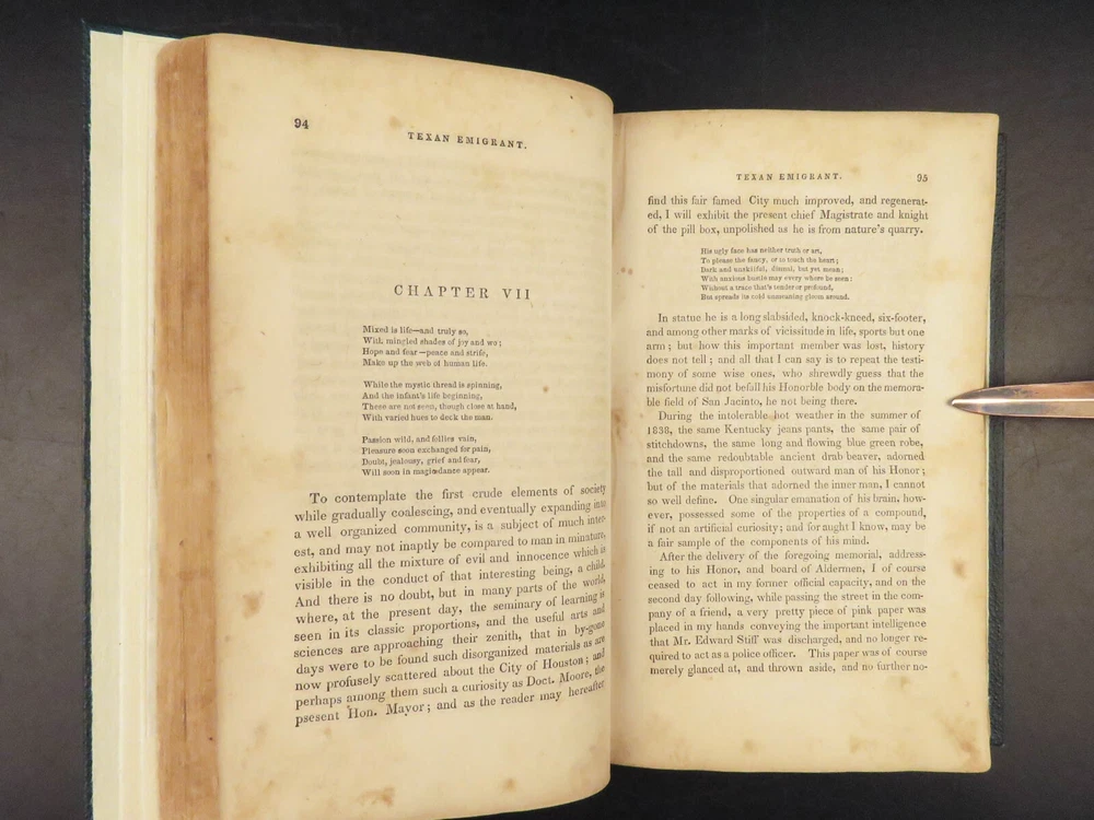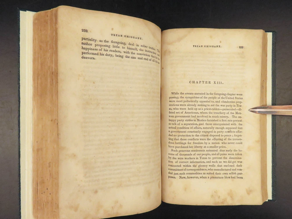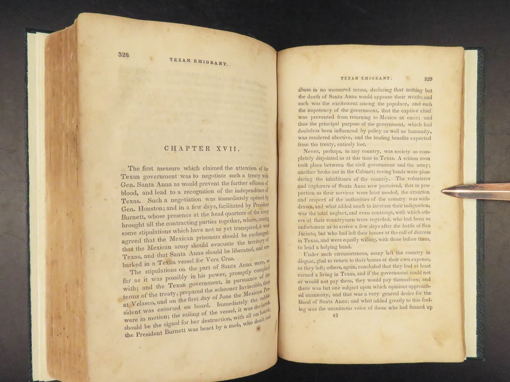 1840 TEXAS History 1 ed Edward Stiff Texan Emigrant Mexican War Alamo Mexico MAPS Edward Stiff’s “ New History of Texas ” is one of the best histories of pre-Civil War Texas. First published as ‘ The Texan Emigrant’ , this book became immensely popular throughout the 1840s. According to Howes, this book is “One of the most objective accounts of Texas affairs issued in the days of the Republic, written largely from personal knowledge. Later editions included account of the war between Mexico and the United States” Per Streeter: “Here conventional accounts of the physical features of Texas and of its cities and towns are interspersed with gossipy comments on various named individuals and on life in Texas in general, making it quite an entertaining book.” This incredibly valuable 1840 true first edition is complete with the highly desirable folding maps. In fact, this work, complete with maps, is known to have sold for $10,000 at auction within the last 3 years. Item number: #25694 Price: $2500 STIFF, Edward The Texan emigrant: being a narration of the adventures (of the author in Texas, and a description) of the soil, climate, productions, minerals Cincinnati: G. Conclin, 1840. TRUE first edition! Details : · Collation: o v, [1], 7-367, [1] o 2 folding frontispiece maps (1 present but incomplete) · References: Howes S 998; S 1005; Graff 3989; Sabin 91726; Streeter Texas 1367 · Language: English · Binding: Leather; tight and secure · Size: ~8in X 5.25in (20.5cm x 13cm) · VERY rare and desirable with auction records and price comparisons as high as $10,000 Our Guarantee: Very Fast. Very Safe. Free Shipping Worldwide. Customer satisfaction is our priority! Notify us with 7 days of receiving, and we will offer a full refund without reservation! 25694