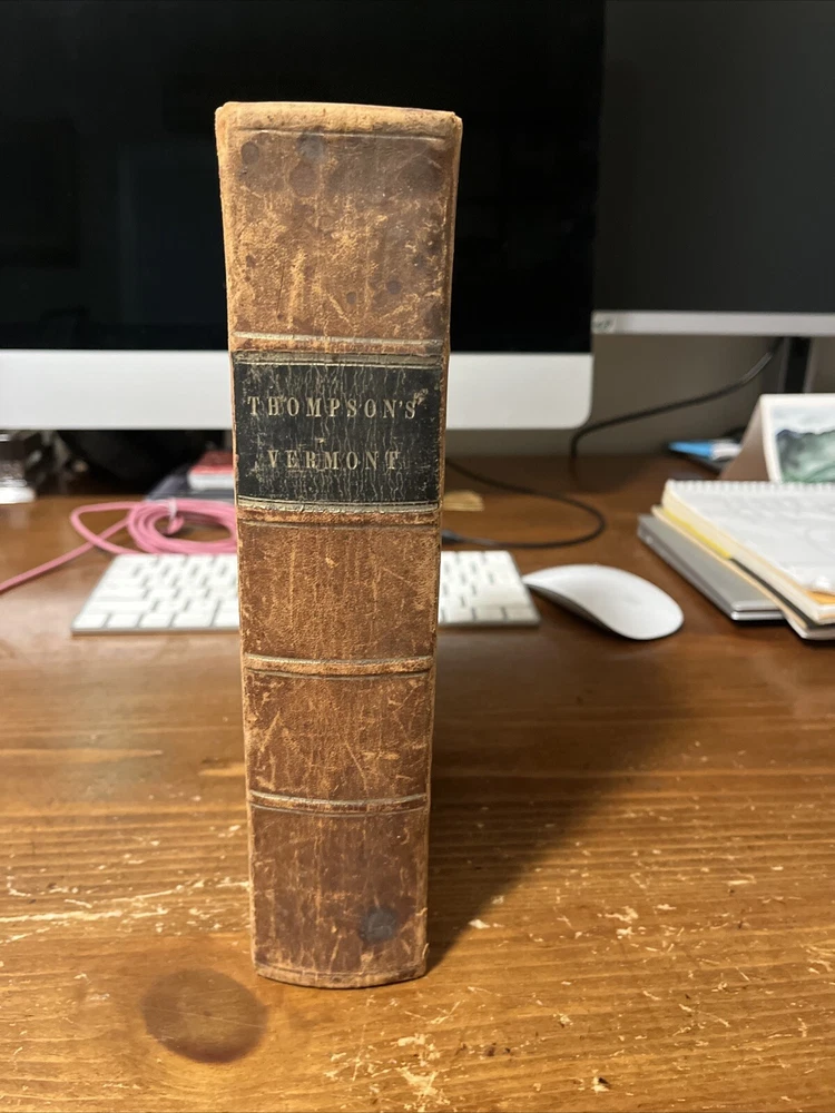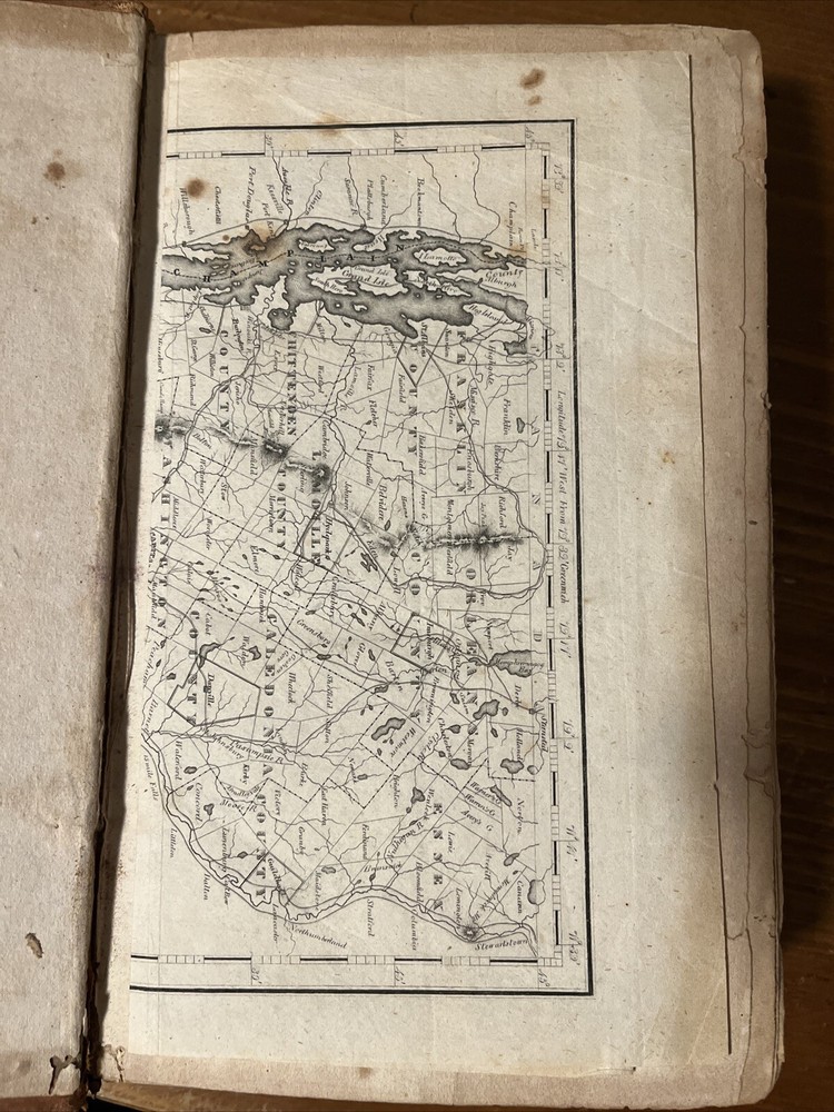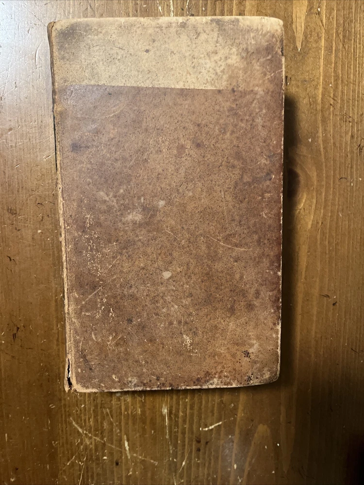 9.5 x 5.75 inches. Original leather binding in good plus condition; normal wear. Front board shows discoloration. Minor wear to title page. Fold out map nicely preserved with just a touch of foxing. Contents secure and clean. Nice collectible example.