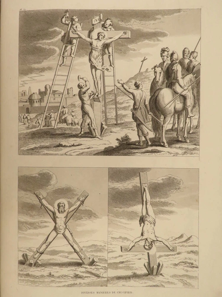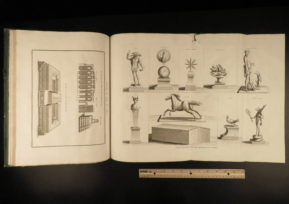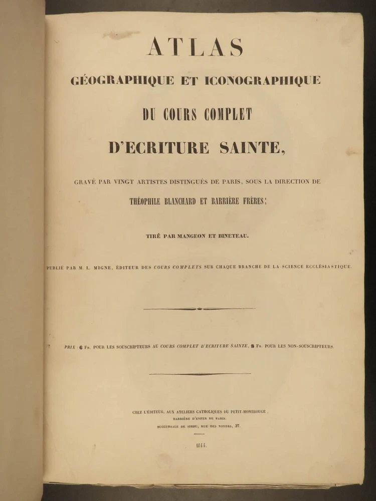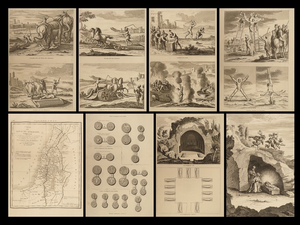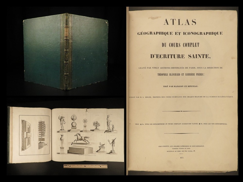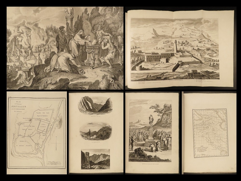 1844 Bible ATLAS Holy Land MAPS Egypt Israel Coins TORTURE Crucifixion Mandrake A rare and highly desirable 19 th -century atlas of all of the important locations in the Bible! Published in Paris in 1844, this enormous tome contains huge illustrations containing figures of biblical figures and locations such as the Ark of the Covenant, the temple at Jerusalem, and Mount Sinai. However, the most desired aspect of this book is the full-page maps – maps of Egypt, Israel, Canaan, Syria, and more. Other curious illustrations found in this book include views of: · Mandrake plant with human features · Torture scenes – o stoning, crucifixions, hangings, wagon crushing under iron spikes, burning at the stake, beheading, elephant trampling, flogging · Biblical era coins · Tombs and burial practices Item number: #21098 Price: $750 MIGNE, Jacques-Paul Atlas géographique et iconographique du Cours complet d'Écriture sainte [Paris]: chez l’editeur, 1844. Details : · Collation: Complete with all pages o 77 maps and engravings · Language: French · Binding: Leather; tight and secure · Size : ~15in X 11in (38cm x 28cm) Our Guarantee: Very Fast. Very Safe. Free Shipping Worldwide. Customer satisfaction is our priority! Notify us with 7 days of receiving, and we will offer a full refund without reservation! 21098