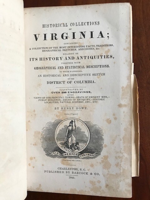 Historical Collections of Virginia; containing a Collection of the most Interesting Facts, Traditions, Biographical Sketches, Anecdotes, &c relating to Its History and Antiquities, together with Geographical and Statistical Descriptions. to which is appended An Historical and Descriptive Sketch of the District of Columbia By Henry Howe Published: Charleston, S.C. Babcock & Co, 1845. 544 pp. Hardcover in full leather binding. Includes folding map of the State of Virginia and Frontispiece of the Surrender of Cornwallis . Not Ex-Lib. I've done my best to describe the book, but if you have additional questions, please don't hesitate to send me an e-mail.