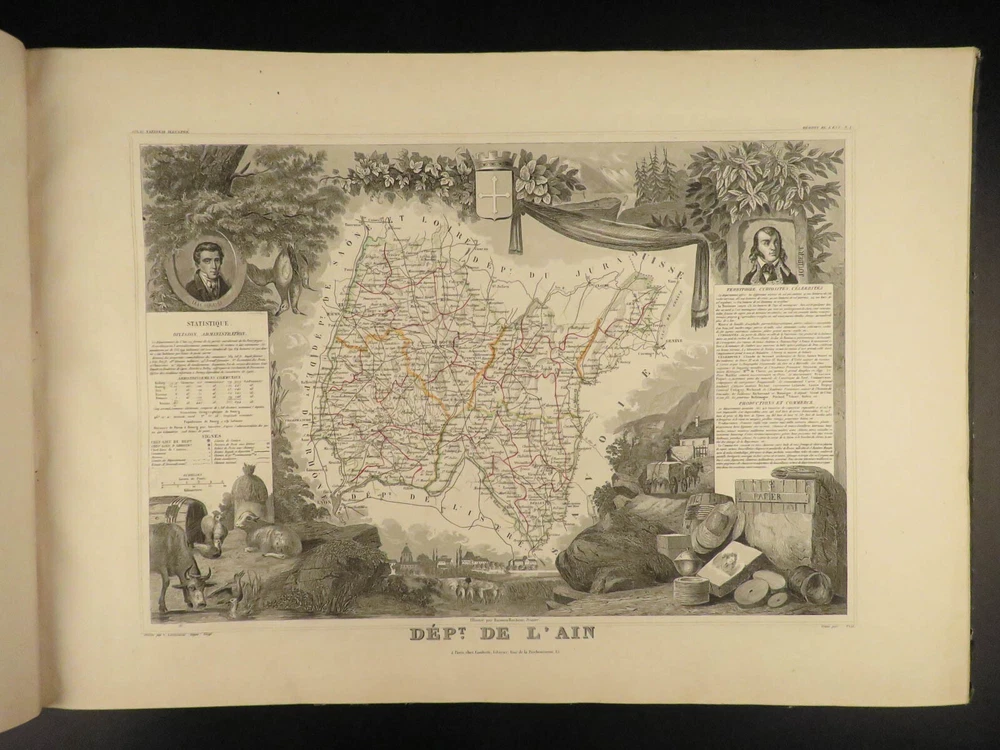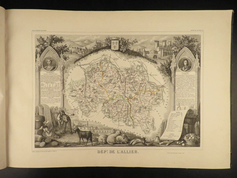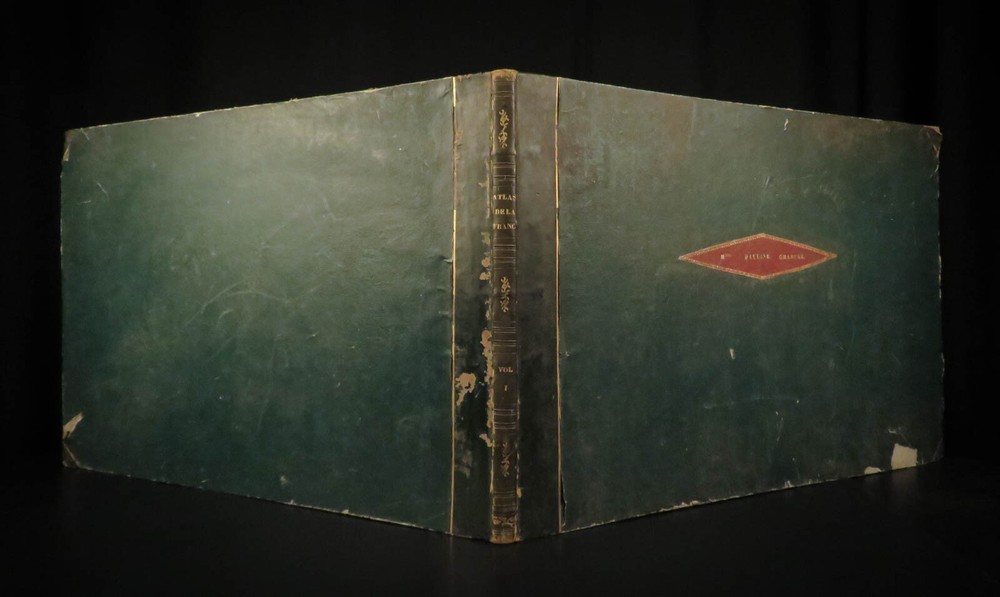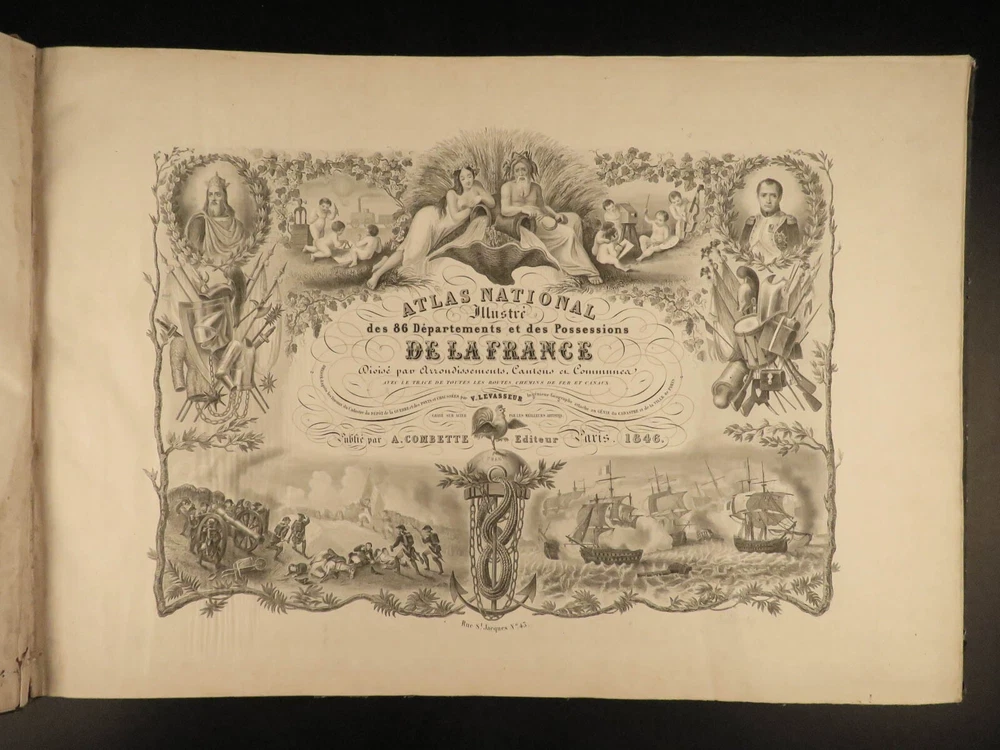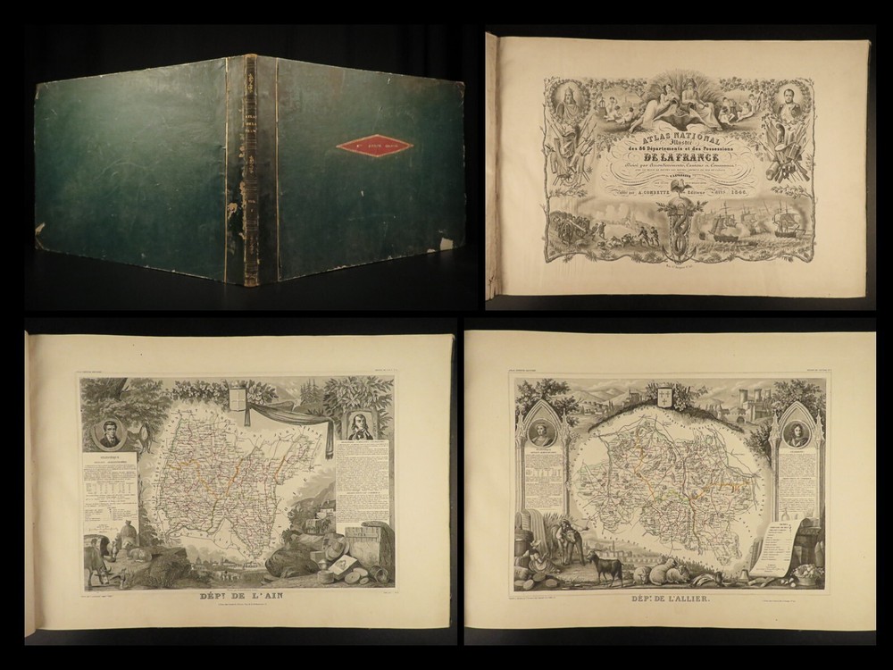 1846 1 ed HUGE French ATLAS 43 MAPS Illustrated Victor Lefasseur ENORMOUS France An absolutely enormous French atlas by Victor Levasseur! This huge, oblong atlas contains 43 fully-illustrated maps of various regions, cities, and counties from around France each decorated with exquisite decorated borders. Item number: #20847 Price: $795 LEVASSEUR, Victor Atlas national illustré des 86 départements et des possessions de la France divisé par arrondissements, cantons et communes Paris: publié par A. Combette Editeur, 1846. Details : · Collation: Complete with all pages; o 43 plates of maps, plus engraved title page · Provenance: Binding stamp – M lle . Pauline Charuel · Language: French · Binding: Leather; tight and secure · Size : ~15.25in X 22in (39cm x 56cm) Our Guarantee: Very Fast. Very Safe. Free Shipping Worldwide. Customer satisfaction is our priority! Notify us with 7 days of receiving, and we will offer a full refund without reservation! 20847