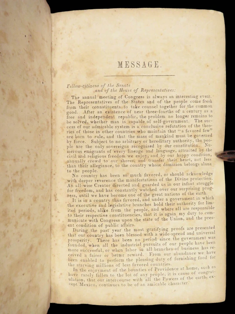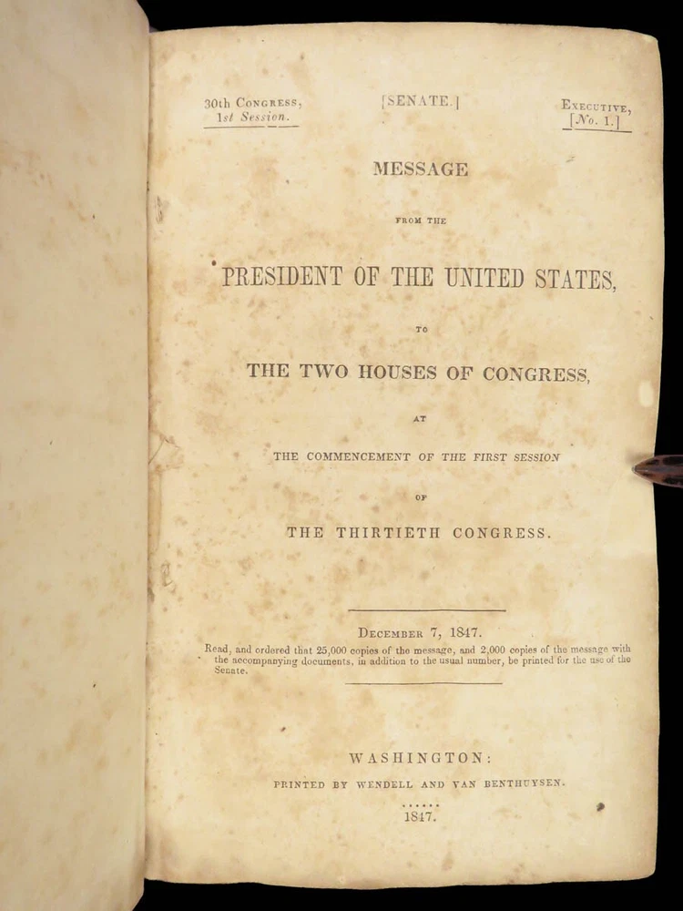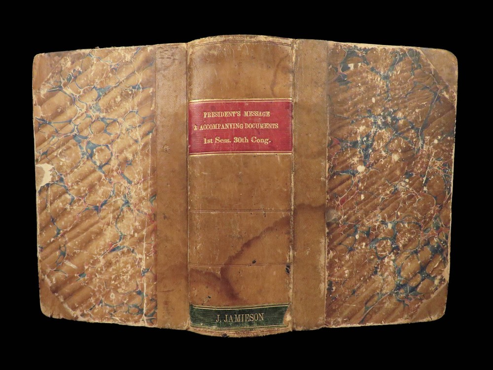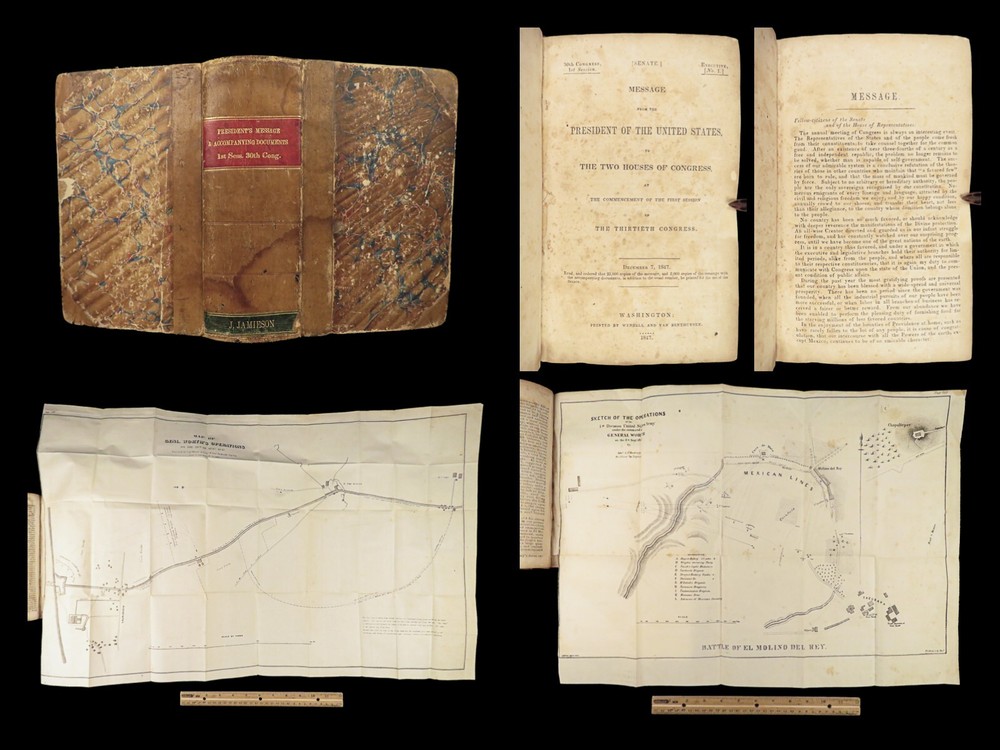 1847 TEXAS Mexico War 1 ed President James Polk Mexican Battle MAPS California An enormous 1847 first edition printing of ‘ Message from the President’ – a collection of speeches, American documents, charts, Army maps, soldier letters and correspondence, and much more! Written during the presidency of James K Polk and the Mexican-American War, this huge tome contains battle reports and the effects of the war on the United States itself. The maps found in this book make it highly desirable and valuable – the maps of battles in California and New Mexico are especially interesting. Item number: #24884 Price: $950 United States Message from the President to Congress at the commencement of the first session of the 30th Congress Washington: Printed by Wendell and Van B., 1847. First edition. Details : · Collation: Complete o 1369, [1], 249, [1] o 16 folding maps o 5 folding charts · References: Sabin 48113; Graff 1344. Wagner-Camp 133 · Provenance: Handwritten o Thos. A. Harris § Thomas Alexander Harris (1826–1895), a United States Army officer at the end of the Mexican–American War and a Missouri State Guard (Confederate) brigadier general during the early months of the American Civil War. He then became a prominent Confederate politician, serving in the First Confederate Congress from 1861 to 1864. Among other occupations, he was a Missouri State Representative before the Civil War and a Kentucky State Representative in 1885–1886. o Hon. John Jameson of Missouri § John Jameson (March 6, 1802 – January 24, 1857) was an American farmer, lawyer, and politician from Fulton, Missouri. He served as a captain in the militia during the Black Hawk War between April and August 1832 . He also held several local offices including member of the Missouri House of Representatives from 1830 to 1836 and the Speaker of the Missouri House of Representatives from 1834 to 1836; he also served in Congress for 3 nonconsecutive years. o Jno. E. Schley, Esq. · Language: English · Binding: Leather; tight and secure · Size : ~9in X 5.75in (23cm x 14.5cm) · Very rare and desirable Our Guarantee: Very Fast. Very Safe. Free Shipping Worldwide. Customer satisfaction is our priority! Notify us with 7 days of receiving, and we will offer a full refund without reservation! 24884