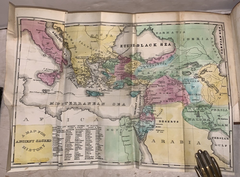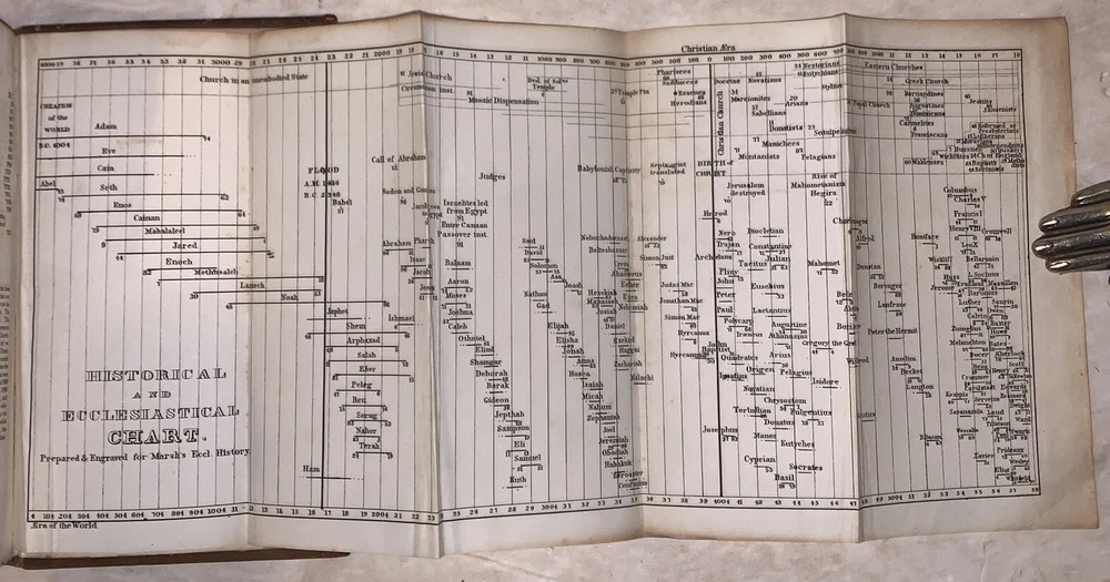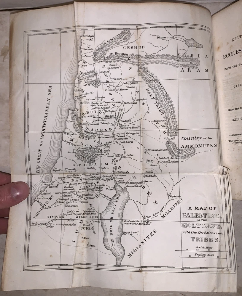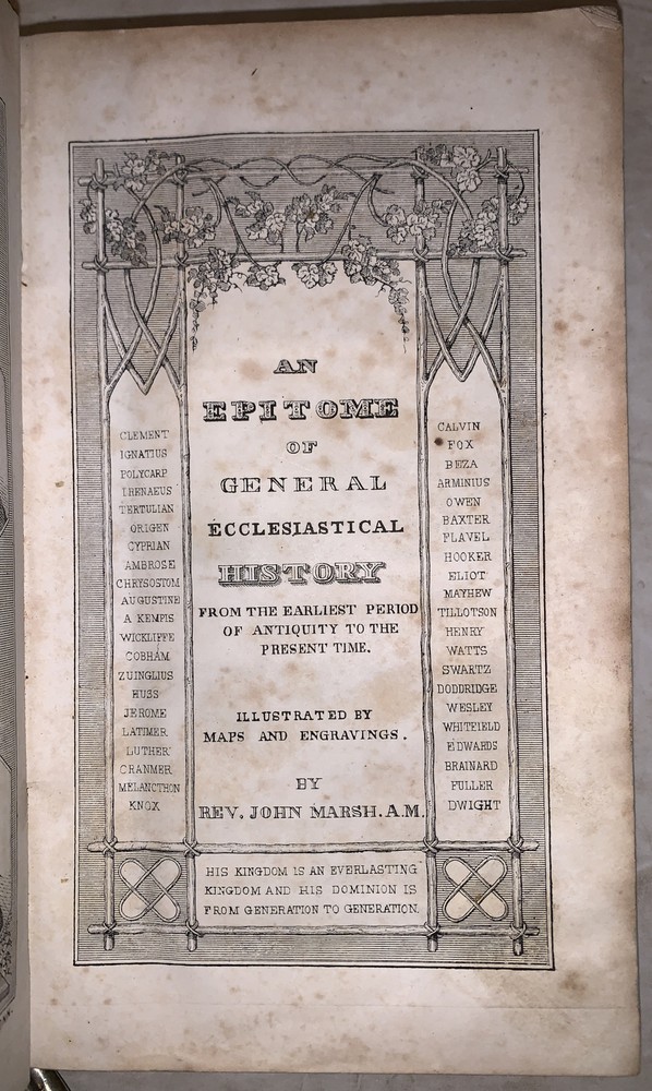 An Epitome of General Ecclesiastical History From the Earliest Period to the Present Time With an Appendix, Giving a Condensed History of the Jews From the Destruction of Jerusalem to the Present Day Illustrated by Maps and Engravings by Rev. John Marsh, Corresponding Secretary of the American Temperance Union Ninth Edition New York: J. Tilden and Co 1848 Octavo, 462 pages, original gilt lettered and blind stamped full leather. Illustrated with fold out maps, one of which is large and hand colored. Also illustrated in black and white. Marbled edges. Some rubbing and wear, minor foxing, scuffs, else in good + conidition. If you have any questions feel free to ask and don't forget to check out my other listings.