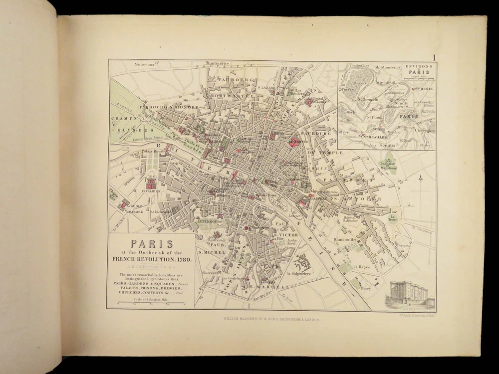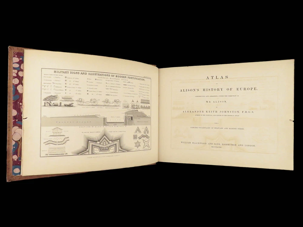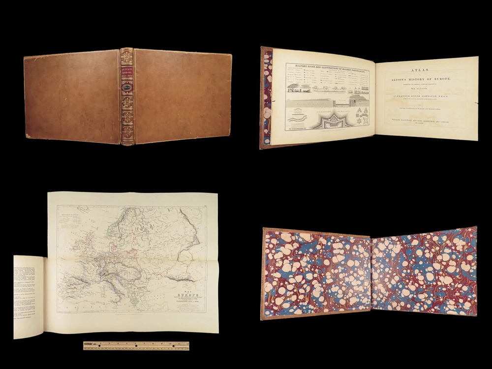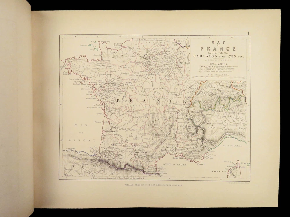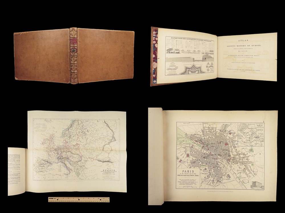 1848 ATLAS of Europe Alison 99 MAPS Napoleon Bonaparte French Revolution RARE Archibald Alison was a 19 th -century Scottish historian who is best remembered for his mammoth work ‘ History of Europe’ . This book covered European history surrounding the events leading to and following the French Revolution. This set been called “a wealth of information” and is one of the best accounts of the effects of Napoleon and the Napoleonic wars on the rest of Europe . Alexander Keith Johnston’s ‘ Atlas’ was an important supplement to Alison’s “ History of Europe ” and contains more than 90 hand-colored maps covering the French Revolution through the battles of the Napoleonic Wars in 1815. Item number: #27427 Price: $750 ALISON, Archibald Atlas to Alison's History of Europe Edinburgh ; London : William Blackwood & Sons, 1848. First edition. Details : · Collation: Complete with all pages o 16 o 99 maps and plans, plus engraved frontispiece § Note: #57 does not exist, as per table of contents · Language: English · Binding: Leather; tight and secure · Size: ~8.75in X 11in (22cm x 28cm) Our Guarantee: Very Fast. Very Safe. Free Shipping Worldwide. Customer satisfaction is our priority! Notify us with 7 days of receiving, and we will offer a full refund without reservation!