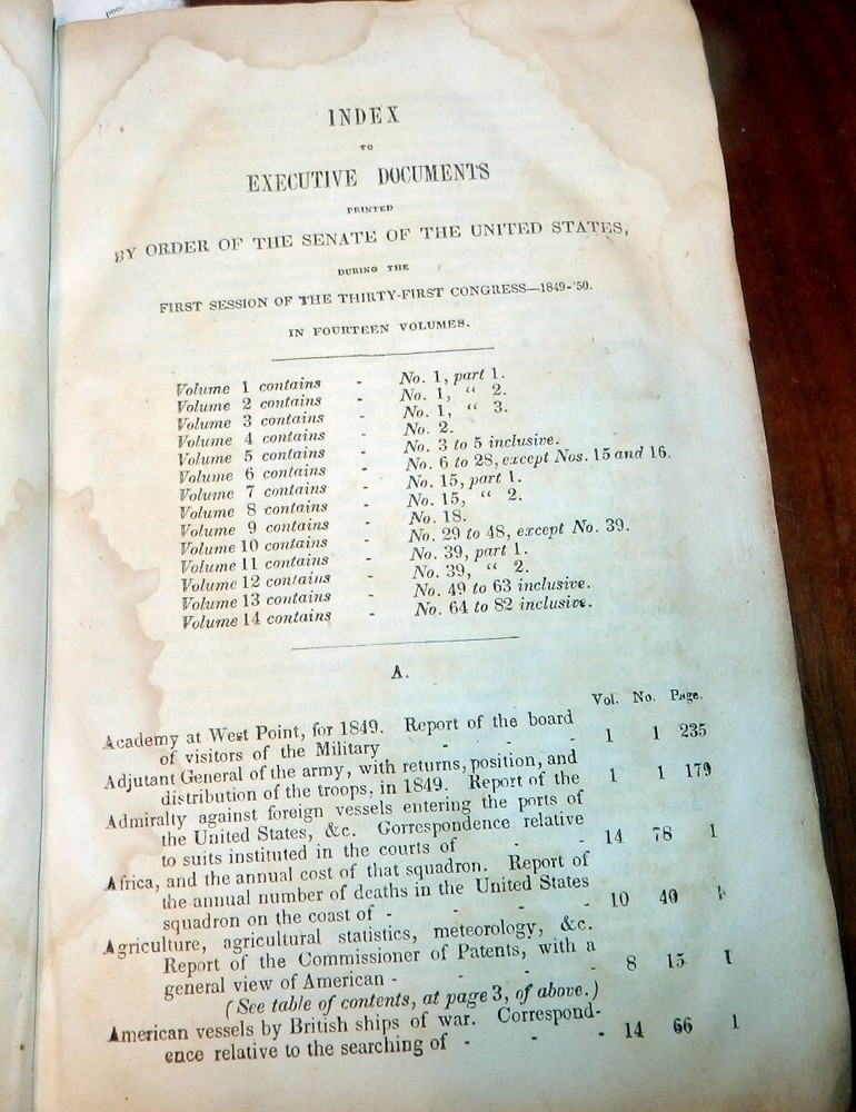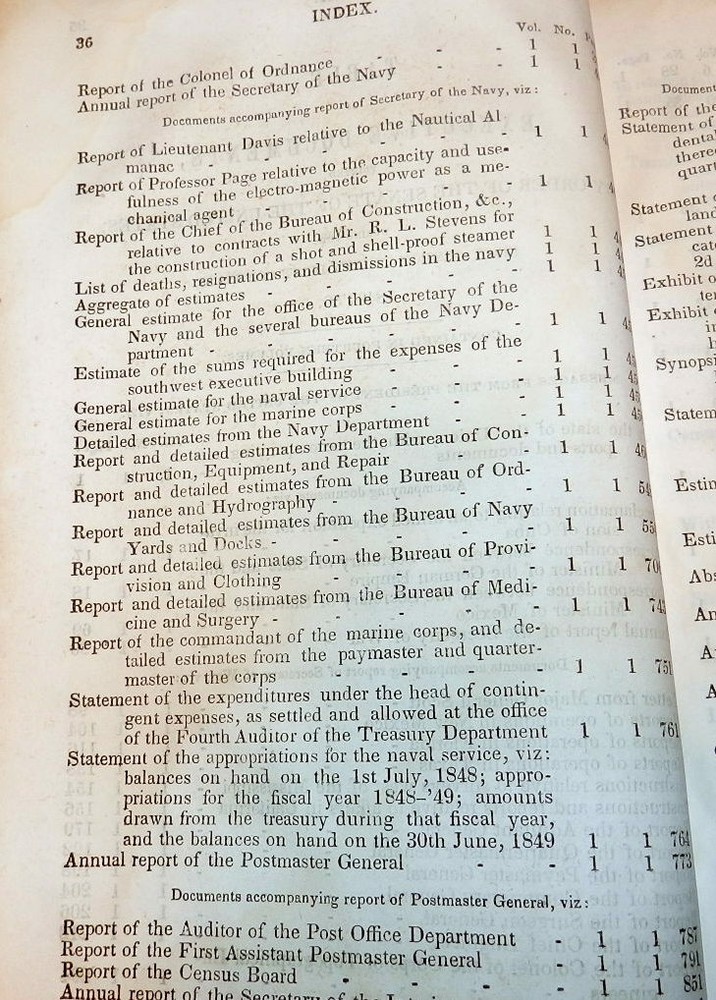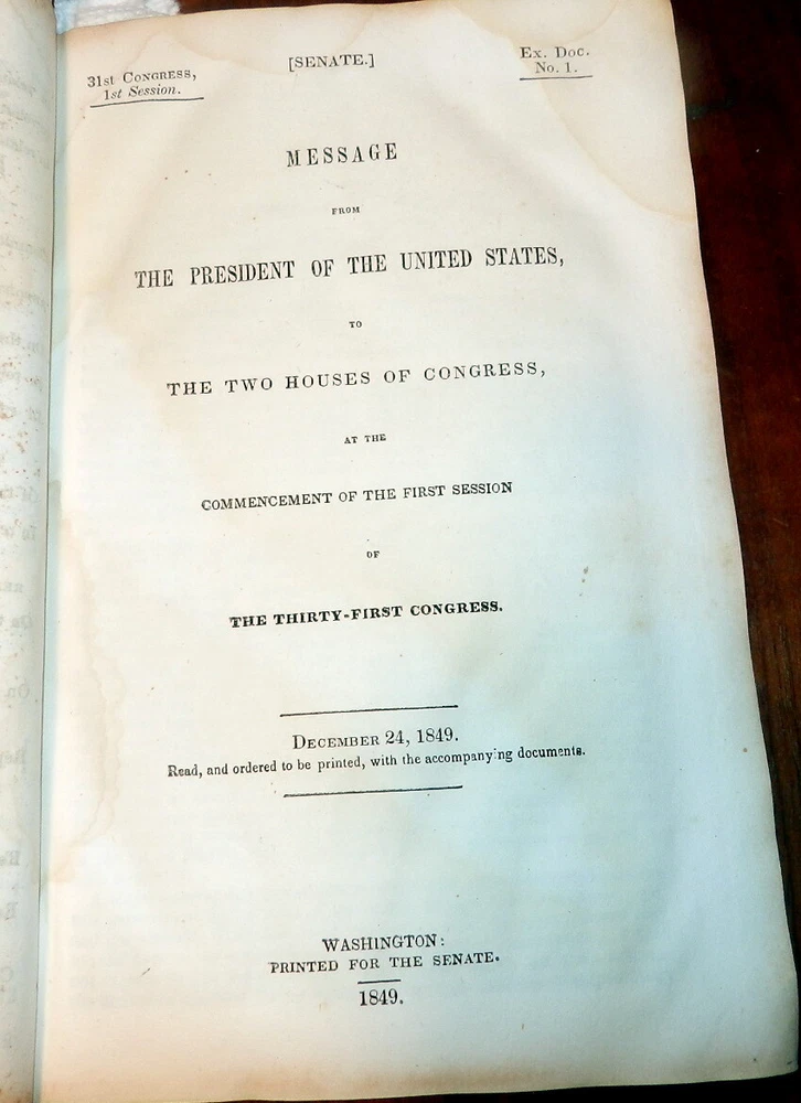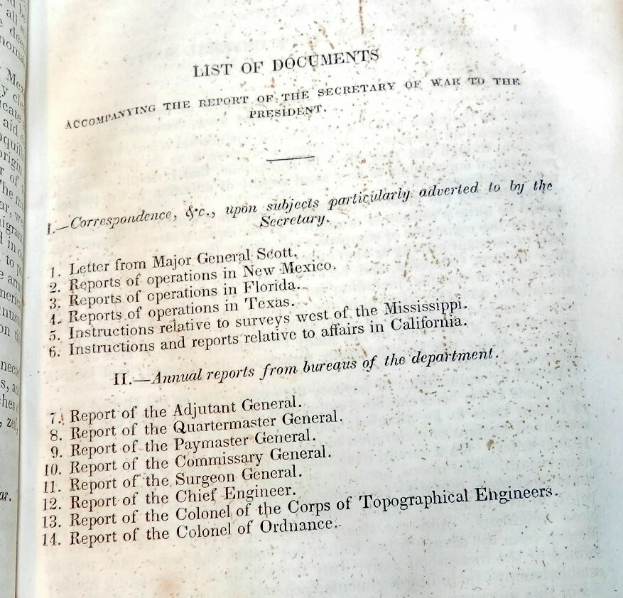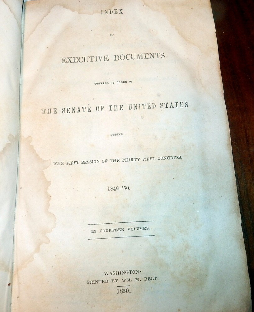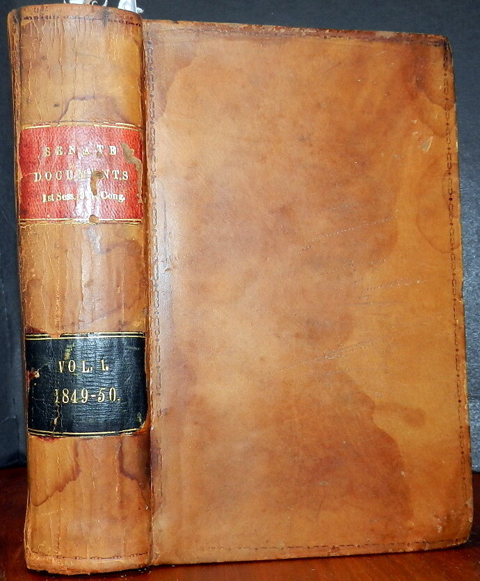 1849 1st Navajo Treaty. Napoleon Arkansas Map, Military Ops in Texas, NM, FL, CA 1849 1st Navajo Treaty. Napoleon Arkansas Map, Military Ops in Texas, NM, FL, CA EXECUTIVE DOCUMENTS SENATE OF THE UNITED STATES First Session of the Thirty-First Congress Volume 1 MESSAGE OF THE PRESIDENT OF THE UNITED STATES TO THE TWO HOUSES OF CONGRESS AT THE COMMENCEMENT OF THE FIRST SESSION OF THE THIRTY FIRST CONGRESS DRCEMBER 24, 1849 BOUND WITH Index to executive documents printed by order of the Senate of the United States during the first session of the thirty-first Congress, 1849-'50. Washington, printed for the Senate, 1849. Original edition. [The Index at the beginning was published separately after the 1st Session ended. It was printed by Wm. M. Belt, in 1850.] Hardcover. Full sheepskin, red and black spine labels with gilt titles, thick octavo, 43 + 851 pages, folding tables, 1 map, 3 (of 7) plates (ordnance). An important document first printed in this volume, is the first treaty between the Navajo nation and the United States, signed in 1849. The folding map (1 mile to an inch) is entitled “Sketch of the township including Napoleon and the circumjacent country / drawn from the records of the land office at HELENA” [Napoleon was a river port town in Desha County, Arkansas, United States, from the 1820s until 1874. It was situated at the confluence of the Arkansas and Mississippi rivers. Once the county seat, Napoleon's fate was sealed when in 1863, a channel was cut through the soft land that directed the river waters toward the town. Napoleon was finally deserted and the county seat moved in 1874 when the banks of the Mississippi River overflowed and destroyed much of what remained of the once-thriving river port town.] In Life on the Mississippi, Mark Twain tells us that he was already "in a pretty sour humor," before he ascended to the hurricane deck and told Captain McCord, "I have come to say good-bye, captain, I wish to go ashore at Napoleon." The captain glanced up at the pilothouse and said, "He wants to get off at Napoleon! Why, hang it, don't you know? There isn't any Napoleon any more. Hasn't been for years and years. The Arkansas River burst through it, tore it all to rags and emptied it into the Mississippi!" Twain reports being flabberghasted. "Carried the whole town away? - banks, churches, jails, newspaper offices, courthouse theater, fire department, livery stable - everything?" "Everything" came the reply, "Didn't leave hide nor hair, shred nor shingle of it, except the fag-end of a shanty and one brick chimney. This boat is paddling along right now where the dead-center of that town used to be; yonder is the brick chimney - all that's left of Napoleon. . ." What Twain then squinted at was the debris of a long history that included la Salle's participation in America's first Catholic mass; an aristocratic French officer in self-imposed exile from Napoleon Bonaparte's stillborn empire; the wanderings of naturalist Thomas Nuttall; the Trail of Tears; the flames of Sherman's army; and the irreversible decay of the riverbank precipitated by the Civil War. (From "Death Comes For Napoleon" by Mitch Gould; DCHS journal, "River Towns, River Boats, River People" Spring, 1977) The main contents of this volume are: Index to executive documents printed by order of the Senate of the United States during the first session of the thirty-first Congress, 1849-'50. Message from the President of the United States 0n the state of the Union, with the accompanying reports and documents Accompanying documents, viz: Proclamation relating to an armed expedition for the invasion of cuba Correspondence between the Secretary of State and the Minister of the German Empire Correspondence between the Secretary of State and the Minister of Mexico Annual report of the Secretary of War Documents accompanying report of Secretary of War, viz: Letter from Major General Scott Reports of operations in New Mexico Reports of operations in Florida Reports of operations in Texas Instructions relative to surveys west of the Mississippi Instructions and reports relative to affairs in California Report of the Adjutant General Report of the Quartermaster General Report of the Paymaster General Report of the Commissary General Report of the Surgeon General Report of the Chief Engineer Report of the Colonel of the Corps of Topographical Engineers Report of the Colonel of Ordnance Annual report of the Secretary of the Navy Documents accompanying report of Secretary of the Navy, viz: Report of Lieutenant Davis relative to the Nautical Almanac Report of Professor Page relative to the. capacity and usefulness of the electro-magnetic power as a mechanical agent Report of the Chief of the Bureau of Construction, &ct, relative to contracts with Mr. R. L. Stevens for the construction of а shot and shell~proof steamer List of deaths, resignations, and dismissions in the navy Aggregate of estimates General estimate for the office of the Secretary of the Navy and the several bureaus of the Navy Department Estimate of the sums required for the expenses of the southwest executive building General estimate for the naval service General estimate for the marine corps Detailed estimates from the Navy Department Report and detailed estimates from the Bureau of Construction, Equipment, and Repair Report and detailed estimates from the Bureau of Ordnance and Hydrography Report and detailed estimates from the Bureau of Navy Yards and Docks Report and detailed estimates from the Bureau of Provision and Clothing Report and detailed estimates from the Bureau of Medicine and Surgery Report of the commandant of the marine corps, and detailed estimates from the paymaster and quarter-master of the corps Statement of the expenditures under the head of contingent expenses, as settled and allowed at the office of the Fourth Auditor of the Treasury Department Statement of the appropriations for the naval service, viz: balances on hand on the 1st Ju