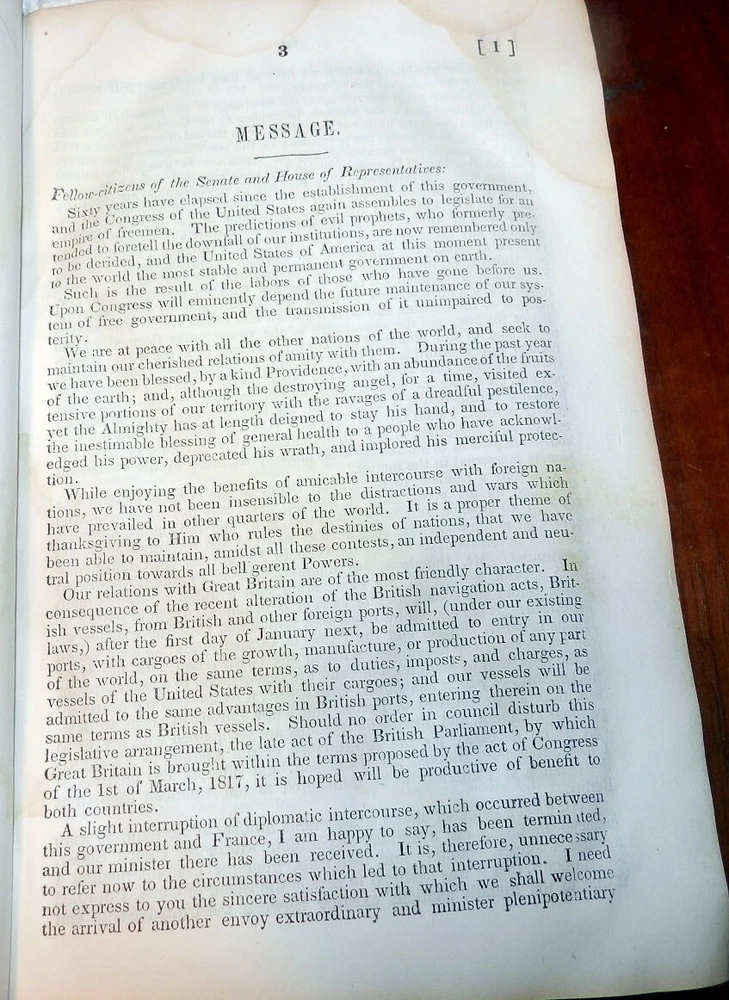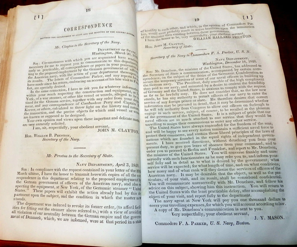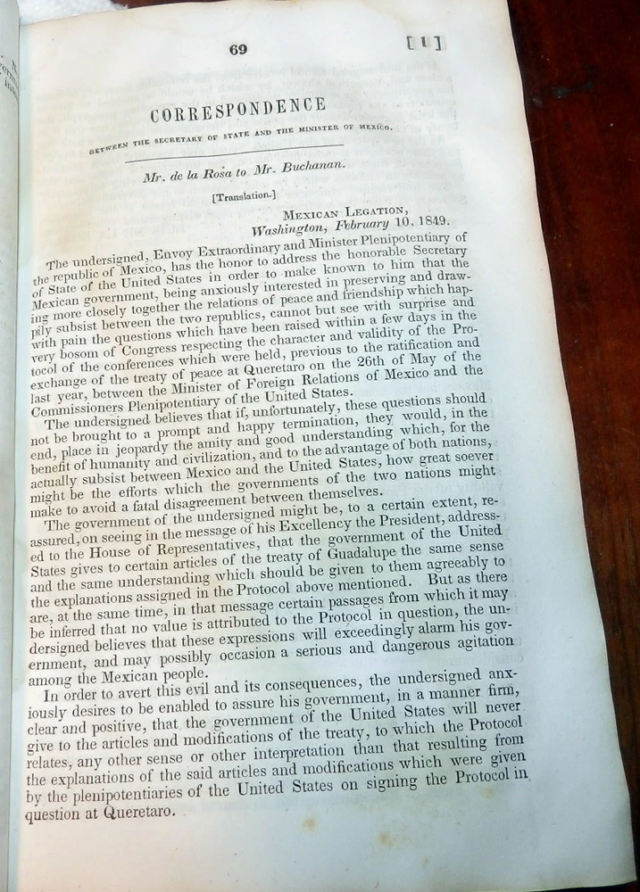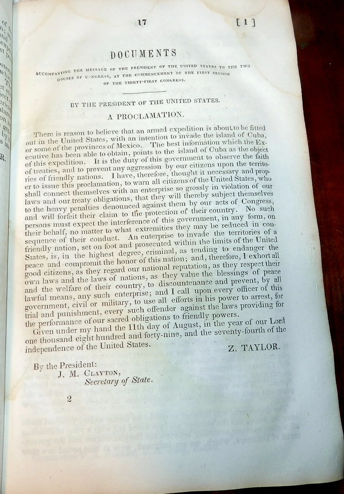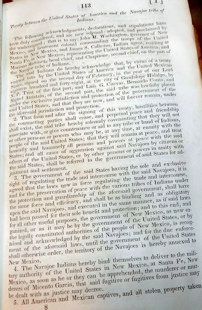 1849 1st Navajo Treaty. Napoleon Arkansas Map, Military Ops in Texas, NM, FL, CA 1849 1st Navajo Treaty. Napoleon Arkansas Map, Military Ops in Texas, NM, FL, CA EXECUTIVE DOCUMENTS SENATE OF THE UNITED STATES First Session of the Thirty-First Congress Volume 1 MESSAGE OF THE PRESIDENT OF THE UNITED STATES TO THE TWO HOUSES OF CONGRESS AT THE COMMENCEMENT OF THE FIRST SESSION OF THE THIRTY FIRST CONGRESS DRCEMBER 24, 1849 BOUND WITH Index to executive documents printed by order of the Senate of the United States during the first session of the thirty-first Congress, 1849-'50. Washington, printed for the Senate, 1849. Original edition. [The Index at the beginning was published separately after the 1st Session ended. It was printed by Wm. M. Belt, in 1850.] Hardcover. Full sheepskin, red and black spine labels with gilt titles, thick octavo, 43 + 851 pages, folding tables, 1 map, 3 (of 7) plates (ordnance). An important document first printed in this volume, is the first treaty between the Navajo nation and the United States, signed in 1849. The folding map (1 mile to an inch) is entitled “Sketch of the township including Napoleon and the circumjacent country / drawn from the records of the land office at HELENA” [Napoleon was a river port town in Desha County, Arkansas, United States, from the 1820s until 1874. It was situated at the confluence of the Arkansas and Mississippi rivers. Once the county seat, Napoleon's fate was sealed when in 1863, a channel was cut through the soft land that directed the river waters toward the town. Napoleon was finally deserted and the county seat moved in 1874 when the banks of the Mississippi River overflowed and destroyed much of what remained of the once-thriving river port town.] In Life on the Mississippi, Mark Twain tells us that he was already "in a pretty sour humor," before he ascended to the hurricane deck and told Captain McCord, "I have come to say good-bye, captain, I wish to go ashore at Napoleon." The captain glanced up at the pilothouse and said, "He wants to get off at Napoleon! Why, hang it, don't you know? There isn't any Napoleon any more. Hasn't been for years and years. The Arkansas River burst through it, tore it all to rags and emptied it into the Mississippi!" Twain reports being flabberghasted. "Carried the whole town away? - banks, churches, jails, newspaper offices, courthouse theater, fire department, livery stable - everything?" "Everything" came the reply, "Didn't leave hide nor hair, shred nor shingle of it, except the fag-end of a shanty and one brick chimney. This boat is paddling along right now where the dead-center of that town used to be; yonder is the brick chimney - all that's left of Napoleon. . ." What Twain then squinted at was the debris of a long history that included la Salle's participation in America's first Catholic mass; an aristocratic French officer in self-imposed exile from Napoleon Bonaparte's stillborn empire; the wanderings of naturalist Thomas Nuttall; the Trail of Tears; the flames of Sherman's army; and the irreversible decay of the riverbank precipitated by the Civil War. (From "Death Comes For Napoleon" by Mitch Gould; DCHS journal, "River Towns, River Boats, River People" Spring, 1977) The main contents of this volume are: Index to executive documents printed by order of the Senate of the United States during the first session of the thirty-first Congress, 1849-'50. Message from the President of the United States 0n the state of the Union, with the accompanying reports and documents Accompanying documents, viz: Proclamation relating to an armed expedition for the invasion of cuba Correspondence between the Secretary of State and the Minister of the German Empire Correspondence between the Secretary of State and the Minister of Mexico Annual report of the Secretary of War Documents accompanying report of Secretary of War, viz: Letter from Major General Scott Reports of operations in New Mexico Reports of operations in Florida Reports of operations in Texas Instructions relative to surveys west of the Mississippi Instructions and reports relative to affairs in California Report of the Adjutant General Report of the Quartermaster General Report of the Paymaster General Report of the Commissary General Report of the Surgeon General Report of the Chief Engineer Report of the Colonel of the Corps of Topographical Engineers Report of the Colonel of Ordnance Annual report of the Secretary of the Navy Documents accompanying report of Secretary of the Navy, viz: Report of Lieutenant Davis relative to the Nautical Almanac Report of Professor Page relative to the. capacity and usefulness of the electro-magnetic power as a mechanical agent Report of the Chief of the Bureau of Construction, &ct, relative to contracts with Mr. R. L. Stevens for the construction of а shot and shell~proof steamer List of deaths, resignations, and dismissions in the navy Aggregate of estimates General estimate for the office of the Secretary of the Navy and the several bureaus of the Navy Department Estimate of the sums required for the expenses of the southwest executive building General estimate for the naval service General estimate for the marine corps Detailed estimates from the Navy Department Report and detailed estimates from the Bureau of Construction, Equipment, and Repair Report and detailed estimates from the Bureau of Ordnance and Hydrography Report and detailed estimates from the Bureau of Navy Yards and Docks Report and detailed estimates from the Bureau of Provision and Clothing Report and detailed estimates from the Bureau of Medicine and Surgery Report of the commandant of the marine corps, and detailed estimates from the paymaster and quarter-master of the corps Statement of the expenditures under the head of contingent expenses, as settled and allowed at the office of the Fourth Auditor of the Treasury Department Statement of the appropriations for the naval service, viz: balances on hand on the 1st Ju