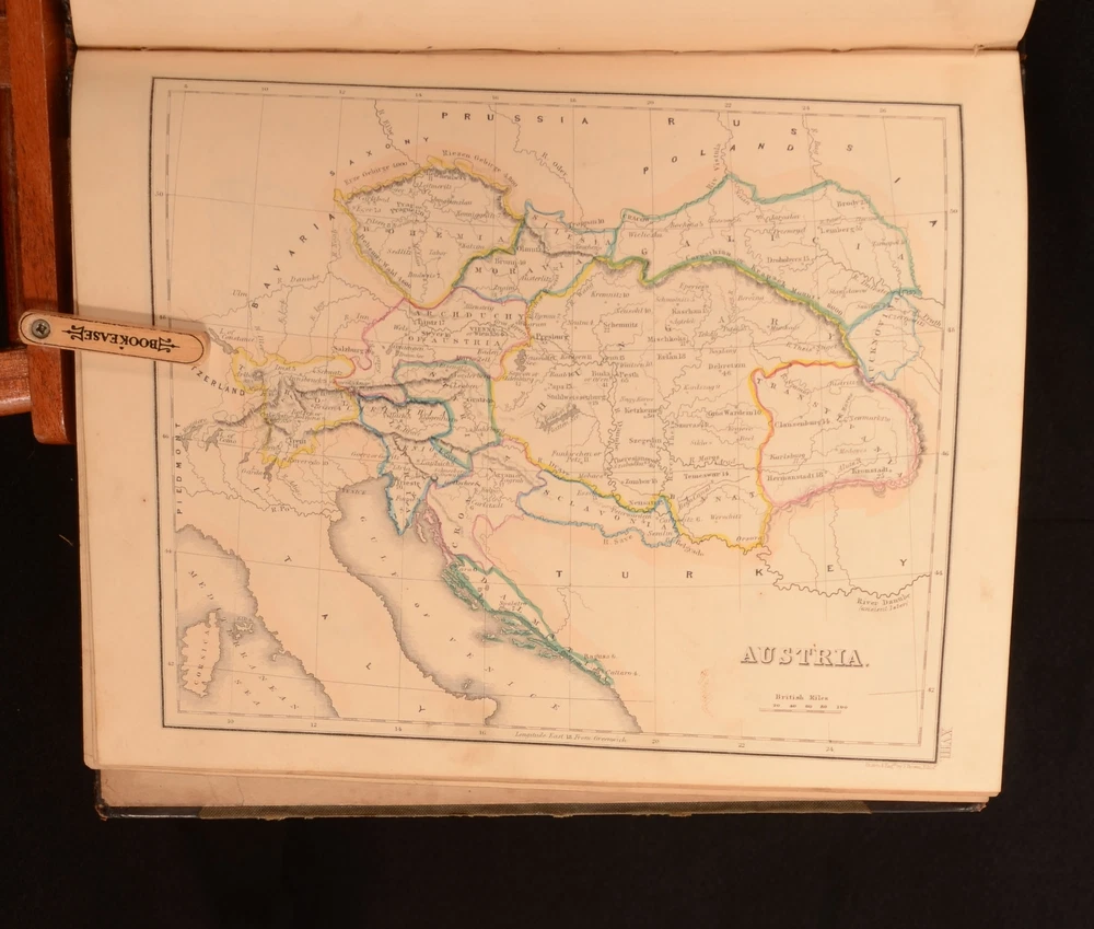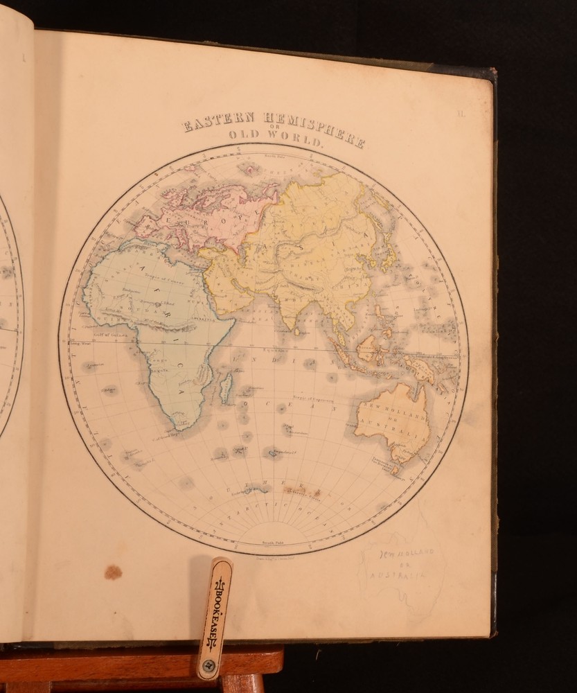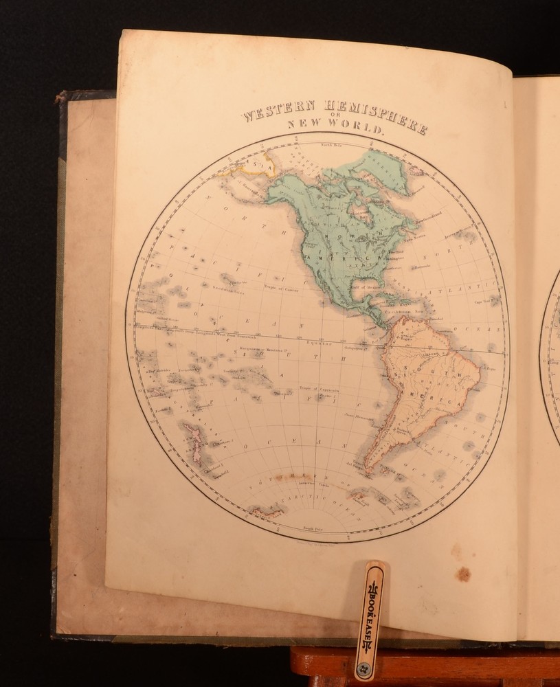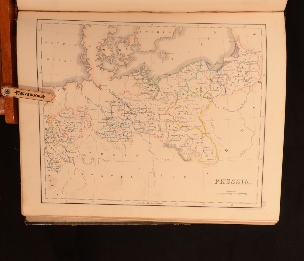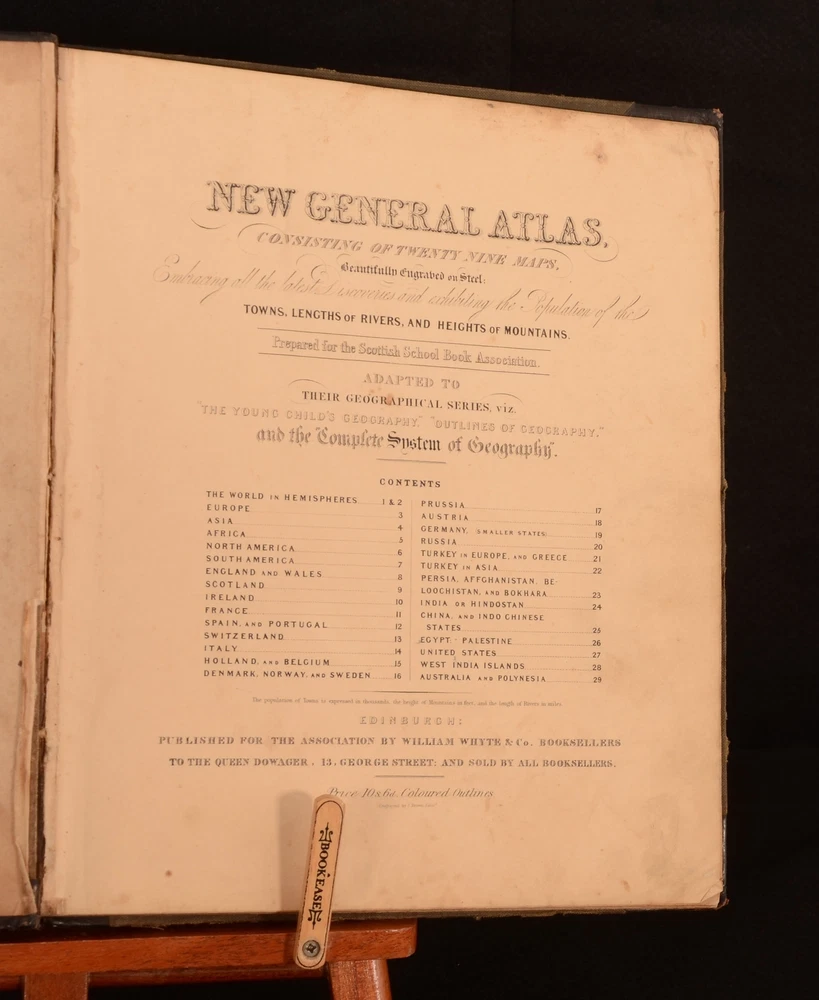 Click here to see our other books! New General Atlas, Consisting of Twenty-Nine Maps. Beautifully Engraved on Steel: Embracing all the Latest DIscoveries and Exhibiting the Population of the Towns, Lengths of Rivers, and Heights of Mountains. Prepared for the Scottish School Book Association. Adapted to their Geographical Series, vis. 'The Young Child's Geography', 'Outlines of Geography', and the Complete System of Geography'. Not Stated 1850 William Whyte : Edinburgh 12" by 9.5" [60pp] SUMMARY A very scarce coloured atlas, with important statistical information, comprising of twenty-nine maps. Colour Plates,Illustrated,Leather Binding,Very Scarce Overall Condition: Good This book weighs 0.75 KG when packed UK Postage: £ 3.99 US Postage: £ 19.99 EU Postage : £ 15.99 European Postage: £ 16.99 Asia Postage: £ 21.99 Worldwide Postage: £ 25.99 DESCRIPTION A very scarce work. A complete atlas, illustrated with twenty-nine coloured maps. The work shows the entire world, as well as giving information on the population of towns, the height of mountains, and the length of rivers. Engraved by a J. Brown. This is possibly Joseph Brown, an English engraver who first exhibited at the Royal Academy in 1833. He used both stipple and line for his engravings, and worked from paintings by artists such as John Hayter, John Opie, George Perfect Harding, and George Romney. Undated, dated from Copac from a copy held at the National Library of Scotland. Collected, complete. CONDITION In the original half calf binding with cloth to the boards. Externally, with some marks and rubbing to the boards. Spine is lifting a little to the tail of the front joint. Hinges are strained. Internally, firmly bound. Pages are bright with some scattered spotting. Overall Condition: Good GLOSSARY OF TERMS Overall Condition (Dustwrapper condition rating is shown after that for the book itself, where a dustwrapper is present) Fine - Very well preserved copy showing very little wear Very Good Indeed - Only one or two minor faults, really a very attractive copy Very Good - Quite a wide term meaning no major faults but probably several smaller ones often expected given the age of the book, but still a respectable copy Good - Meaning not very good. Some more serious faults as will be described in the condition report under 'condition' Good Only - Meaning one or more faults that could really do with repair Fair - As with good only above but with other faults leaving a compromised copy even after repair Poor - Really bad and possibly seriously incomplete. We only sell books in this condition where their rarity or value makes them attractive none the less. Major defects will be described. GUARANTEE We offer a full money back guarantee on our descriptions. Please ask for details and conditions. We prefer PAYPAL. If you pay via PAYPAL we will post the item off the same or the next working day with the postage you have selected. Please note we cannot accept USD cheques