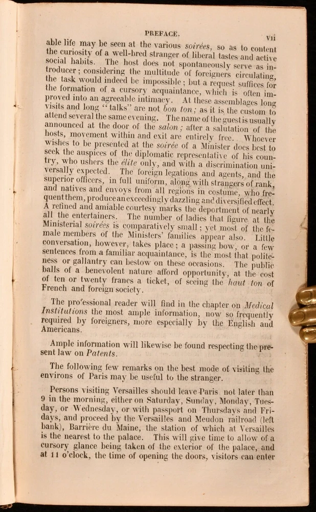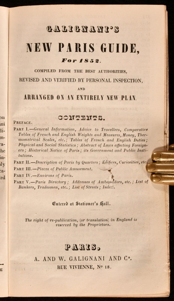 Click here to see our other books! Calignani's New Paris Guide for 1852 John Anthony Galignani; William Calignani 1852 A. and W. Calignani : Paris 4.5" by 7" ix [2], 2-624 [1], ii-xii pp SUMMARY Illustrated with two folding maps and a number of engraved plates, this is a charming mid eighteenth century tourist's guide to Paris. First Edition,Folding Maps,Illustrated,Leather Binding Overall Condition: Very Good This book weighs 0.5 KG when packed UK Postage: £ 3.99 US Postage: £ 15.99 EU Postage : £ 13.99 European Postage: £ 14.99 Asia Postage: £ 18.99 Worldwide Postage: £ 19.99 DESCRIPTION The 1852 edition of the Calignani brothers' guide to Paris, a work published annually throughout the nineteenth century, 'compiled by the best authorities'. The first edition thus, illustrated with eighteen engraved plates, and two folding maps. Collated, complete. Divided into four parts, with sections dedicated to general information, descriptions of the city by quarter, places of public amusement, and useful information including the addresses of tradesmen, bankers and embassies. With the bookplate of John E. Page to the front pastedown. A charming guide to mid nineteenth century Paris. CONDITION In a full morocco binding. Rubbing to back strip head and tail, with losses to leather here and to the raised bands of the back strip. Bookplate to front pastedown. Internally, firmly bound. Pages generally clean and bright, with the odd light spot. Overall Condition: Very Good GLOSSARY OF TERMS Overall Condition (Dustwrapper condition rating is shown after that for the book itself, where a dustwrapper is present) Fine - Very well preserved copy showing very little wear Very Good Indeed - Only one or two minor faults, really a very attractive copy Very Good - Quite a wide term meaning no major faults but probably several smaller ones often expected given the age of the book, but still a respectable copy Good - Meaning not very good. Some more serious faults as will be described in the condition report under 'condition' Good Only - Meaning one or more faults that could really do with repair Fair - As with good only above but with other faults leaving a compromised copy even after repair Poor - Really bad and possibly seriously incomplete. We only sell books in this condition where their rarity or value makes them attractive none the less. Major defects will be described. GUARANTEE We offer a full money back guarantee on our descriptions. Please ask for details and conditions. We prefer PAYPAL. If you pay via PAYPAL we will post the item off the same or the next working day with the postage you have selected. Please note we cannot accept USD cheques