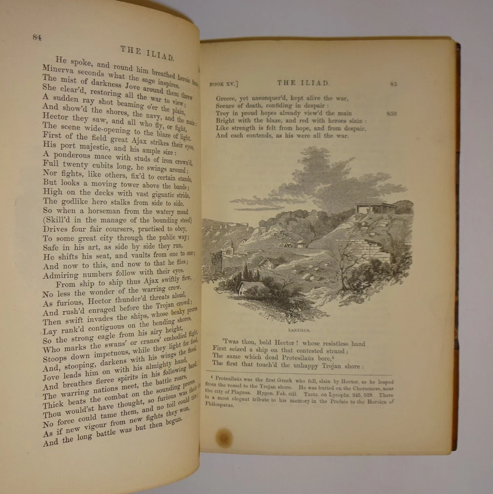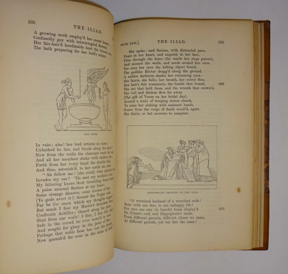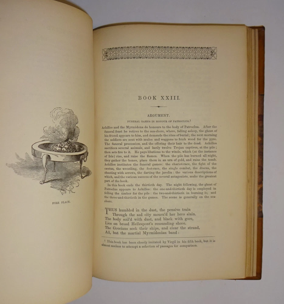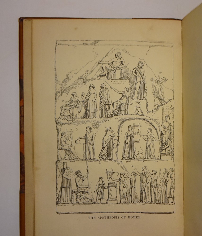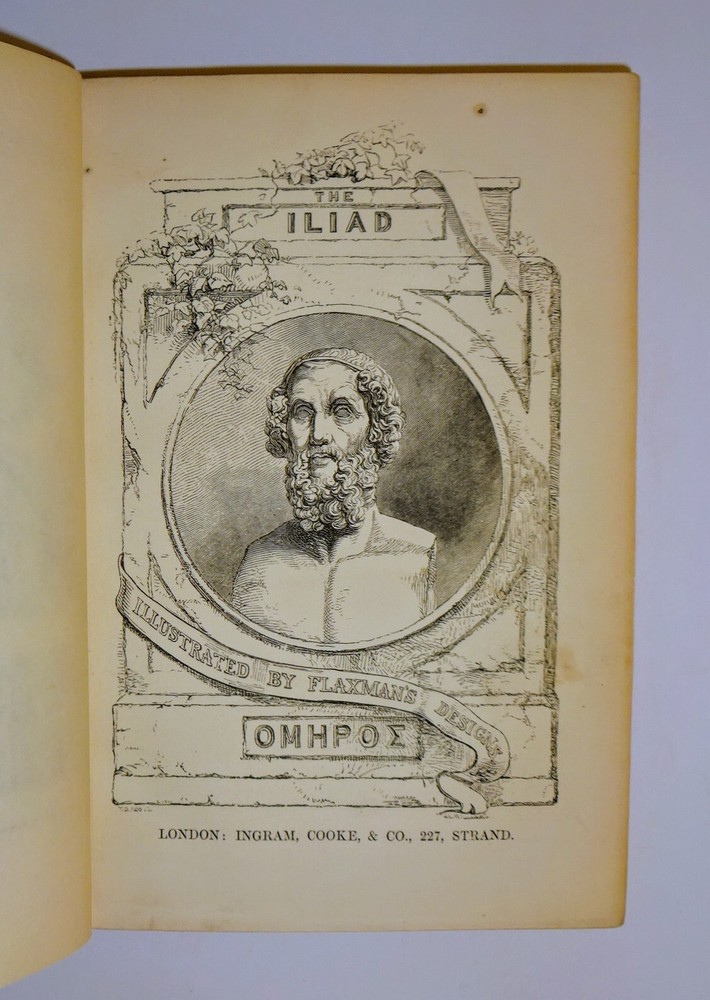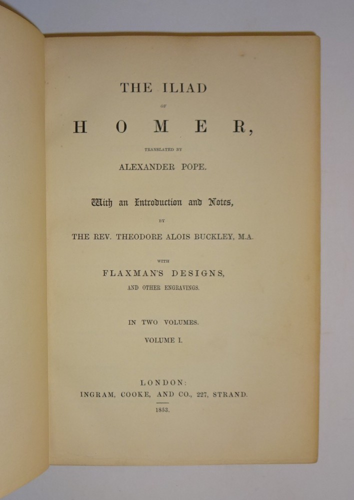 This is a handsome, custom fine binding set of "The Iliad of Homer" (complete in two volumes) together with "The Odyssey of Homer" (complete in one volume). 1853; Ingram, Cooke, and Co.; London. Alexander Pope translation. Each volume contains an illustrated title page, a frontispiece (with tissue guard), illustrations by John Flaxman, and "other engravings"; Volume I of The Iliad also contains a full-page map titled "Plain of Troy." This set has been beautifully bound by London bookbinder "Root & Son" in three-quarter leather with marbled covers and end papers, gilt top page edges, ribbon page markers, and a decorative gilt spine with five raised bands. With an Introduction and Notes by the Rev. Theodore Alois Buckley.